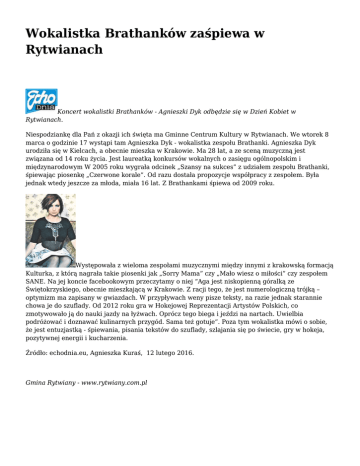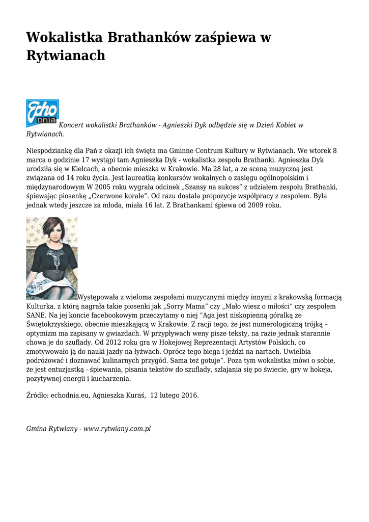 Wokalistka Brathanków zaśpiewa w Rytwianach Koncert wokalistki Brathanków - Agnieszki Dyk odbędzie się w Dzień Kobiet w Rytwianach. Niespodziankę dla Pań z okazji ich święta ma Gminne Centrum Kultury w Rytwianach. We wtorek 8 marca o godzinie 17 wystąpi tam Agnieszka Dyk - wokalistka zespołu Brathanki. Agnieszka Dyk urodziła się w Kielcach, a obecnie mieszka w Krakowie. Ma 28 lat, a ze sceną muzyczną jest związana od 14 roku życia. Jest laureatką konkursów wokalnych o zasięgu ogólnopolskim i międzynarodowym W 2005 roku wygrała odcinek „Szansy na sukces” z udziałem zespołu Brathanki, śpiewając piosenkę „Czerwone korale”. Od razu dostała propozycje współpracy z zespołem. Była jednak wtedy jeszcze za młoda, miała 16 lat. Z Brathankami śpiewa od 2009 roku. Występowała z wieloma zespołami muzycznymi między innymi z krakowską formacją Kulturka, z którą nagrała takie piosenki jak „Sorry Mama” czy „Mało wiesz o miłości” czy zespołem SANE. Na jej koncie facebookowym przeczytamy o niej “Aga jest niskopienną góralką ze Świętokrzyskiego, obecnie mieszkającą w Krakowie. Z racji tego, że jest numerologiczną trójką – optymizm ma zapisany w gwiazdach. W przypływach weny pisze teksty, na razie jednak starannie chowa je do szuflady. Od 2012 roku gra w Hokejowej Reprezentacji Artystów Polskich, co zmotywowało ją do nauki jazdy na łyżwach. Oprócz tego biega i jeździ na nartach. Uwielbia podróżować i doznawać kulinarnych przygód. Sama też gotuje”. Poza tym wokalistka mówi o sobie, że jest entuzjastką - śpiewania, pisania tekstów do szuflady, szlajania się po świecie, gry w hokeja, pozytywnej energii i kucharzenia. Źródło: echodnia.eu, Agnieszka Kuraś, 12 lutego 2016. Gmina Rytwiany - www.rytwiany.com.pl