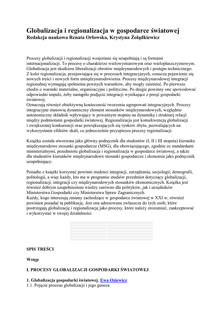 Globalizacja i regionalizacja w gospodarce światowej Redakcja naukowa Renata Orłowska, Krystyna Żołądkiewicz Procesy globalizacji i regionalizacji wzajemnie się uzupełniają i są formami internacjonalizacji. To procesy o charakterze wielowymiarowym oraz wielopłaszczyznowym. Globalizacja jest skutkiem liberalizacji obrotów międzynarodowych i postępu technicznego. Z kolei regionalizacja, przejawiająca się w procesach integracyjnych, oznacza pojawienie się nowych treści i nowych form umiędzynarodowienia. Procesy międzynarodowej integracji regionalnej wymagają spełnienia pewnych warunków, aby mogły zaistnieć. Po pierwsze chodzi o warunki materialne, organizacyjne i polityczne. Po drugie powinny one spowodować odpowiedni impuls, żeby nastąpiło podjęcie integracji wynikające z presji gospodarki światowej. Oznaczają również obiektywną konieczność tworzenia ugrupowań integracyjnych. Procesy integracyjne stanowią dynamiczny element stosunków międzynarodowych, względnie autonomiczny składnik wpływający w poważnym stopniu na dynamikę i strukturę relacji między podmiotami gospodarki światowej. Regionalizacja jest konsekwencją globalizacji i zwiększonej konkurencji oraz powiększających się rynków zbytu, pozwalających na wykorzystanie efektów skali, co jednocześnie przyspiesza procesy regionalizacji. Książka została stworzona jako główny podręcznik dla studentów (I, II i III stopnia) kierunku międzynarodowe stosunki gospodarcze (MSG), dla obowiązującego, zgodnie ze standardami ministerialnymi, przedmiotu globalizacja i regionalizacja w gospodarce światowej, a także dla studentów kierunków międzynarodowe stosunki gospodarcze i ekonomia jako podręcznik uzupełniający. Ponadto z książki korzystać powinni studenci integracji, zarządzania, socjologii, demografii, politologii, a więc każdy, kto ma w programie studiów przedmiot dotyczący globalizacji, regionalizacji, integracji czy międzynarodowych stosunków ekonomicznych. Książka jest również dobrym uzupełnieniem wiedzy zarówno dla polityków, jak i urzędników Ministerstwa Gospodarki czy Ministerstwa Spraw Zagranicznych. Każdy, kogo interesują zmiany zachodzące w gospodarce światowej w XXI w, również powinien posadać tą publikację. Jest ona adresowana zwłaszcza do tych osób, które postrzegają globalizację i regionalizację jako procesy, które należy zrozumieć, zaakceptować i wykorzystać w swojej działalności. SPIS TREŚCI Wstęp I. PROCESY GLOBALIZACJI GOSPODARKI ŚWIATOWEJ 1. Globalizacja gospodarki światowej, Ewa Oziewicz 1.1. Pojęcie procesu globalizacji i jego geneza 1.2. Cechy globalizacji 1.3. Mierniki globalizacji 1.4. Globalne współzależności i oddziaływania 1.5. Korzyści i koszty globalizacji 2. Podmioty gospodarki światowej, Joanna Bednarz 2.1. Internacjonalizacja przedsiębiorstw krajowych 2.2. Korporacje transnarodowe 2.3. Gospodarki narodowe 2.4. Międzynarodowe ugrupowania integracyjne 2.5. Międzynarodowe organizacje gospodarcze 3. Korporacje transnarodowe jako siła napędowa procesu globalizacji 3.1. Istota i charakterystyka korporacji transnarodowych 3.2. Korporacje transnarodowe krajów rozwiniętych 3.3. Korporacje transnarodowe krajów rozwijających się 4. Globalizacja rynków towarowych i usługowych 4.1. Międzynarodowy podział pracy, Renata Orłowska 4.2. Struktura i dynamika międzynarodowego handlu towarowego, Krzysztof Ziółkowski 4.3. Usługi w handlu międzynarodowym, Renata Orłowska 4.4. Liberalizacja handlu światowego w GATT/WTO, Krystyna Żołądkiewicz 5. Konkurencyjność międzynarodowa, Joanna Bednarz 5.1. Istota konkurencyjności międzynarodowej 5.2. Poziomy konkurencyjności międzynarodowej 5.3. Przemiany konkurencyjności międzynarodowej w dobie globalizacji i regionalizacji 6. Innowacyjność w erze globalizacji, Sylwia Pangsy-Kania 6.1. Innowacyjność jako wyzwanie globalizacji 6.2. Taksonomia globalizacji innowacji 6.3. Innowacyjność w Unii Europejskiej, Stanach Zjednoczonych i Japonii — analiza porównawcza 7. Globalne rynki finansowe 7.1. Globalizacja rynków finansowych, Tomasz Michałowski 7.2. Międzynarodowe przepływy kapitału, Tomasz Michałowski 7.3. Międzynarodowy rynek pieniężny, Tomasz Bieliński 7.4. Międzynarodowy rynek kapitałowy, Tomasz Bieliński 7.5. Globalizacja systemów bankowych, Tomasz Bieliński 7.6. Rola MFW wobec wyzwań globalizacji rynków finansowych, Tomasz Michałowski 8. Globalne powiązania rynków pracy, Renata Orłowska 8.1. Ewolucja i segmentacja rynku pracy 8.2. Przyczyny rozwoju globalnego rynku pracy 8.3. Międzynarodowe przepływy zasobów pracy 8.4. Ilościowe i jakościowe zmiany popytu na pracę jako efekt globalizacji 9. Kultura w warunkach globalizacji, Tomasz Bieliński 9.1. Istota kultury w globalnej gospodarce 9.2. Dyfuzja kultur, wpływ procesów globalizacji na kultury 9.3. Wymiary kultury II. PROCESY REGIONALIZACJI GOSPODARKI ŚWIATOWEJ 10. Regionalizacja i regionalizm w gospodarce światowej, Krystyna Żołądkiewicz 10.1. Istota regionalizmu i regionalizacji 10.2. Typy i formy integracji gospodarczej 10.3. Przesłanki i warunki integracji gospodarczej 10.4. Efekty integracji gospodarczej 10.5. Główne koncepcje integracji gospodarczej 11. Regionalizm a multilateralizm, Krystyna Żołądkiewicz 11.1. Podstawa prawna regionalnych porozumień handlowych 11.2. Proliferacja ugrupowań integracyjnych 11.3. Fale regionalizmu 11.4. Alternatywa: regionalizm czy system wielostronny 12. Procesy integracyjne na kontynencie europejskim 12.1. Unia Europejska, Renata Orłowska 12.2. Europejskie Stowarzyszenie Wolnego Handlu, Krystyna Żołądkiewicz 12.3. Europejski Obszar Gospodarczy, Renata Orłowska 13. Procesy integracyjne na kontynentach amerykańskich 13.1. Procesy integracyjne w Ameryce Północnej, Krystyna Żołądkiewicz 13.2. Integracja w Ameryce Łacińskiej i na Karaibach, Tomasz Michałowski 13.3. Koncepcja rozwoju ogólnoa