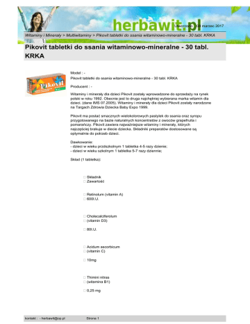 Utworzono : 08 marzec 2017 Witaminy i Minerały > Multiwitaminy > Pikovit tabletki do ssania witaminowo-mineralne - 30 tabl. KRKA Pikovit tabletki do ssania witaminowo-mineralne - 30 tabl. KRKA Model : Pikovit tabletki do ssania witaminowo-mineralne - 30 tabl. KRKA Producent : Witaminy i minerały dla dzieci Pikovit zostały wprowadzone do sprzedaży na rynek polski w roku 1992. Obecnie jest to druga najchętniej wybierana marka witamin dla dzieci. (dane IMS 07.2005). Witaminy i minerały dla dzieci Pikovit zostały narodzone na Targach Zdrowia Dziecka Baby Expo 1999. Pikovit ma postać smacznych wielokolorowych pastylek do ssania oraz syropu przygotowanego na bazie naturalnych koncentratów z owoców grapefruita i pomarańczy. Pikovit zawiera najważniejsze witaminy i minerały, których najczęściej brakuje w diecie dziecka. Składniki preparatów dostosowane są optymalnie do potrzeb dzieci. Dawkowanie: - dzieci w wieku przdszkolnym 1 tabletka 4-5 razy dzienie; - dzieci w wieku szkolnym 1 tabletka 5-7 razy dziennie; Skład (1 tabletka): �Składnik �Zawartość �Retinolum (vitamin A) �600I.U. �Cholecalciferolum �(vitamin D3) �80I.U. �Acidum ascorbicum �(vitamin C) �10mg �Thimini nitras �(witamina B1) �0,25 mg kontakt : - [email protected] Strona 1 Utworzono : 08 marzec 2017 Witaminy i Minerały > Multiwitaminy > Pikovit tabletki do ssania witaminowo-mineralne - 30 tabl. KRKA Pikovit tabletki do ssania witaminowo-mineralne - 30 tabl. KRKA �Riboflavinum �(vitamin B2) �0,3mg �Pyridoxini chloridum �witamina B6) �0,3mg �Cyanocobalaninum �(witamina B12) �0,2�g �Nicotinamidum �(witamina PP) �3mg �Calcii pantothenas �(pantotenian wapnia) �1,2mg �Calcii pantothenas �(pantotenian wapnia) �1,2mg �Acidum folicum �(kwas foliowy) �0,04mg �Calcium (wapń) �12,5 mg �Phosphorus (fosfor) �10 mg Cena : 11,01 zł Brutto ( 10,19 zł Netto) kontakt : - [email protected] Strona 2 Utworzono : 08 marzec 2017 Witaminy i Minerały > Multiwitaminy > Pikovit tabletki do ssania witaminowo-mineralne - 30 tabl. KRKA Pikovit tabletki do ssania witaminowo-mineralne - 30 tabl. KRKA Dostępność: Produkt dostępny w naszym sklepie od 09 kwiecień 2009 kontakt : - [email protected] Strona 3