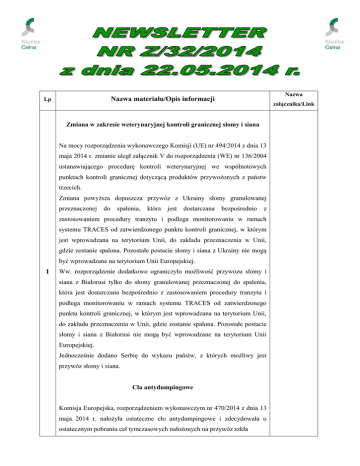 Nazwa Nazwa materiału/Opis informacji Lp załącznika/Link Zmiana w zakresie weterynaryjnej kontroli granicznej słomy i siana Na mocy rozporządzenia wykonawczego Komisji (UE) nr 494/2014 z dnia 13 maja 2014 r. zmianie uległ załącznik V do rozporządzenia (WE) nr 136/2004 ustanawiającego procedurę kontroli weterynaryjnej we wspólnotowych punktach kontroli granicznej dotyczącą produktów przywożonych z państw trzecich. Zmiana powyższa dopuszcza przywóz z Ukrainy słomy granulowanej przeznaczonej do spalenia, która jest dostarczana bezpośrednio z zastosowaniem procedury tranzytu i podlega monitorowaniu w ramach systemu TRACES od zatwierdzonego punktu kontroli granicznej, w którym jest wprowadzana na terytorium Unii, do zakładu przeznaczenia w Unii, gdzie zostanie spalona. Pozostałe postacie słomy i siana z Ukrainy nie mogą być wprowadzane na terytorium Unii Europejskiej. 1 Ww. rozporządzenie dodatkowo ograniczyło możliwość przywozu słomy i siana z Białorusi tylko do słomy granulowanej przeznaczonej do spalenia, która jest dostarczana bezpośrednio z zastosowaniem procedury tranzytu i podlega monitorowaniu w ramach systemu TRACES od zatwierdzonego punktu kontroli granicznej, w którym jest wprowadzana na terytorium Unii, do zakładu przeznaczenia w Unii, gdzie zostanie spalona. Pozostałe postacie słomy i siana z Białorusi nie mogą być wprowadzane na terytorium Unii Europejskiej. Jednocześnie dodano Serbię do wykazu państw, z których możliwy jest przywóz słomy i siana. Cła antydumpingowe Komisja Europejska, rozporządzeniem wykonawczym nr 470/2014 z dnia 13 maja 2014 r. nałożyła ostateczne cło antydumpingowe i zdecydowała o ostatecznym pobraniu ceł tymczasowych nałożonych na przywóz szkła solarnego pochodzącego z Chińskiej Republiki Ludowej. Kwoty zabezpieczone na podstawie rozporządzenia Komisji (UE) nr 1205/2013 z dnia 26 listopada 2013 r. nakładającego tymczasowe cło antydumpingowe na przywóz szkła solarnego pochodzącego z ChRL powinny zostać ostatecznie pobrane. Jednocześnie, w drodze rozporządzenia wykonawczego nr 471/2014 z dnia 13 maja 2014 r., Komisja nałożyła ostateczne cła wyrównawcze na przywóz szkła solarnego z ChRL. Zwolnieniu ulega zabezpieczenie przekraczające kwotę stanowiącą sumę stawek ostatecznych ceł antydumpingowych (ustanowionych w rozporządzeniu nr 470/2014) i ceł wyrównawczych (ustanowionych w rozporządzeniu nr 471/2014). Na stronie internetowej Ministerstwa Finansów w witrynie pro klienckiej w dziale Cło/Informacje dla przedsiębiorców/Wartość celna zostały udostępnione wytyczne i formularze w zakresie stosowania uproszczonego sposobu obliczania niektórych elementów formułujących wartość celną. Prawna możliwość uproszczonego (ryczałtowego) sposobu obliczania kosztów dodawanych do ceny faktycznie zapłaconej lub należnej za sprowadzane towary, która stosowana jest w przypadku, gdy w chwili 2 http://www.finanse. mf.gov.pl/clo/inform powstania długu celnego zgłaszający nie dysponuje wszystkimi informacjami acje-dla- niezbędnymi do ustalenia wartości celnej sprowadzanych towarów (np., gdy przedsiebiorcow/war kwota stanowiąca opłaty licencyjne odnoszące się do sprowadzonych towarów będzie znana dopiero po odsprzedaży tych towarów) istnieje od 10 lat, ma bowiem swoją podstawę w przepisie art. 156 a rozporządzenia Komisji (EWG) nr 2454/93, jednak nie była dotąd rozwiązaniem popularnym wśród polskich importerów. W celu ułatwienia przedsiębiorcom korzystania z tej instytucji przygotowano wytyczne i formularze, w tym formularz wniosku wraz z objaśnieniami jego wypełniania, które pomogą lepiej zapoznać się z zasadami funkcjonowania tego uproszczenia, korzyściami tosc-celna jakie daje, a także pomogą w sposób prawidłowy i kompletny przygotować wniosek, co przyczyni się do szybszego i sprawnego rozpatrzenia sprawy. Zespół „Newsletter”