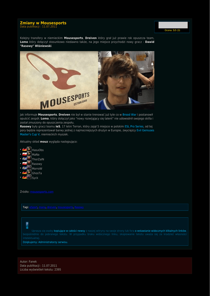 Zmiany w Mousesports Data publikacji : 11.07.2011 Ocena: 5/5 (3) Kolejny transfery w niemieckim Mousesports, Dreiven który grał już prawie rok opuszcza team, Lomo który dołączył stosunkowo niedawno także, na jego miejsce przychodzi nowy gracz - Dawid "Rasowy" Wiśniewski. Jak informuje Mousesports, Dreiven nie był w stanie trenować już tyle co w Brood War i postanowił opuścić zespół. Lomo, który dołączył jako "nowy rozwijąjący się talent" nie udowodnił swojego skilla i został zmuszony do opuszczenia zespołu. Rasowy były gracz teamu ieS, 17 letni Terran, który zajął 5 miejsce w polskim ESL Pro Series, od tej pory będzie reprezentował barwy jednej z najmocniejszych drużyn w Europie, zwycięzcy Evil Geniuses Master's Cup V, niemieckich myszek. Aktualny skład mouz wygląda następująco: ● HasuObs ● MaNa ● ThorZaIN ● Rasowy ● MorroW ● GhosTa ● Syck Źródło: mousesports.com Tagi: eSport, mana, dreiven, mousesports, Rasowy Uprasza się osoby kopiujące w całości newsy z naszej witryny na swoje strony lub fora o wstawianie widocznych klikalnych linków, bezpośrednio do pobranego tekstu. W przypadku braku widocznego linku, skopiowanie tekstu uważa się za kradzież własności intelektualnej. Dziękujemy: Administratorzy serwisu. Autor: Fanek Data publikacji : 11.07.2011 Liczba wyświetleń tekstu: 2395 Komentarz (9) dodaj komentarz Nareszcie MaNa będzie miał polskiego kolege w Teamie ;) GL Rasowy!~Mestru 2011/07/11 19:45 Przecież miał przez długi czas kolegę Dreivena. ^^~Deciduous 2011/07/11 20:02 hah no ogar :)~GonzO27 2011/07/11 20:04 Ale o Dreivenie sie praktycznie nic nie słyszało =.= Pierwszy raz o gościu słysze wgl. więc taki kolega jak z koziej dupy trąbka ;] ~Mestru 2011/07/11 20:05 rasowy solidny grasz. widziałem repa jak zjechał idre :D~ggwCenturio 2011/07/11 20:52 Dreiven baaaardzo popularny gracz sc:bw dziwne że nie śłyszałeś.~simon4 2011/07/11 21:11 a co ma granie w turniejach do bycia dobym kolega ? :D Dreiven to legenda bw i napewno dobry znajomy many~GonzO27 2011/07/11 21:41 Przecież dreiven grywał w turniejach i osiągał dobre wyniki. Chodzi mi oczywiście o te cykliczne.~Vengance 2011/07/12 14:16 W SC2 o Dreivenie praktycznie nic nie słyszałem. SC:BW sie nie interesowałem, więc z tamtąd go nie będe kojarzył.~Mestru 2011/07/15 13:30 dodaj komentarz 08.10.2015 Kampania "Szepty o zagładzie" dostępna za darmo (0 komentarzy) 27.09.2015 Kolejni bohaterowie w trybie Sprzymierzonych Dowódców (0 komentarzy) 22.09.2015 Cyfrowe gadżety za udział w BlizzCon 2015 (0 komentarzy) 15.07.2015 Legacy of the Void dostępne w przedsprzedaży! (0 komentarzy) 17.06.2015 Informacje z E3 - prolog kampanii Legacy of the Void (0 komentarzy) 30.05.2015 WCS Europe - sobota (30 maja) 18.00 grupa G - MaNa! (0 komentarzy) 07.05.2015 DreamHack Open France 2015 - już 8 maja - MaNa! (0 komentarzy) 03.05.2015 Na wesoło: postacie E-sportu 50 (0 komentarzy) 03.05.2015 IEM Katowice 2015 - jeszcze raz! (0 komentarzy) 03.05.2015 KeSPA Cup 2015 Season 1 - live! (0 komentarzy) 26.04.2015 Proleague - Top5 gier miesiąca (0 komentarzy) 26.04.2015 CJ Entus wygrywa 2 runde Proleague! (0 komentarzy) 18.04.2015 Wersja beta Legacy of the Void – aktualizacja 2.5.1 (0 komentarzy) 18.04.2015 WCS finals 2015 - galeria (0 komentarzy) 18.04.2015 Omówienie zmian w balansie Legacy of the Void (0 komentarzy) 11.04.2015 WCS Europe kwalifikacje z Polakami - dziś (sobota) 18.00 (0 komentarzy) 11.04.2015 Aktualizacja balansu Heart of the Swarm – 9 kwietnia (0 komentarzy) 11.04.2015 GSL Season1 2015 - galeria (0 komentarzy) 11.04.2015 Zbanowane konta w StarCraft II (0 komentarzy) 04.04.2015 Red Bull Battle Grounds powraca jesienią 2015 (0 komentarzy) (zobacz wszystkie)