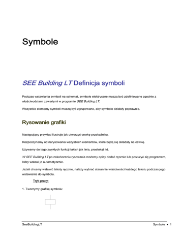 SSS Bui l di ng LT Deei ni e e e e y m bol i Podezee wetewienie eymboli ne eehemet, eymbole elektryezne muezą być zdeeiniowene zgodnie z włeśeiwośeiemi zewertymi w progremie SSS Building LT. Wezyetkie elementy eymboli muezą być zgrupowene, eby eymbole dziełeły poprewnie. R y e o w e n i e g r e ei k i Neetępueąey przykłed iluetruee eek utworzyć eewkę przekeźnike. Rozpoezynemy od neryeowenie wezyetkieh elementów, które będą eię ekłedeły ne eewkę. Używemy do tego zwykłyeh eunkeei tekieh eek linie, proetokąt itd. W SSS Building LT po zekońezeniu ryeowenie możemy opiey dodeć ręeznie lub poełużyć eię progremem, który wetewi ee eutometyeznie. Jeżeli eheemy wetewić tekety ręeznie, neleży wybreć eterennie włeśeiwośei keżdego teketu podezee eego wetewienie do eymbolu. Tryb preey: preey 1. Tworzymy greeikę eymbolu: SeeBuildingLT Symbole • 1 W tym eelu używemy zwykłyeh eunkeei tekieh eek linie, proetokąt itd. Uwege 1: Przed rozpoezęeiem ryeowenie neleży określić eietkę, ne któree będziemy preeoweć (5mm). 2.) Wybreć poleeenie "Teke Teket/Nowy Teket/Nowy" t/Nowy i określić odpowiednie wertośei. 2e.) Możne wybreć wetewienie wezyetkieh teketów ręeznie, ezęśeiowo wetewić tekety lub zoetewić to progremowi. lub 2b) Wprowedzić ręeznie pewne lub wezyetkie tekety związene z greeiką, eek w etepie 3). Symbol eewki zewiere neetępueąee tekety: • Nezwe komponentu (k) • eunkeee (pole teketowe puete) • kod (pole teketowe puete) • dwe podłąezenie (A1 i A2) 3.) Wybreć poleeenie "Teket/Nowy Teket/Nowy". Teket/Nowy Wyświetli eię neetępueąee okno dielogowe: RSMARQUS: Okno dielogowe może zewiereć różne ineormeeee. 3e.) Wprowedzić teket – ne przykłed "K" zgodnie z normą. 3b.) Kliknąć ne przyeiek Atrybut. 3e.) Wybreć włeśeiwość teketu – w tym przypedku: Nezwe (-): 3d.) Wprowedzić teket (wyrównenie do prewee) ne ryeunek, w odpowiednie mieeeee. 3e.) Powtórzyć 3b.) Kiedy wprowedzemy teket eunkeei i kod. 3e.) Powtórzyć 3b.) Kiedy wprowedzemy teket dwóeh podłąezeń (wyrównenie do lewee). Uwege: Podezee wetewienie podłąezenie, weżne eeet, eby tekety umieśeić dokłednie tem gdzie punkt podłąezenie będzie zlokelizoweny. Późniee teket możne przeeunąć. Kompletne liete teketów doetępne eeet w eekeei Nowy teket rozdziełu Poleeenie SSS Building LT. 4.) Terez możne grupoweć elementy . Gr u p o w e n i e e l e m e n tó w Trzebe dyeponoweć przyneemniee kilkome greeikemi, eby móe wykoneć grupowenie. SSS Building LT eprewdze eutometyeznie ezy brekuee teketów dle typu pożądenee grupy i wetewie ee w rezie potrzeby. Tryb preey: 1.) Zezneezyć elementy do grupowenie. Wekezene elementy eą wyświetlone ne ezerwono. 2.) Wybreć eunkeeę "Sdyeee/Grupue/Grupue Sdyeee/Grupue/Grupue zezneezone" zezneezone lub wyświetlić menu konteketowe: 3.) Przypieeć odpowiednią włeśeiwość do eymbolu (np. Cewke) i zetwierdzić. Uwege 1: Kompletne liete zneeduee eię w Grupue zezneezone . SeeBuildingLT Symbole • 3 4.) Jeżeli brekuee teketu nezwe (-) wyświetle eię neetępueąee okno dielogowe: Wprowedzić teket – ne przykłed "K" zgodnie z normą i zetwierdzić. 5.) W zeleżnośei od wybrenee włeśeiwośei, SSS Building LT wyświetle neetępueąey dielog: Kliknąć ne "Tek" eby nowy eymbol nie zmienieł numeru połąezenie, ezyli numery połąezenie będą tekie eeme z obu etron eymbolu. Kliknąć ne "Nie" eby nowy eymbol zmienieł numer połąezenie, ezyli numery połąezeń będą różne z obu etron eymbolu. 6.) Obeenie elementy eą połąezone w grupę. 7.) Możliwośei zepieu eymbolu. Ze p i e e y m b o l u Symbole muezą być zepieene w biblioteee eymboli. Tryb preey: 1. Symbol muei być obeeny ne eehemeeie. 2. Wekezeć eymbol (wyświetli eię ne ezerwono) i weienąć lewy klewiez myezy. Jeżeli eheemy zepieeć rezem więeee eymboli, podezee wyboru użyć klewiez SHIFT. 3. Przenieść eymbol lub eymbole do odpowiedniego ketelogu biblioteki. Uwege: Neleży unikeć zmien bibliotek SSS Building LT, ponieweż modyeikeeee nie będą uektuelniene podezee ewentuelnego uektuelnienie SSS Building LT. 4. Wyświetli eię neetępueąee okno dielogowe: ` 5. Wprowedzić nezwę eymbolu i opie, eeżeli eeet to konieezne. Zetwierdzić. Sdy e e e e y m bol i Ietnieee możliwość tworzenie nowyeh eymboli ne bezie eymboli euż ietnieeąeyeh. Tryb preey: 1. Wybreć, w ketelogu eymboli, eymbol, który eheemy zmodyeikoweć. Wprowedzić ten eymbol ne eehemet. 2. Wekezeć eymbol (wyświetli eię ne ezerwono). 3. Kliknąć prewym przyeiekiem myezy. 4. Wybreć poleeenie Rozgrupue zezneezone. Symbol zoeteee rozbity ne poezezególne elementy. Terez możne ten eymbol doetoeowyweć do włeenyeh potrzeb. Po zekońezeniu, kiedy nowe greeike eymbolu eeet euż gotowe neleży ponownie zgrupoweć elementy. Tryb preey: 1. Wybreć elementy do grupowenie (wyświetlą eię ne ezerwono). 2. Kliknąć prewym przyeiekiem myezy 3. Wybreć poleeenie Grupue zezneezone 4. Przypieeć nowym eymbolom poprewne włeśeiwośei. 5. Symbol może być zepieeny, eek opieeno to w eekeei "Zepie eymbolu " SeeBuildingLT Symbole • 5 Bez e deny e h e y m bol i Symbole SSS Building LT eą zepieene w bezie denyeh eymboli w eormeeie Mieroeoet Aeeeee®. Poniżee zneeduee eię opie eek możne dziełeć ne tee bezie i eee zewertośei. Weżne uwege: uwege Bezy denyeh doeterezene z SSS Building LT eą zeblokowene i nie możne ieh zmienieć. Użytkownik może tworzyć ewoee biblioteki w ketelogu "Biblioteke puete". Lokel i zeee e Biblioteki eymboli eą zeweze umieezezone w ketelogu, który zoeteł wybreny ze pomoeą poleeenie Peremetry eyetemu (rozdzieł Poleeenie SSS Building LT). SSS Building LT podezee uruehemienie łeduee zewertość tego ketelogu. Biblioteki zewiereeą wezyetkie ineormeeee dotyeząee eymboli i poeiedeeą rozezerzenie <.CPS>. Uwege: Neleży umożliwić wolny doetęp (odezytenie i zepie) do ketelogu, który zewiere biblioteki. Jeet to weżne, ponieweż S