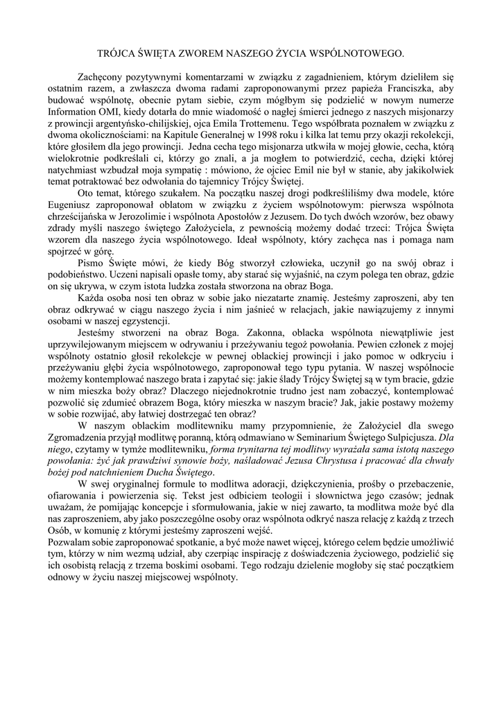 TRÓJCA ŚWIĘTA ZWOREM NASZEGO ŻYCIA WSPÓLNOTOWEGO. Zachęcony pozytywnymi komentarzami w związku z zagadnieniem, którym dzieliłem się ostatnim razem, a zwłaszcza dwoma radami zaproponowanymi przez papieża Franciszka, aby budować wspólnotę, obecnie pytam siebie, czym mógłbym się podzielić w nowym numerze Information OMI, kiedy dotarła do mnie wiadomość o nagłej śmierci jednego z naszych misjonarzy z prowincji argentyńsko-chilijskiej, ojca Emila Trottemenu. Tego współbrata poznałem w związku z dwoma okolicznościami: na Kapitule Generalnej w 1998 roku i kilka lat temu przy okazji rekolekcji, które głosiłem dla jego prowincji. Jedna cecha tego misjonarza utkwiła w mojej głowie, cecha, którą wielokrotnie podkreślali ci, którzy go znali, a ja mogłem to potwierdzić, cecha, dzięki której natychmiast wzbudzał moja sympatię : mówiono, że ojciec Emil nie był w stanie, aby jakikolwiek temat potraktować bez odwołania do tajemnicy Trójcy Świętej. Oto temat, którego szukałem. Na początku naszej drogi podkreśliliśmy dwa modele, które Eugeniusz zaproponował oblatom w związku z życiem wspólnotowym: pierwsza wspólnota chrześcijańska w Jerozolimie i wspólnota Apostołów z Jezusem. Do tych dwóch wzorów, bez obawy zdrady myśli naszego świętego Założyciela, z pewnością możemy dodać trzeci: Trójca Święta wzorem dla naszego życia wspólnotowego. Ideał wspólnoty, który zachęca nas i pomaga nam spojrzeć w górę. Pismo Święte mówi, że kiedy Bóg stworzył człowieka, uczynił go na swój obraz i podobieństwo. Uczeni napisali opasłe tomy, aby starać się wyjaśnić, na czym polega ten obraz, gdzie on się ukrywa, w czym istota ludzka została stworzona na obraz Boga. Każda osoba nosi ten obraz w sobie jako niezatarte znamię. Jesteśmy zaproszeni, aby ten obraz odkrywać w ciągu naszego życia i nim jaśnieć w relacjach, jakie nawiązujemy z innymi osobami w naszej egzystencji. Jesteśmy stworzeni na obraz Boga. Zakonna, oblacka wspólnota niewątpliwie jest uprzywilejowanym miejscem w odrywaniu i przeżywaniu tegoż powołania. Pewien członek z mojej wspólnoty ostatnio głosił rekolekcje w pewnej oblackiej prowincji i jako pomoc w odkryciu i przeżywaniu głębi życia wspólnotowego, zaproponował tego typu pytania. W naszej wspólnocie możemy kontemplować naszego brata i zapytać się: jakie ślady Trójcy Świętej są w tym bracie, gdzie w nim mieszka boży obraz? Dlaczego niejednokrotnie trudno jest nam zobaczyć, kontemplować pozwolić się zdumieć obrazem Boga, który mieszka w naszym bracie? Jak, jakie postawy możemy w sobie rozwijać, aby łatwiej dostrzegać ten obraz? W naszym oblackim modlitewniku mamy przypomnienie, że Założyciel dla swego Zgromadzenia przyjął modlitwę poranną, którą odmawiano w Seminarium Świętego Sulpicjusza. Dla niego, czytamy w tymże modlitewniku, forma trynitarna tej modlitwy wyrażała sama istotą naszego powołania: żyć jak prawdziwi synowie boży, naśladować Jezusa Chrystusa i pracować dla chwały bożej pod natchnieniem Ducha Świętego. W swej oryginalnej formule to modlitwa adoracji, dziękczynienia, prośby o przebaczenie, ofiarowania i powierzenia się. Tekst jest odbiciem teologii i słownictwa jego czasów; jednak uważam, że pomijając koncepcje i sformułowania, jakie w niej zawarto, ta modlitwa może być dla nas zaproszeniem, aby jako poszczególne osoby oraz wspólnota odkryć nasza relację z każdą z trzech Osób, w komunię z którymi jesteśmy zaproszeni wejść. Pozwalam sobie zaproponować spotkanie, a być może nawet więcej, którego celem będzie umożliwić tym, którzy w nim wezmą udział, aby czerpiąc inspirację z doświadczenia życiowego, podzielić się ich osobistą relacją z trzema boskimi osobami. Tego rodzaju dzielenie mogłoby się stać początkiem odnowy w życiu naszej miejscowej wspólnoty. Ten artykuł nie jest miejscem, aby dyskutować o Trójcy Świętej z teologicznego lub biblijnego punktu widzenia; chciałbym mimo wszystko podkreślić pewne cechy trzech osób boskich tak jak przedstawia nam je Słowo Boże, a zwłaszcza ewangelia, aspekty, które możemy odnaleźć w sobie samych lub na nowo odkryć w naszych braciach stworzonych na boży obraz. W Ojcu, którego w Credo nazywamy Stwórcą i Panem wszystkich rzeczy, Ewangelia podkreśla Jego dobroć, miłosierdzie, darmową miłość, czułość i przebaczenie. W osobie Syna podkreślono wolne i całkowite posłuszeństwo woli Ojca, zdolność przyjęcia, dar swego życia za zbawienie wszystkich, Jego oblację na ołtarzu krzyża, w osobie Ducha Świętego wzajemną miłość pomiędzy Ojcem i Synem, mówimy, że jest on Pocieszycielem, Obrońcą, Tym, który prowadzi nas do prawdy, aby nas uczynić wolnymi, abyśmy traktowali siebie jako bracia i siostry, dzieci tego samego Ojca. Nie miałem zamiaru szczegółowo opisywać, jak powinniśmy przeżywać obecność Trójcy Świętej w naszym życiu wspólnotowym, w naszych relacjach międzyludzkich, w życiu, które otrzymujemy jako dar Ojca i na który codziennie jesteśmy zaproszeni, aby odpowiadać. Raczej chciałbym pozostawić to doświadczenie oblackiej wspólnocie, zwłaszcza lokalnej, która jest żywą komórka naszej misji. (Paolo ARCHIATI, OMI, Wikariusz Generalny)