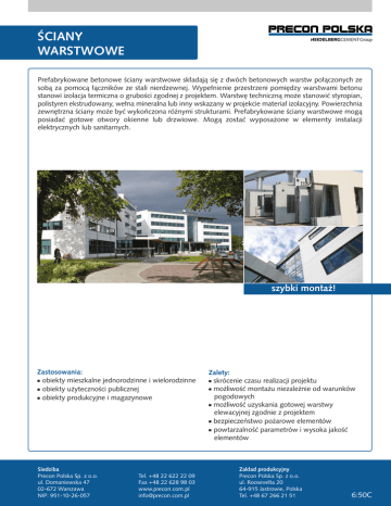 ŚCIANY wArstwowe Prefabrykowane betonowe ściany warstwowe składają się z dwóch betonowych warstw połączonych ze sobą za pomocą łączników ze stali nierdzewnej. Wypełnienie przestrzeni pomiędzy warstwami betonu stanowi izolacja termiczna o grubości zgodnej z projektem. Warstwę techniczną może stanowić styropian, polistyren ekstrudowany, wełna mineralna lub inny wskazany w projekcie materiał izolacyjny. Powierzchnia zewnętrzna ściany może być wykończona różnymi strukturami. Prefabrykowane ściany warstwowe mogą posiadać gotowe otwory okienne lub drzwiowe. Mogą zostać wyposażone w elementy instalacji elektrycznych lub sanitarnych. szybki montaż! Zastosowania: ■ obiekty mieszkalne jednorodzinne i wielorodzinne ■ obiekty użyteczności publicznej ■ obiekty produkcyjne i magazynowe siedziba Precon Polska Sp. z o.o. ul. Domaniewska 47 02-672 Warszawa NIP: 951-10-26-057 Tel. +48 22 622 22 09 Fax +48 22 628 98 03 www.precon.com.pl [email protected] Zalety: ■ skrócenie czasu realizacji projektu ■ możliwość montażu niezależnie od warunków pogodowych ■ możliwość uzyskania gotowej warstwy elewacyjnej zgodnie z projektem ■ bezpieczeństwo pożarowe elementów ■ powtarzalność parametrów i wysoka jakość elementów Zakład produkcyjny Precon Polska Sp. z o.o. ul. Roosevelta 20 64-915 Jastrowie, Polska Tel. +48 67 266 21 51 6:50C ŚCIANY wArstwowe Dane techniczne typ elementu ściana prefabrykowana warstwowa wysokość ściany [H] m do 4 długość ściany [L] m do 15 grubość ściany [S] cm wg projektu grubość warstwy termoizolacji [St] cm wg projektu masa elementu t do 32 klasa betonu wg projektu klasa stali A-III, A-III N (A,B,C) klasa odporności ogniowej tolerancje wymiarowe wg projektu zgodnie z PN-EN 14992:2010 Znak CE na podstawie Zakładowej Kontroli Produkcji – nr certyfikacji 1487-CPD-68/ZKP/10. PN-EN14992:2010. Szczegółowych informacji udzieli doradca techniczno-handlowy Precon Polska z Państwa regionu. Uwagi: ■ Elementy ścian produkowane są w oparciu o indywidualne projekty określające ich parametry ■ Powierzchnia elewacyjna ściany może być gładka, rolkowana, płukana, drapana itp. Może posiadać wybrany przez klienta wzór wynikający z możliwości zastosowania gotowych matryc (np. Reckli, Noe) ■ Ściany standardowo wykonywane są z betonu o naturalnym, niejednorodnym kolorze szarym. W indywidualnych projektach do produkcji może zostać zastosowany beton barwiony ■ Ściany mogą zostać dodatkowo wyposażone w elementy instalacji np. elektrycznej Jakość produktów Precon Polska potwierdzają: ■ certyfikat zarządzania jakością ISO 9001:2008 ■ szwedzki certyfikat BBC NORDCERT ■ certyfikaty Instytutu Ceramiki i Materiałów Budowlanych i Zakładowej Kontroli Produkcji Precon – partner w prefabrykacji. Szybciej, lepiej, prościej! W trosce o ziemię, wodę i powietrze.