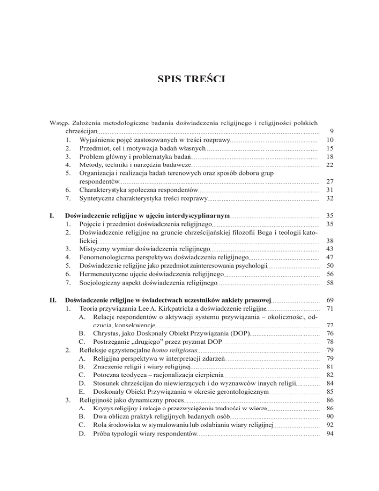 Spis treści Wstęp. Założenia metodologiczne badania doświadczenia religijnego i religijności polskich chrześcijan 9 1. Wyjaśnienie pojęć zastosowanych w treści rozprawy 10 2. Przedmiot, cel i motywacja badań własnych 15 3. Problem główny i problematyka badań 18 4. Metody, techniki i narzędzia badawcze 22 5. Organizacja i realizacja badań terenowych oraz sposób doboru grup respondentów 27 6. Charakterystyka społeczna respondentów 31 7. Syntetyczna charakterystyka treści rozprawy 32 I. Doświadczenie religijne w ujęciu interdyscyplinarnym 35 1. Pojęcie i przedmiot doświadczenia religijnego 35 2. Doświadczenie religijne na gruncie chrześcijańskiej filozofii Boga i teologii kato lickiej 38 3. Mistyczny wymiar doświadczenia religijnego 43 4. Fenomenologiczna perspektywa doświadczenia religijnego 47 5. Doświadczenie religijne jako przedmiot zainteresowania psychologii 50 6. Hermeneutyczne ujęcie doświadczenia religijnego 56 7. Socjologiczny aspekt doświadczenia religijnego 58 II. Doświadczenie religijne w świadectwach uczestników ankiety prasowej 69 1. Teoria przywiązania Lee A. Kirkpatricka a doświadczenie religijne 71 A. Relacje respondentów o aktywacji systemu przywiązania – okoliczności, od czucia, konsekwencje 72 B. Chrystus, jako Doskonały Obiekt Przywiązania (DOP) 76 C. Postrzeganie „drugiego” przez pryzmat DOP 78 2. Refleksje egzystencjalne homo religiosus 79 A. Religijna perspektywa w interpretacji zdarzeń 79 B. Znaczenie religii i wiary religijnej 81 C. Potoczna teodycea – racjonalizacja cierpienia 82 D. Stosunek chrześcijan do niewierzących i do wyznawców innych religii 84 E. Doskonały Obiekt Przywiązania w okresie gerontologicznym 85 3. Religijność jako dynamiczny proces 86 A. Kryzys religijny i relacje o przezwyciężeniu trudności w wierze 86 B. Dwa oblicza praktyk religijnych badanych osób 90 C. Rola środowiska w stymulowaniu lub osłabianiu wiary religijnej 92 D. Próba typologii wiary respondentów 94 III. Doświadczenie religijne jako spotkanie z religijnym autorytetem 99 1. Jan Paweł II jako religijny autorytet przełomu wieków 102 2. Autorytet religijny egzystujący na granicy dwu światów 103 3. Bezpośrednie i pośrednie spotkania z Janem Pawłem II jako doświadczenie reli gijne 107 4. Siła oddziaływania autorytetu religijnego 108 IV. Doświadczenie jako źródło przeświadczeń religijnych ludzi wierzących 113 1. Naukowe eksplikacje fenomenu religijności jednostki 114 2. Różnorodność źródeł wiary i religijności ludzi w dyskursie potocznym 121 3. Mistyczne przeżycia i nawrócenia religijne jako doświadczenie 126 4. Doświadczenie religijne jako „totalna intuicja religijna” w potocznym dyskursie chrześcijan 129 V. Konsekwencyjny wymiar doświadczenia religijnego – świadectwa członków Ruchu Odnowy w Duchu Świętym 133 1. Idea Ruchu Katolickiej Odnowy w Duchu Świętym 134 2. Doświadczenie religijne uczestników Odnowy w Duchu Świętym w Łodzi 137 3. Wiara w zjawiska mirakularne w świadectwach członków Ruchu 139 4. Doświadczenie religijne i postawy altruistyczne uczestników Ruchu 142 VI. „Wirtuozi religijni” – relacje o religijnym doświadczeniu mieszkańców wsi 153 1. Znaczenie religijnej socjalizacji w życiu badanych osób 154 2. Czynniki sprzyjające umocnieniu wiary respondentów i osłabiające jej intensywność 156 3. Potoczna waloryzacja snów i ich religijna eksplikacja w świadectwach respon dentów 157 4. Religijna wizja świata – zdarzenia codzienne i „niezwykłe” w pryzmacie wiary badanych osób 163 5. Wyobrażenia potoczne Boga (Ojca) i życia pozagrobowego przez respondentów 168 6. Wypowiedzi religijnych wirtuozów na temat kary śmierci, celibatu, kapłaństwa ko biet, klonowania i homoseksualizmu 170 7. Ideał kapłana według badanych katolików wiejskich 171 8. Ogólna charakterystyka religijności „wirtuozów” – wiejskich katolików 175 A. Cechy religijności „wirtuozów” 175 B. Społeczne zróżnicowanie religijnego dyskursu 181 C. „Wirtuozi” a model tradycyjnej ludowej religijności 182 D. Próba typologii respondentów 182 9. Case study – sylwetki wybranych wirtuozów religijnych 185 VII. Doświadczenie religijne miejskich chrześcijan. Próba typologii ich religijności 1. Szerokie i wąskie ujęcie doświadczenia religijnego w dyskursie chrześcijan 2. Typologia religijności respondentów 203 205 207 VIII. Doświadczenie religijne i inne wybrane parametry religijności studentów 1. Przekonania religijne badanych studentów 2. Doświadczenie religijne w życiu studentów 3. Heterodoksja doktrynalna badanej młodzieży studenckiej 4. Wiedza religijna badanych studentów 229 231 233 236 241 6 5. 6. 7. 8. 9. 10. Wybrane praktyki religijne badanych osób Wady i zalety księży według badanych studentów Kryzys wiary w środowisku studentów i jego przyczyny Czynniki warunkujące umocnienie wiary badanych studentów Znaczenie wiary w Boga w życiu młodzieży studenckiej Typologia religijności studentów 244 246 249 255 257 259 IX. Emocjonalny komponent w doświadczeniu religijnym 277 1. Indywidualne i wspólnotowe religijne przeżycia respondentów 280 2. Emocjonalny aspekt doświadczenia religijnego w świetle teorii rytuałów interakcyj nych Randalla Collinsa 283 3. Kościół katolicki a emocje w doświadczeniu religijnym 286 4. Emocje w doświadczeniu religijnym – relacje respondentów 290 Zakończenie 293 Polish homo religiosus. Religious experience in colloquial reports 307 Bibliografia 315 Aneks 337 Od redakcji 349 7