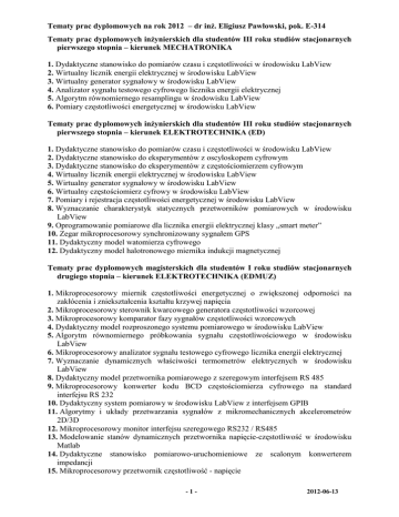 Tematy prac dyplomowych na rok 2012 – dr inŜ. Eligiusz Pawłowski, pok. E-314 Tematy prac dyplomowych inŜynierskich dla studentów III roku studiów stacjonarnych pierwszego stopnia – kierunek MECHATRONIKA 1. Dydaktyczne stanowisko do pomiarów czasu i częstotliwości w środowisku LabView 2. Wirtualny licznik energii elektrycznej w środowisku LabView 3. Wirtualny generator sygnałowy w środowisku LabView 4. Analizator sygnału testowego cyfrowego licznika energii elektrycznej 5. Algorytm równomiernego resamplingu w środowisku LabView 6. Pomiary częstotliwości energetycznej w środowisku LabView Tematy prac dyplomowych inŜynierskich dla studentów III roku studiów stacjonarnych pierwszego stopnia – kierunek ELEKTROTECHNIKA (ED) 1. Dydaktyczne stanowisko do pomiarów czasu i częstotliwości w środowisku LabView 2. Dydaktyczne stanowisko do eksperymentów z oscyloskopem cyfrowym 3. Dydaktyczne stanowisko do eksperymentów z częstościomierzem cyfrowym 4. Wirtualny licznik energii elektrycznej w środowisku LabView 5. Wirtualny generator sygnałowy w środowisku LabView 6. Wirtualny częstościomierz cyfrowy w środowisku LabView 7. Pomiary i rejestracja częstotliwości energetycznej w środowisku LabView 8. Wyznaczanie charakterystyk statycznych przetworników pomiarowych w środowisku LabView 9. Oprogramowanie pomiarowe dla licznika energii elektrycznej klasy „smart meter” 10. Zegar mikroprocesorowy synchronizowany sygnałem GPS 11. Dydaktyczny model watomierza cyfrowego 12. Dydaktyczny model halotronowego miernika indukcji magnetycznej Tematy prac dyplomowych magisterskich dla studentów I roku studiów stacjonarnych drugiego stopnia – kierunek ELEKTROTECHNIKA (EDMUZ) 1. Mikroprocesorowy miernik częstotliwości energetycznej o zwiększonej odporności na zakłócenia i zniekształcenia kształtu krzywej napięcia 2. Mikroprocesorowy sterownik kwarcowego generatora częstotliwości wzorcowej 3. Mikroprocesorowy komparator fazy sygnałów częstotliwości wzorcowych 4. Dydaktyczny model rozproszonego systemu pomiarowego w środowisku LabView 5. Algorytm równomiernego próbkowania sygnału częstotliwościowego w środowisku LabView 6. Mikroprocesorowy analizator sygnału testowego cyfrowego licznika energii elektrycznej 7. Wyznaczanie dynamicznych właściwości termometrów elektrycznych w środowisku LabView 8. Dydaktyczny model przetwornika pomiarowego z szeregowym interfejsem RS 485 9. Mikroprocesorowy konwerter kodu BCD częstościomierza cyfrowego na standard interfejsu RS 232 10. Dydaktyczny system pomiarowy w środowisku LabView z interfejsem GPIB 11. Algorytmy i układy przetwarzania sygnałów z mikromechanicznych akcelerometrów 2D/3D 12. Mikroprocesorowy monitor interfejsu szeregowego RS232 / RS485 13. Modelowanie stanów dynamicznych przetwornika napięcie-częstotliwość w środowisku Matlab 14. Dydaktyczne stanowisko pomiarowo-uruchomieniowe ze scalonym konwerterem impedancji 15. Mikroprocesorowy przetwornik częstotliwość - napięcie -1- 2012-06-13