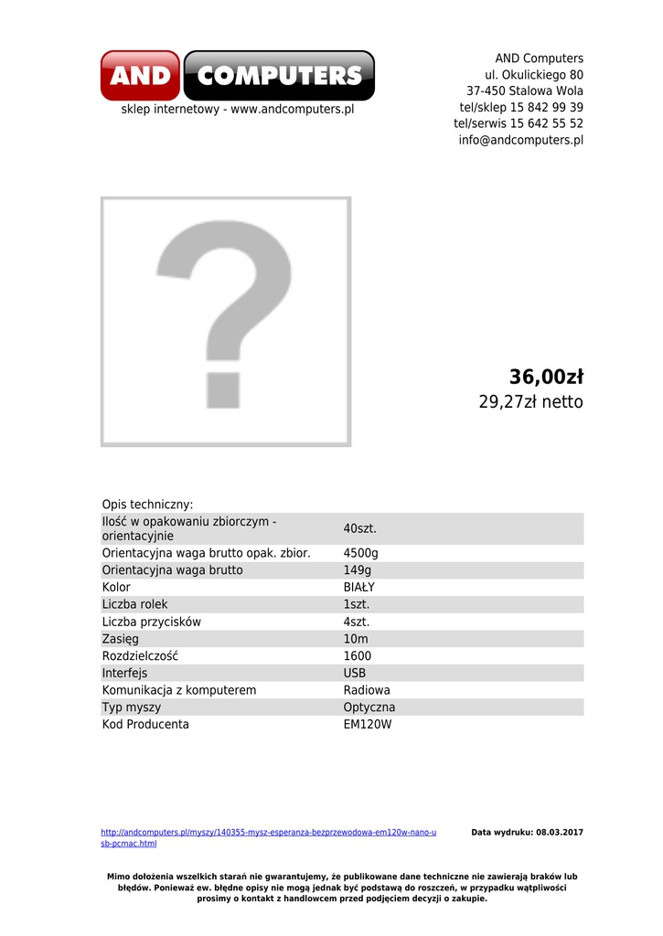sklep internetowy - www.andcomputers.pl AND Computers ul. Okulickiego 80 37-450 Stalowa Wola tel/sklep 15 842 99 39 tel/serwis 15 642 55 52 [email protected] 36,00zł 29,27zł netto Opis techniczny: Ilość w opakowaniu zbiorczym orientacyjnie Orientacyjna waga brutto opak. zbior. Orientacyjna waga brutto Kolor Liczba rolek Liczba przycisków Zasięg Rozdzielczość Interfejs Komunikacja z komputerem Typ myszy Kod Producenta 40szt. 4500g 149g BIAŁY 1szt. 4szt. 10m 1600 USB Radiowa Optyczna EM120W http://andcomputers.pl/myszy/140355-mysz-esperanza-bezprzewodowa-em120w-nano-u sb-pcmac.html Data wydruku: 08.03.2017 Mimo dołożenia wszelkich starań nie gwarantujemy, że publikowane dane techniczne nie zawierają braków lub błędów. Ponieważ ew. błędne opisy nie mogą jednak być podstawą do roszczeń, w przypadku wątpliwości prosimy o kontakt z handlowcem przed podjęciem decyzji o zakupie. http://andcomputers.pl/myszy/140355-mysz-esperanza-bezprzewodowa-em120w-nano-u sb-pcmac.html Data wydruku: 08.03.2017 Mimo dołożenia wszelkich starań nie gwarantujemy, że publikowane dane techniczne nie zawierają braków lub błędów. Ponieważ ew. błędne opisy nie mogą jednak być podstawą do roszczeń, w przypadku wątpliwości prosimy o kontakt z handlowcem przed podjęciem decyzji o zakupie.