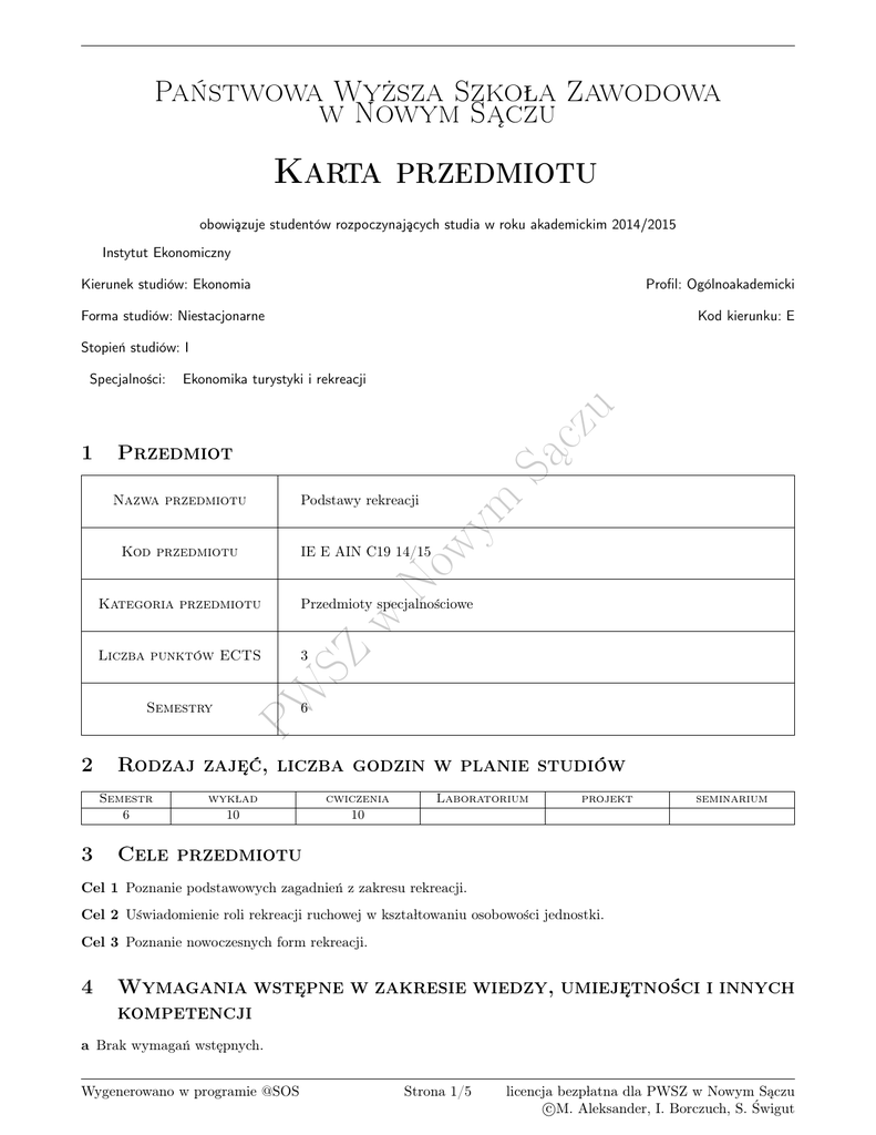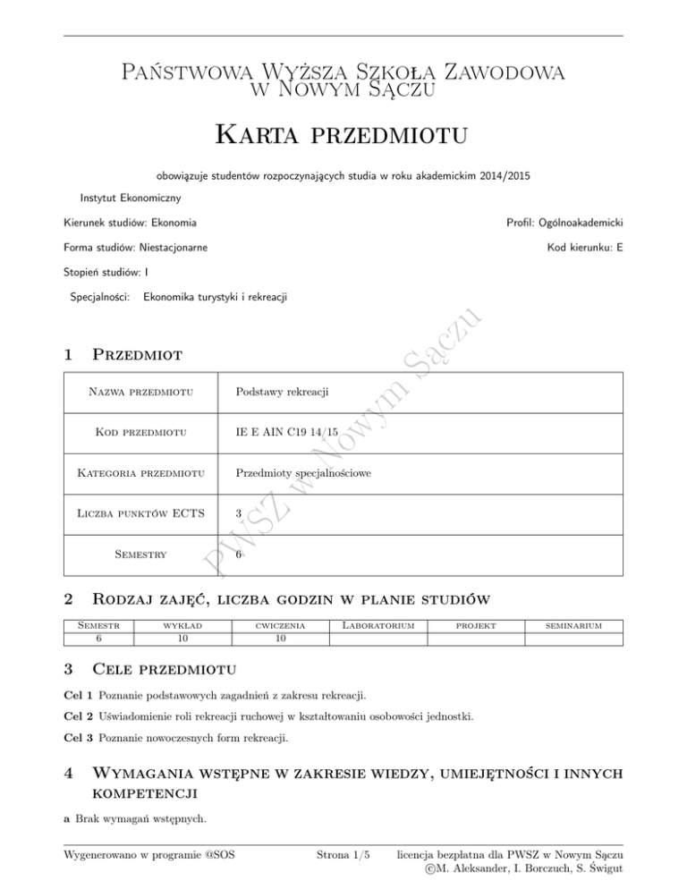 Państwowa Wyższa Szkola Zawodowa w Nowym Sa˛czu Karta przedmiotu obowia˛zuje studentów rozpoczynaja˛cych studia w roku akademickim 2014/2015 Instytut Ekonomiczny Kierunek studiów: Ekonomia Profil: Ogólnoakademicki Forma studiów: Niestacjonarne Kod kierunku: E Stopień studiów: I Nazwa przedmiotu Podstawy rekreacji m Przedmiot No wy 1 Ekonomika turystyki i rekreacji Sa˛ cz u Specjalności: IE E AIN C19 14/15 Przedmioty specjalnościowe Liczba punktów ECTS w Kategoria przedmiotu SZ Kod przedmiotu 2 6 Rodzaj zaje˛ć, liczba godzin w planie studiów Semestr 6 3 PW Semestry 3 wyklad 10 cwiczenia 10 Laboratorium projekt seminarium Cele przedmiotu Cel 1 Poznanie podstawowych zagadnień z zakresu rekreacji. Cel 2 Uświadomienie roli rekreacji ruchowej w ksztaltowaniu osobowości jednostki. Cel 3 Poznanie nowoczesnych form rekreacji. 4 Wymagania wste˛pne w zakresie wiedzy, umieje˛tności i innych kompetencji a Brak wymagań wste˛pnych. Wygenerowano w programie @SOS Strona 1/5 licencja bezplatna dla PWSZ w Nowym Sa˛czu c M. Aleksander, I. Borczuch, S. Świgut Państwowa Wyższa Szkola Zawodowa w Nowym Sa˛czu Efekty ksztalcenia 5 EK1 Wiedza: Student definiuje i objaśnia podstawowe poje˛cia z zakresu rekreacji. EK2 Wiedza: Student opisuje role˛ rekreacji w ksztaltowaniu osobowości jednostki. EK3 Wiedza: Student przedstawia nowoczesne formy rekreacji. Treści programowe Lp W1 W2 W3 W4 C2 C3 C4 C5 7 w SZ C1 cwiczenia Tematyka zaje˛ć Opis szczególowy bloków tematycznych Formy body&mind, trening funkcjonalny oraz ćwiczenia relaksacyjne nowym trendem w fitnessie. Techniki relaksacyjne jako sposób na spe˛dzenie wolnego czasu, redukcje˛ stresu. Teoria i praktyka wybranych metod psychoregulacyjnych. Ksztaltowanie sily na zaje˛ciach rekreacyjnych. Trening obwodowy. Trening zdrowotny osób doroslych. Kontrola intensywności treningu z wykorzystaniem nowoczesnej aparatury. Przeciwwskazania do intensywnych wysilków fizycznych. Razem PW Lp No wy m W5 wyklad Tematyka zaje˛ć Opis szczególowy bloków tematycznych Podstawowe poje˛cia z zakresu rekreacji. Poje˛cie czasu wolnego. Zadania, cele i funkcje rekreacji ruchowej. Poje˛cie sprawności fizycznej i zdolności motorycznych. Podstawy wysilku fizycznego. Zasady oraz struktura jednostki treningu. Typy treningu i formy ćwiczeń. Ksztaltowanie wytrzymalości na zaje˛ciach rekreacyjnych. Wprowadzenie do nowoczesnych form rekreacji. Zapoznanie studentów z różnorodnymi nowoczesnymi formami rekreacji - wspinaczka skalkowa, nurkowanie, slackline.Nowoczesne formy treningów: jukari, trx, crossfit, flexi bar. Humanistyczne podstawy rekreacji. Rola rekreacji w ksztaltowaniu osobowości czlowieka. Razem Sa˛ cz u 6 Liczba godzin 1 2 2 4 1 10 Liczba godzin 2 3 1 2 2 10 Metody dydaktyczne M1 Prezentacje multimedialne M2 Wyklady M3 Pokaz Wygenerowano w programie @SOS Strona 2/5 licencja bezplatna dla PWSZ w Nowym Sa˛czu c M. Aleksander, I. Borczuch, S. Świgut Państwowa Wyższa Szkola Zawodowa w Nowym Sa˛czu 8 Obcia˛żenie praca˛ studenta Średnia liczba godzin na zrealizowanie aktywności Forma aktywności 9 Sa˛ cz u Godziny kontaktowe z nauczycielem akademickim, w tym: Godziny wynikaja˛ce z planu studiów 20 Konsultacje przedmiotowe 2 Egzaminy i zaliczenia w sesji 1 Godziny bez udzialu nauczyciela akademickiego wynikaja˛ce z nakladu pracy studenta, w tym: Przygotowanie sie˛ do zaje˛ć, w tym studiowanie zalecanej literatury 40 Opracowanie wyników 12 Przygotowanie raportu, projektu, prezentacji, dyskusji 0 Sumaryczna liczba godzin dla przedmiotu wynikaja˛ca z 75 calego nakladu pracy studenta Sumaryczna liczba punktów ECTS dla przedmiotu 3 Sposoby oceny Ocena formuja˛ca m F1 Kolokwium No wy F2 Projekt zespolowy Efekt ksztalcenia 1 Na ocene˛ 3 Na ocene˛ 4 Na ocene˛ 5 Na ocene˛ 3 SZ Student rozróżnia podstawowe poje˛cia z zakresu rekreacji,ale nie w pelni je rozumie. wyklad, cwiczenia PW Na ocene˛ 3 Na ocene˛ 4 Na ocene˛ 5 Miejsce weryfikacji w Kryteria oceny Student rozpoznaje poje˛cia z zakresu rekreacji, definiuje je jednoznacznie, pojawiaja˛ sie˛ niewielkie uchybienia. Student doskonale orientuje sie˛ w poje˛ciach z zakresu rekreacji, bez problemów je definiuje, podaje przyklady. Efekt ksztalcenia 2 Student identyfikuje ogólnie role˛ rekreacji w ksztaltowaniu osobowości czlowieka, nie w pelni ja˛ rozumie. Student charakteryzuje role˛ rekreacji w ksztaltowaniu osobowości czlowieka, nie uwzgle˛dnia wszystkich aspektów. Student w pelni tlumaczy role˛ rekreacji w ksztaltowaniu osobowości czlowieka, podaje też przyklady. Efekt ksztalcenia 3 Student opisuje nowoczesne rekreacji, zdarzaja˛ sie˛ ble˛dy. Wygenerowano w programie @SOS Miejsce weryfikacji wyklad, cwiczenia Miejsce weryfikacji formy wyklad, cwiczenia Strona 3/5 Opis weryfikacji EK 1 50% ocena z egzaminu + 25% ocena z kolokwium + 25% ocena z projektu zespolowego Opis weryfikacji EK 2 50% ocena z egzaminu + 25% ocena z kolokwium + 25% ocena z projektu zespolowego Opis weryfikacji EK 3 50% ocena z egzaminu + 25% ocena z kolokwium + 25% ocena z projektu zespolowego licencja bezplatna dla PWSZ w Nowym Sa˛czu c M. Aleksander, I. Borczuch, S. Świgut Państwowa Wyższa Szkola Zawodowa w Nowym Sa˛czu Na ocene˛ 4 Na ocene˛ 5 Student charakteryzuje nowoczesne formy rekreacji, rozróżnia poszczególne formy, niektóre mu sie˛ myla˛. Student perfekcyjnie rozróżnia i szczególowo opisuje poszczególne nowoczesne formy rekreacji. Ocena do indeksu (ocena podsumowuja˛ca) średnia ocen z wszystkich efektów Warunki zaliczenia przedmiotu Macierz realizacji przedmiotu Cele przedmiotu E_W12 Cel1 E_K01 EK3 E_W12, E_K01 Metody dydaktyczne W1, W2, W3, C3, C4 W1, W2, W3, W4, W5, C1, C2, C3, C4, C5 W4, C1, C2 M1, M2 Cel2 Cel2, Cel3 M1, M2, M3 M1, M2, M3 11 PW SZ EK2 Treści programowe m Odniesienie do efektów kierunkowych No wy Efekty ksztalcenia dla przedmiotu EK1 w 10 Sa˛ cz u a Student zostaje dopuszczony do egzaminu po zaliczeniu ćwiczeń. Na z