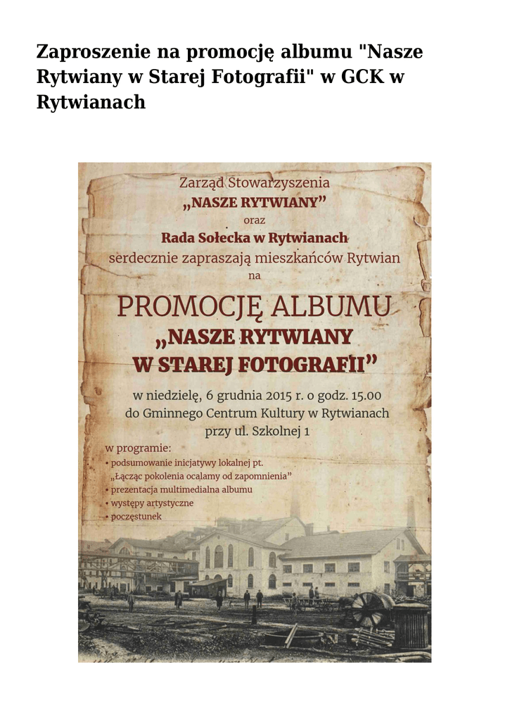 Zaproszenie na promocję albumu "Nasze Rytwiany w Starej Fotografii"