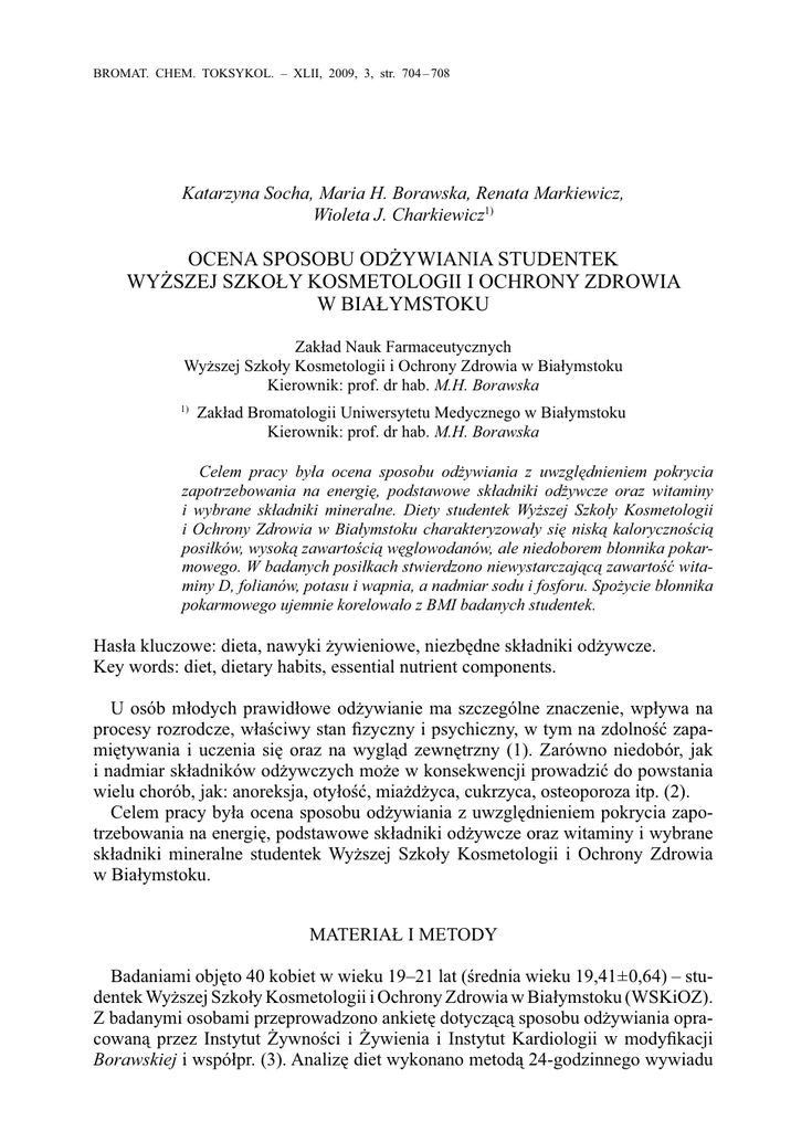 BROMAT. CHEM. TOKSYKOL. – XLII, 2009, 3, str. 704 – 708 Katarzyna Socha, Maria H. Borawska, Renata Markiewicz, Wioleta J. Charkiewicz1) OCENA SPOSOBU ODŻYWIANIA STUDENTEK WYŻSZEJ SZKOŁY KOSMETOLOGII I OCHRONY ZDROWIA W BIAŁYMSTOKU Zakład Nauk Farmaceutycznych Wyższej Szkoły Kosmetologii i Ochrony Zdrowia w Białymstoku Kierownik: prof. dr hab. M.H. Borawska 1) Zakład Bromatologii Uniwersytetu Medycznego w Białymstoku Kierownik: prof. dr hab. M.H. Borawska Celem pracy była ocena sposobu odżywiania z uwzględnieniem pokrycia zapotrzebowania na energię, podstawowe składniki odżywcze oraz witaminy i wybrane składniki mineralne. Diety studentek Wyższej Szkoły Kosmetologii i Ochrony Zdrowia w Białymstoku charakteryzowały się niską kalorycznością posiłków, wysoką zawartością węglowodanów, ale niedoborem błonnika pokarmowego. W badanych posiłkach stwierdzono niewystarczającą zawartość witaminy D, folianów, potasu i wapnia, a nadmiar sodu i fosforu. Spożycie błonnika pokarmowego ujemnie korelowało z BMI badanych studentek. Hasła kluczowe: dieta, nawyki żywieniowe, niezbędne składniki odżywcze. Key words: diet, dietary habits, essential nutrient components. U osób młodych prawidłowe odżywianie ma szczególne znaczenie, wpływa na procesy rozrodcze, właściwy stan fizyczny i psychiczny, w tym na zdolność zapamiętywania i uczenia się oraz na wygląd zewnętrzny (1). Zarówno niedobór, jak i nadmiar składników odżywczych może w konsekwencji prowadzić do powstania wielu chorób, jak: anoreksja, otyłość, miażdżyca, cukrzyca, osteoporoza itp. (2). Celem pracy była ocena sposobu odżywiania z uwzględnieniem pokrycia zapotrzebowania na energię, podstawowe składniki odżywcze oraz witaminy i wybrane składniki mineralne studentek Wyższej Szkoły Kosmetologii i Ochrony Zdrowia w Białymstoku. MATERIAŁ I METODY Badaniami objęto 40 kobiet w wieku 19–21 lat (średnia wieku 19,41 ± 0,64) – studentek Wyższej Szkoły Kosmetologii i Ochrony Zdrowia w Białymstoku (WSKiOZ). Z badanymi osobami przeprowadzono ankietę dotyczącą sposobu odżywiania opracowaną przez Instytut Żywności i Żywienia i Instytut Kardiologii w modyfikacji Borawskiej i współpr. (3). Analizę diet wykonano metodą 24-godzinnego wywiadu Nr 3 705 Ocena sposobu żywienia studentek WSKiOZ w Białymstoku żywieniowego z użyciem programu komputerowego Dieta 2. Analizę statystyczną wyników opracowano przy pomocy programu komputerowego Statistica v.6.1. WYNIKI I ICH OMÓWIENIE Wskaźnik masy ciała (BMI) badanych studentek wynosił średnio 21,86 ± 3,08 (od 16,94 do 30,47). Niedożywienie (BMI poniżej 18,5) stwierdzono u 8% kobiet, nadwagę (BMI powyżej 25) i otyłość (BMI powyżej 30) u odpowiednio, 10% i 5% badanych. 77% studentek wykazywało prawidłową masę ciała. Kaloryczność spożywanych diet wynosiła średnio 1473,3 ± 561,1 kcal, co stanowi 61% pokrycia zapotrzebowania energetycznego i wskazuje na duże tendencje do odchudzania się w badanej grupie kobiet. Zbyt niską wartość zapotrzebowania energetycznego w dietach studentów stwierdzili też inni autorzy (4, 5). Średnie spożycie białka wynosiło 57,2 ± 20,8 g, co mieściło się w granicach zalecanego zapotrzebowania (33–58 g). 16% energii pochodziło z białka, co stanowi 107% normy (6). Średnie spożycie tłuszczu w diecie wynosiło 52,9 ± 23,0 g, co mieści się w dolnych granicach zalecanych norm dla kobiet w 19 roku życia i powyżej przy umiarkowanej aktywności fizycznej: 51–98 g (6). Średni procent energii pochodzącej z tłuszczów wynosił 31,9 ± 6,8, co nieznacznie przewyższało zalecane normy (25–30% energii z tłuszczów). Badane studentki spożywały średnio 207,0 ± 85,9 węglowodanów, co znacznie przewyższa średnie zapotrzebowanie (100g/dobę), jednak spożycie błonnika pokarmowego było niewystarczające w stosunku do zalecanych norm: 20–40 g/dobę (6) i wynosiło średnio 16,9 ± 5,9 g. Niskie spożycie błonnika wśród studentów wykazała również Przysiężna i współpr. (7). Stwierdzono istotną ujemną korelację (r = –0,32; p < 0,046) pomiędzy spożyciem błonnika a BMI badanych kobiet. Procent energii pochodzący z węglowodanów wynosił średnio 51,9, co stanowi 94% w stosunku do zalecanych norm (55%). Wyniki przedstawiono w tabeli I. Tabela I. Kaloryczność i zawartość składników odżywczych w dietach (n = 40) studentek WSKiOZ Table I. The content of energy and essentials nutrient components in diets (n = 40) of students WSKiOZ Energia (kcal) Średnia Min.–max. SD Norma EAR 1473,3 494,1–2920,6 561,1 2400* Białko (g) 57,2 20,0–111,3 20,8 33–58 Białko zwierzęce (g) 38,6 10,0–80,80 16,3 – Tłuszcze (g) 52,9 16,4–110,3 23,0 51–98 207,0 52,1–382,2 85,9 100 Błonnik pokarmowy (g) 16,9 4,9–28,6 5,9 20–40 % energii z białka 16,1 11,7–25,80 3,4 do 15 % energii z tłuszczów 31,9 16,4–45,60 6,8 25–30 % energii z węglowodanów 51,9 37,3–71,10 8,4 pow. 55 Węglowodany (g) EAR – poziom średniego zapotrzebowania grupy (6) * średnie zapotrzebowanie energetyczne dla kobiet w wieku 19–30 lat o umiarkowanej aktywności fizycznej (6) 706 Nr 3 K. Socha i inni Spożycie witaminy A w badanej grupie trzykrotnie przekraczało poziom średniego zapotrzebowania, ale wynikało to głównie z dużego spożycia beta-karotenu, ponieważ znaczna część studentek deklarowała częste i wysokie spożycie soków marchwiowych. Średnie spożycie witaminy E było nieznacznie niższe w stosunku do norm, natomiast spożycie witaminy C oraz witamin B1, B2, PP, B6 i B12 w dietach było wystarczające. U badanych studentek stwierdzono średnio 44% poziomu wystarczającego spożycia witaminy D (6), co może w późniejszym wieku skutkować ryzykiem osteoporozy oraz chorób neurodegeneracyjnych (8, 9). Stwierdzono również znaczny niedobór folianów – 66% poziomu średniego zapotrzebowania (6) dostarczanych z dietą, co jes