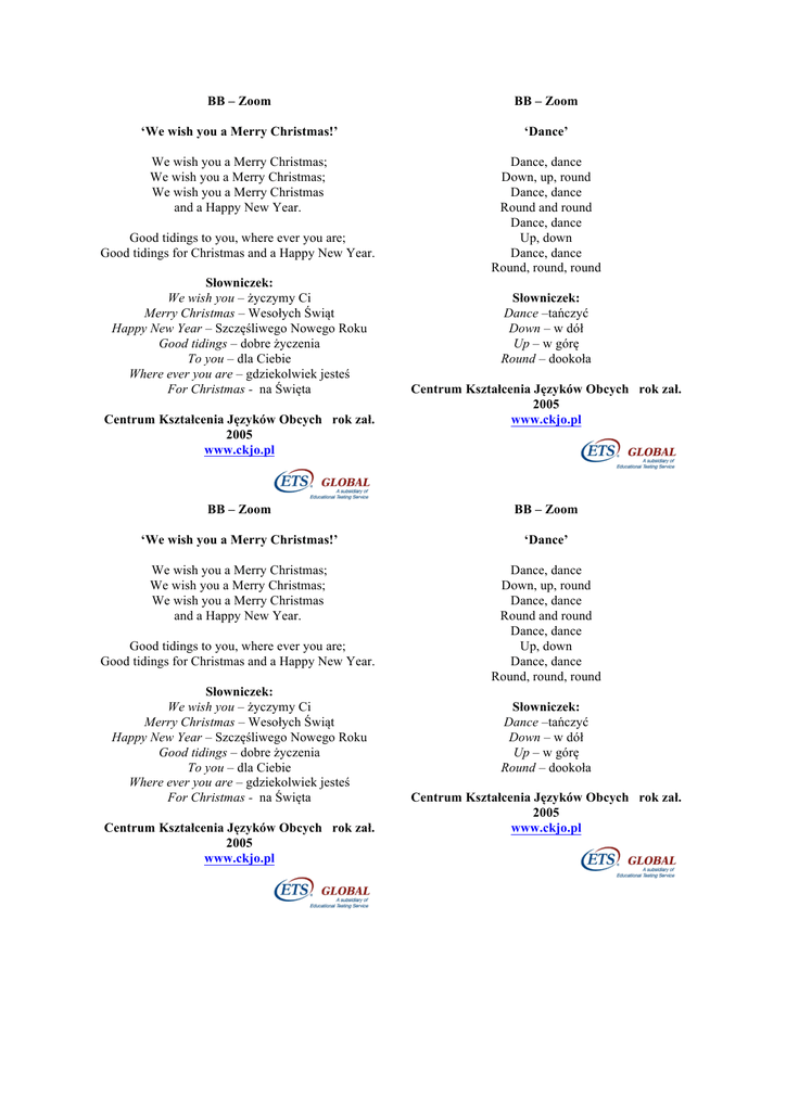 BB – Zoom BB – Zoom ‘We wish you a Merry Christmas!’ ‘Dance’ We wish you a Merry Christmas; We wish you a Merry Christmas; We wish you a Merry Christmas and a Happy New Year. Dance, dance Down, up, round Dance, dance Round and round Dance, dance Up, down Dance, dance Round, round, round Good tidings to you, where ever you are; Good tidings for Christmas and a Happy New Year. Słowniczek: We wish you – życzymy Ci Merry Christmas – Wesołych Świąt Happy New Year – Szczęśliwego Nowego Roku Good tidings – dobre życzenia To you – dla Ciebie Where ever you are – gdziekolwiek jesteś For Christmas - na Święta Centrum Kształcenia Języków Obcych rok zał. 2005 www.ckjo.pl Słowniczek: Dance –tańczyć Down – w dół Up – w górę Round – dookoła Centrum Kształcenia Języków Obcych rok zał. 2005 www.ckjo.pl BB – Zoom BB – Zoom ‘We wish you a Merry Christmas!’ ‘Dance’ We wish you a Merry Christmas; We wish you a Merry Christmas; We wish you a Merry Christmas and a Happy New Year. Dance, dance Down, up, round Dance, dance Round and round Dance, dance Up, down Dance, dance Round, round, round Good tidings to you, where ever you are; Good tidings for Christmas and a Happy New Year. Słowniczek: We wish you – życzymy Ci Merry Christmas – Wesołych Świąt Happy New Year – Szczęśliwego Nowego Roku Good tidings – dobre życzenia To you – dla Ciebie Where ever you are – gdziekolwiek jesteś For Christmas - na Święta Centrum Kształcenia Języków Obcych rok zał. 2005 www.ckjo.pl Słowniczek: Dance –tańczyć Down – w dół Up – w górę Round – dookoła Centrum Kształcenia Języków Obcych rok zał. 2005 www.ckjo.pl BB – Splish Splash BB – Splish Splash ‘We wish you a Merry Christmas!’ Flowers We wish you a Merry Christmas; We wish you a Merry Christmas; We wish you a Merry Christmas and a Happy New Year. I can see the flowers, I can see the trees I can hear the birds, I can hear the bees In the garden, in the garden, in the garden Good tidings to you, where ever you are; Good tidings for Christmas and a Happy New Year. Słowniczek: We wish you – życzymy Ci Merry Christmas – Wesołych Świąt Happy New Year – Szczęśliwego Nowego Roku Good tidings – dobre życzenia To you – dla Ciebie Where ever you are – gdziekolwiek jesteś For Christmas - na Święta Słowniczek: I can see – widzę Flowers - kwiaty Trees – drzewa I can hear – słyszę Birds – ptaki Bees – pszczoły In the garden – w ogrodzie Centrum Kształcenia Języków Obcych rok zał. 2005 www.ckjo.pl Centrum Kształcenia Języków Obcych rok zał. 2005 www.ckjo.pl BB – Splish Splash BB – Splish Splash ‘We wish you a Merry Christmas!’ Flowers We wish you a Merry Christmas; We wish you a Merry Christmas; We wish you a Merry Christmas and a Happy New Year. I can see the flowers, I can see the trees I can hear the birds, I can hear the bees In the garden, in the garden, in the garden Good tidings to you, where ever you are; Good tidings for Christmas and a Happy New Year. Słowniczek: We wish you – życzymy Ci Merry Christmas – Wesołych Świąt Happy New Year – Szczęśliwego Nowego Roku Good tidings – dobre życzenia To you – dla Ciebie Where ever you are – gdziekolwiek jesteś For Christmas - na Święta Centrum Kształcenia Języków Obcych rok zał. 2005 www.ckjo.pl Słowniczek: I can see – widzę Flowers - kwiaty Trees – drzewa I can hear – słyszę Birds – ptaki Bees – pszczoły In the garden – w ogrodzie Centrum Kształcenia Języków Obcych rok zał. 2005 www.ckjo.pl