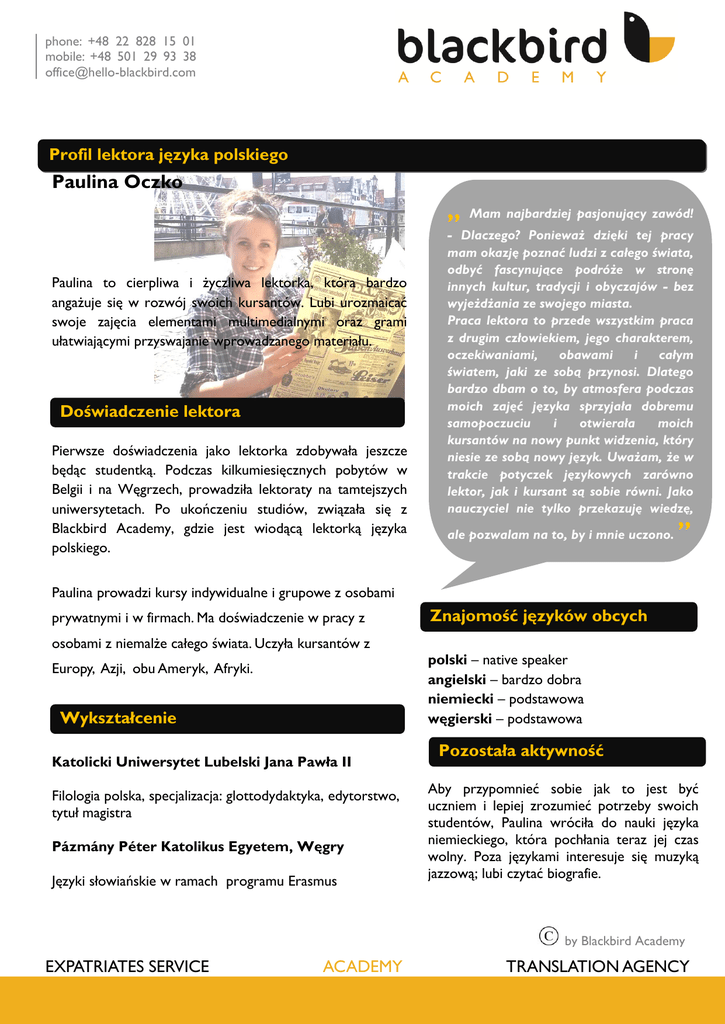 phone: +48 22 828 15 01 mobile: +48 501 29 93 38 [email protected] Profil lektora języka polskiego Paulina Oczko „ Paulina to cierpliwa i życzliwa lektorka, która bardzo angażuje się w rozwój swoich kursantów. Lubi urozmaicać swoje zajęcia elementami multimedialnymi oraz grami ułatwiającymi przyswajanie wprowadzanego materiału. Doświadczenie lektora Pierwsze doświadczenia jako lektorka zdobywała jeszcze będąc studentką. Podczas kilkumiesięcznych pobytów w Belgii i na Węgrzech, prowadziła lektoraty na tamtejszych uniwersytetach. Po ukończeniu studiów, związała się z Blackbird Academy, gdzie jest wiodącą lektorką języka polskiego. Mam najbardziej pasjonujący zawód! - Dlaczego? Ponieważ dzięki tej pracy mam okazję poznać ludzi z całego świata, odbyć fascynujące podróże w stronę innych kultur, tradycji i obyczajów - bez wyjeżdżania ze swojego miasta. Praca lektora to przede wszystkim praca z drugim człowiekiem, jego charakterem, oczekiwaniami, obawami i całym światem, jaki ze sobą przynosi. Dlatego bardzo dbam o to, by atmosfera podczas moich zajęć języka sprzyjała dobremu samopoczuciu i otwierała moich kursantów na nowy punkt widzenia, który niesie ze sobą nowy język. Uważam, że w trakcie potyczek językowych zarówno lektor, jak i kursant są sobie równi. Jako nauczyciel nie tylko przekazuję wiedzę, ale pozwalam na to, by i mnie uczono. ” Paulina prowadzi kursy indywidualne i grupowe z osobami prywatnymi i w firmach. Ma doświadczenie w pracy z osobami z niemalże całego świata. Uczyła kursantów z Europy, Azji, obu Ameryk, Afryki. Wykształcenie Katolicki Uniwersytet Lubelski Jana Pawła II Filologia polska, specjalizacja: glottodydaktyka, edytorstwo, tytuł magistra Pázmány Péter Katolikus Egyetem, Węgry Języki słowiańskie w ramach programu Erasmus Znajomość języków obcych polski – native speaker angielski – bardzo dobra niemiecki – podstawowa węgierski – podstawowa Pozostała aktywność ” . Aby przypomnieć sobie jak to jest być uczniem i lepiej zrozumieć potrzeby swoich studentów, Paulina wróciła do nauki języka niemieckiego, która pochłania teraz jej czas wolny. Poza językami interesuje się muzyką jazzową; lubi czytać biografie. by Blackbird Academy EXPATRIATES SERVICE ACADEMY TRANSLATION AGENCY