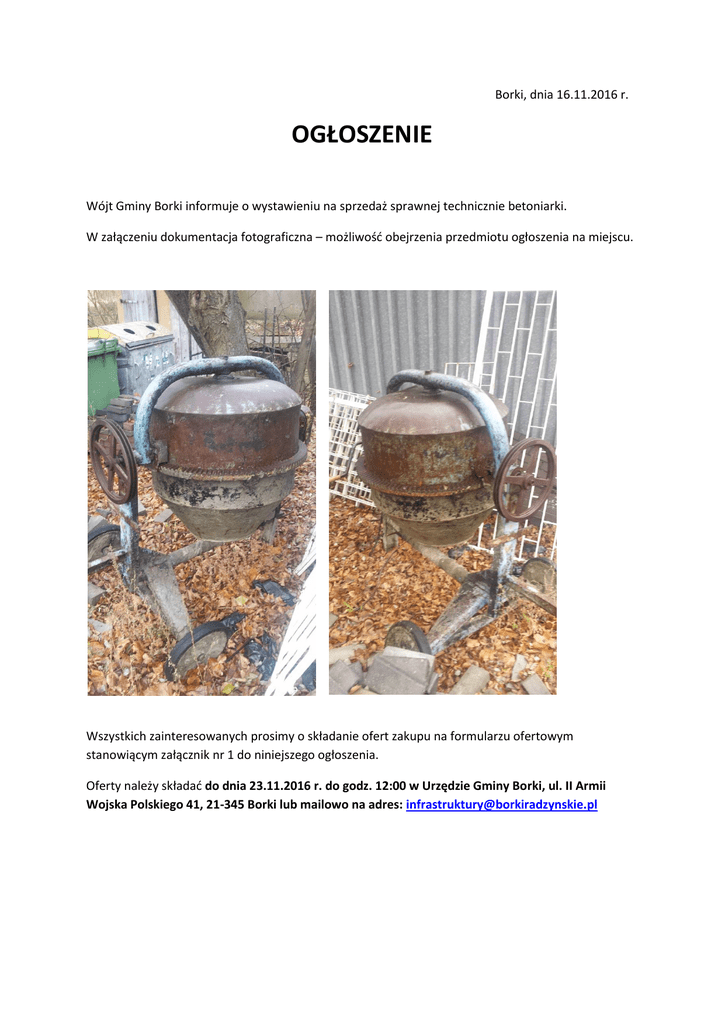 Borki, dnia 16.11.2016 r. OGŁOSZENIE Wójt Gminy Borki informuje o wystawieniu na sprzedaż sprawnej technicznie betoniarki. W załączeniu dokumentacja fotograficzna – możliwość obejrzenia przedmiotu ogłoszenia na miejscu. Wszystkich zainteresowanych prosimy o składanie ofert zakupu na formularzu ofertowym stanowiącym załącznik nr 1 do niniejszego ogłoszenia. Oferty należy składać do dnia 23.11.2016 r. do godz. 12:00 w Urzędzie Gminy Borki, ul. II Armii Wojska Polskiego 41, 21-345 Borki lub mailowo na adres: [email protected] Zał. nr 1 OFERTA NA ZAKUP BETONIARKI Imię i Nazwisko ………………………………………… ………………………………………… (data) Adres: ……………………………………….. ……………………………………….. Oferuję cenę ……………………………………. zł brutto (słownie:……………………………………………………………………………………………………….) ……………………………………….. Podpis