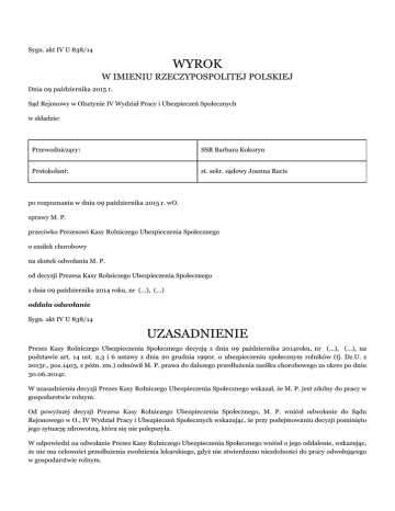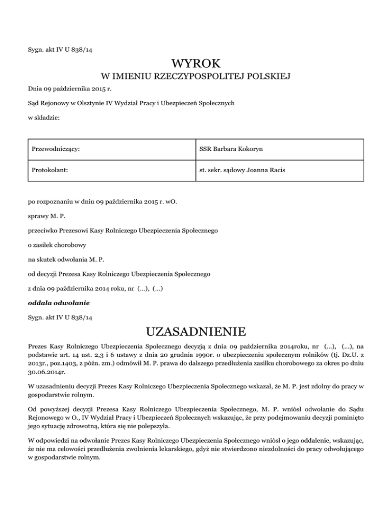 Sygn. akt IV U 838/14 WYROK W IMIENIU RZECZYPOSPOLITEJ POLSKIEJ Dnia 09 października 2015 r. Sąd Rejonowy w Olsztynie IV Wydział Pracy i Ubezpieczeń Społecznych w składzie: Przewodniczący: SSR Barbara Kokoryn Protokolant: st. sekr. sądowy Joanna Racis po rozpoznaniu w dniu 09 października 2015 r. wO. sprawy M. P. przeciwko Prezesowi Kasy Rolniczego Ubezpieczenia Społecznego o zasiłek chorobowy na skutek odwołania M. P. od decyzji Prezesa Kasy Rolniczego Ubezpieczenia Społecznego z dnia 09 października 2014 roku, nr (...), (...) oddala odwołanie Sygn. akt IV U 838/14 UZASADNIENIE Prezes Kasy Rolniczego Ubezpieczenia Społecznego decyzją z dnia 09 października 2014roku, nr (...), (...), na podstawie art. 14 ust. 2,3 i 6 ustawy z dnia 20 grudnia 1990r. o ubezpieczeniu społecznym rolników (tj. Dz.U. z 2013r., poz.1403, z późn. zm.) odmówił M. P. prawa do dalszego przedłużenia zasiłku chorobowego za okres po dniu 30.06.2014r. W uzasadnieniu decyzji Prezes Kasy Rolniczego Ubezpieczenia Społecznego wskazał, że M. P. jest zdolny do pracy w gospodarstwie rolnym. Od powyższej decyzji Prezesa Kasy Rolniczego Ubezpieczenia Społecznego, M. P. wniósł odwołanie do Sądu Rejonowego w O., IV Wydział Pracy i Ubezpieczeń Społecznych wskazując, że przy podejmowaniu decyzji pominięto jego sytuację zdrowotną, która się nie polepszyła. W odpowiedzi na odwołanie Prezes Kasy Rolniczego Ubezpieczenia Społecznego wniósł o jego oddalenie, wskazując, że nie ma celowości przedłużenia zwolnienia lekarskiego, gdyż nie stwierdzono niezdolności do pracy odwołującego w gospodarstwie rolnym. Sąd ustalił, co następuje: M. P. prowadzi gospodarstwo rolne w (...), Gm. P.. W 2008r. M. P. przebył złamanie podstawy czaszki. Okresowo leczy się psychiatrycznie w PZP w S. z powodu stanów lękowych oraz bólu żołądka. Odwołujący skarży się na bóle w okolicy L-S z promieniowaniem do lewej kończyny dolnej. W wymienionym roku M. P. przebywał w szpitalu i sanatorium. Od 2013r. po dźwignięciu u odwołującego nasiliły się bóle kręgosłupa. Obecnie kręgosłup szyjny M. P. jest w pełni ruchomy i bezbolesny, w odcinku L-S ma nieco wzmożone napięcie mięśni przykręgosłupowych, zgięcie ograniczone do przodu do połowy łydek. Występuje objaw L.’a(+) po stronie lewej. Kończyny dolne i górne odwołującego mają prawidłowe obrysy, z pełną ruchomością w stawach. Odwołujący ma prawidłowe czucie i ukrwienie na obwodzie. W maju 2013r. M. P. doznał skręcenia stawu skokowego lewego, nosi na lewym stawie skokowym opatrunek, ma niewielki obrzęk okolicy stawu po ww. stronie. Używa kuli łokciowej. W okresie od dnia 18.05.2013r. do dnia 13.11.2013r. M. P. przebywał przez kolejnych 180 dni na zwolnieniu lekarskim wystawionym przez lekarza rodzinnego i specjalistę ortopedę traumatologa. Następnie na podstawie orzeczenia Lekarza Rzeczoznawcy zwolnienie lekarskie zostało mu przedłużone o kolejne 229 dni do dnia 30.06.2014r. Łącznie uznano, że odwołujący był niezdolny do pracy przez 409dni. (dowód: akta rentowe – zwolnienie lekarskie k:74-76,79,81-82,84-87 dokumentacja medyczna w kopercie- k:10, opinia lekarska –k.20-21) Sąd zważył, co następuje: Odwołanie M. P. jest bezzasadne i nie zasługuje na uwzględnienie. Sąd dał wiarę przedłożonym przez M. P. dokumentom, gdyż druga ze stron nie kwestionowała ich prawdziwości. Zakres sporu pomiędzy stronami sprowadzał się do ustalenia - czy ubezpieczony był zdolny czy niezdolny do pracy w gospodarstwie rolnym po dniu 30.06.2014r. Organ rentowy kwestionował prawo M. P. do przedłużenia zasiłku chorobowego za okres od dnia 01.07.2014r. Zgodnie bowiem z art. 14 ust. 1, 2,3 4 oraz 6 w zw. z art. 46 ustawy z dnia 20 grudnia 1990r. o ubezpieczeniu społecznym rolników (tj. Dz.U. z 2015r., poz.704) zasiłek chorobowy przysługuje ubezpieczonemu za okres czasowej niezdolności do pracy, jednak nie dłużej niż przez 180dni. Jeżeli po wyczerpaniu zasiłku chorobowego, ubezpieczony nadal jest niezdolny do pracy, a w wyniku dalszego leczenia i rehabilitacji rokuje odzyskanie zdolności do pracy, zasiłek chorobowy przedłuża się na okres niezbędny do przywrócenia zdolności do pracy, jednak nie dłużej niż o dalsze 360dni. Zasiłek chorobowy z tytułu przedłużonej czasowej niezdolności do pracy, trwającej dłużej niż 180 dni przyznaje się i wypłaca na podstawie orzeczenia Lekarza Rzeczoznawcy Kasy w pierwszej instancji i komisji lekarskiej Kasy w drugiej instancji. Taka właśnie sytuacja miała miejsce w niniejszej sprawie. Odwołujący przedłożył zwolnienia lekarskie i wykorzystał okres 180 dni przewidziany na odzyskanie zdolności do pracy. Następnie w okresie 229dni przebywał na mocy orzeczenia na przedłużonym zwolnieniu lekarskim. Łącznie wykorzystał już 409 dni z 540 dni wynikających z ww. przepisów. Przy złożeniu kolejnego wniosku o przyznanie dalszego przedłużenia okresu wypłaty zasiłku chorobowego orzeczeniem Lekarza Rzeczoznawcy Kasy i Komisji Lekarskiej Kasy w drugiej instancji został uznany za zdolnego do pracy. M. P. nie zgodził się z wymienionymi orzeczeniami. Sąd dopuścił dowód z opinii biegłego. Odwołujący zapoznając się z treścią sporządzonej przez biegłego opinii stwierdził, że nie zgadza się z nią. Wskazał, że nadal cierpi na problemy z kręgosłupem. Podał, że ma nawroty dolegliwości, które uniemożliwiają mu schylanie się. Często po pracy w polu przebywa w łóżku, bierze leki i zastrzyki. ( pismo - k.29) Z opinii wynika, że u M. P. występuje objaw Lassegue’a(+) po stronie lewej. Obecnie kręgosłup szyjny odwołującego jest w pełni ruchomy i bezbolesny, w odcinku L-S ma nieco wzmożone napięcie mięśni przykręgosłupowych, zgięcie ograniczone do przodu do połowy łydek. Kończyny dolne i górne odwołującego mają prawidłowe obrysy, z pełną ruchomością w stawach. Odwołujący ma prawi