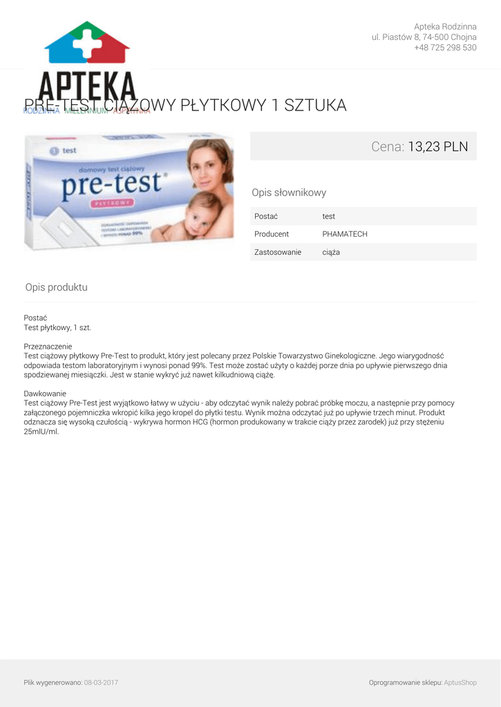 Apteka Rodzinna ul. Piastów 8, 74-500 Chojna +48 725 298 530 PRE-TEST CIĄŻOWY PŁYTKOWY 1 SZTUKA Cena: 13,23 PLN Opis słownikowy Postać test Producent PHAMATECH Zastosowanie ciąża Opis produktu Postać Test płytkowy, 1 szt. Przeznaczenie Test ciążowy płytkowy Pre-Test to produkt, który jest polecany przez Polskie Towarzystwo Ginekologiczne. Jego wiarygodność odpowiada testom laboratoryjnym i wynosi ponad 99%. Test może zostać użyty o każdej porze dnia po upływie pierwszego dnia spodziewanej miesiączki. Jest w stanie wykryć już nawet kilkudniową ciążę. Dawkowanie Test ciążowy Pre-Test jest wyjątkowo łatwy w użyciu - aby odczytać wynik należy pobrać próbkę moczu, a następnie przy pomocy załączonego pojemniczka wkropić kilka jego kropel do płytki testu. Wynik można odczytać już po upływie trzech minut. Produkt odznacza się wysoką czułością - wykrywa hormon HCG (hormon produkowany w trakcie ciąży przez zarodek) już przy stężeniu 25mlU/ml. Plik wygenerowano: 08-03-2017 Powered by TCPDF (www.tcpdf.org) Oprogramowanie sklepu: AptusShop