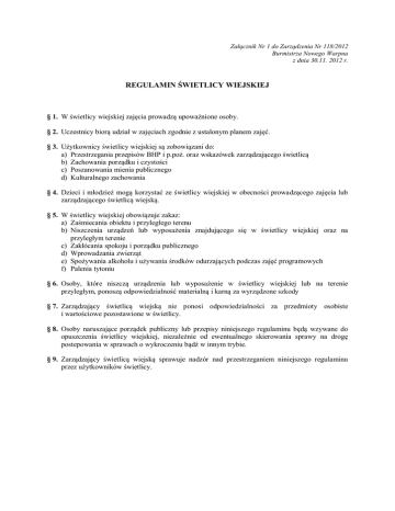 Załącznik Nr 1 do Zarządzenia Nr 118/2012 Burmistrza Nowego Warpna z dnia 30.11. 2012 r. REGULAMIN ŚWIETLICY WIEJSKIEJ § 1. W świetlicy wiejskiej zajęcia prowadzą upoważnione osoby. § 2. Uczestnicy biorą udział w zajęciach zgodnie z ustalonym planem zajęć. § 3. Użytkownicy świetlicy wiejskiej są zobowiązani do: a) Przestrzegania przepisów BHP i p.poż. oraz wskazówek zarządzającego świetlicą b) Zachowania porządku i czystości c) Poszanowania mienia publicznego d) Kulturalnego zachowania § 4. Dzieci i młodzież mogą korzystać ze świetlicy wiejskiej w obecności prowadzącego zajęcia lub zarządzającego świetlicą wiejską. § 5. W świetlicy wiejskiej obowiązuje zakaz: a) Zaśmiecania obiektu i przyległego terenu b) Niszczenia urządzeń lub wyposażenia znajdującego się w świetlicy wiejskiej oraz na przyległym terenie c) Zakłócania spokoju i porządku publicznego d) Wprowadzania zwierząt e) Spożywania alkoholu i używania środków odurzających podczas zajęć programowych f) Palenia tytoniu § 6. Osoby, które niszczą urządzenia lub wyposażenie w świetlicy wiejskiej lub na terenie przyległym, ponoszą odpowiedzialność materialną i karną za wyrządzone szkody § 7. Zarządzający świetlicą wiejską nie ponosi odpowiedzialności za przedmioty osobiste i wartościowe pozostawione w świetlicy. § 8. Osoby naruszające porządek publiczny lub przepisy niniejszego regulaminu będą wzywane do opuszczenia świetlicy wiejskiej, niezależnie od ewentualnego skierowania sprawy na drogę postepowania w sprawach o wykroczeniu bądź w innym trybie. § 9. Zarządzający świetlicą wiejską sprawuje nadzór nad przestrzeganiem niniejszego regulaminu przez użytkowników świetlicy.