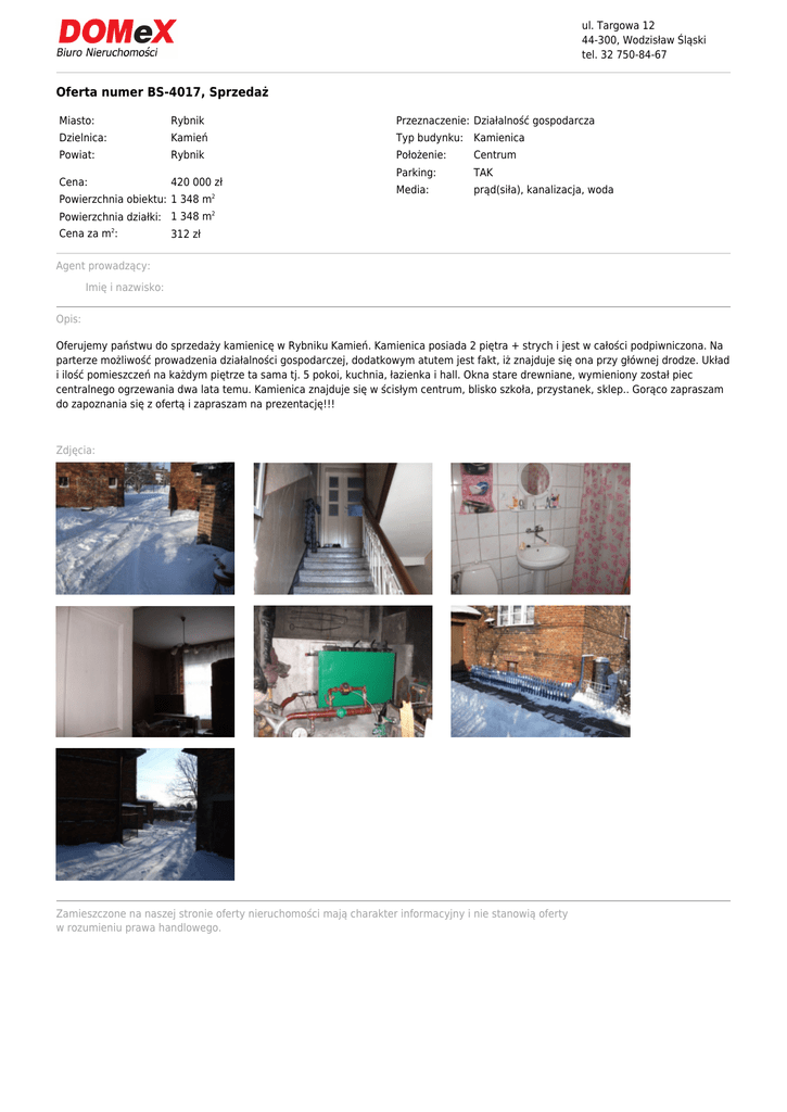 ul. Targowa 12 44-300, Wodzisław Śląski tel. 32 750-84-67 Oferta numer BS-4017, Sprzedaż Miasto: Rybnik Przeznaczenie: Działalność gospodarcza Dzielnica: Kamień Typ budynku: Kamienica Powiat: Rybnik Położenie: Centrum Parking: TAK Media: prąd(siła), kanalizacja, woda Cena: 420 000 zł Powierzchnia obiektu: 1 348 m2 Powierzchnia działki: 1 348 m2 Cena za m2: 312 zł Agent prowadzący: Imię i nazwisko: Opis: Oferujemy państwu do sprzedaży kamienicę w Rybniku Kamień. Kamienica posiada 2 piętra + strych i jest w całości podpiwniczona. Na parterze możliwość prowadzenia działalności gospodarczej, dodatkowym atutem jest fakt, iż znajduje się ona przy głównej drodze. Układ i ilość pomieszczeń na każdym piętrze ta sama tj. 5 pokoi, kuchnia, łazienka i hall. Okna stare drewniane, wymieniony został piec centralnego ogrzewania dwa lata temu. Kamienica znajduje się w ścisłym centrum, blisko szkoła, przystanek, sklep.. Gorąco zapraszam do zapoznania się z ofertą i zapraszam na prezentację!!! Zdjęcia: Zamieszczone na naszej stronie oferty nieruchomości mają charakter informacyjny i nie stanowią oferty w rozumieniu prawa handlowego.