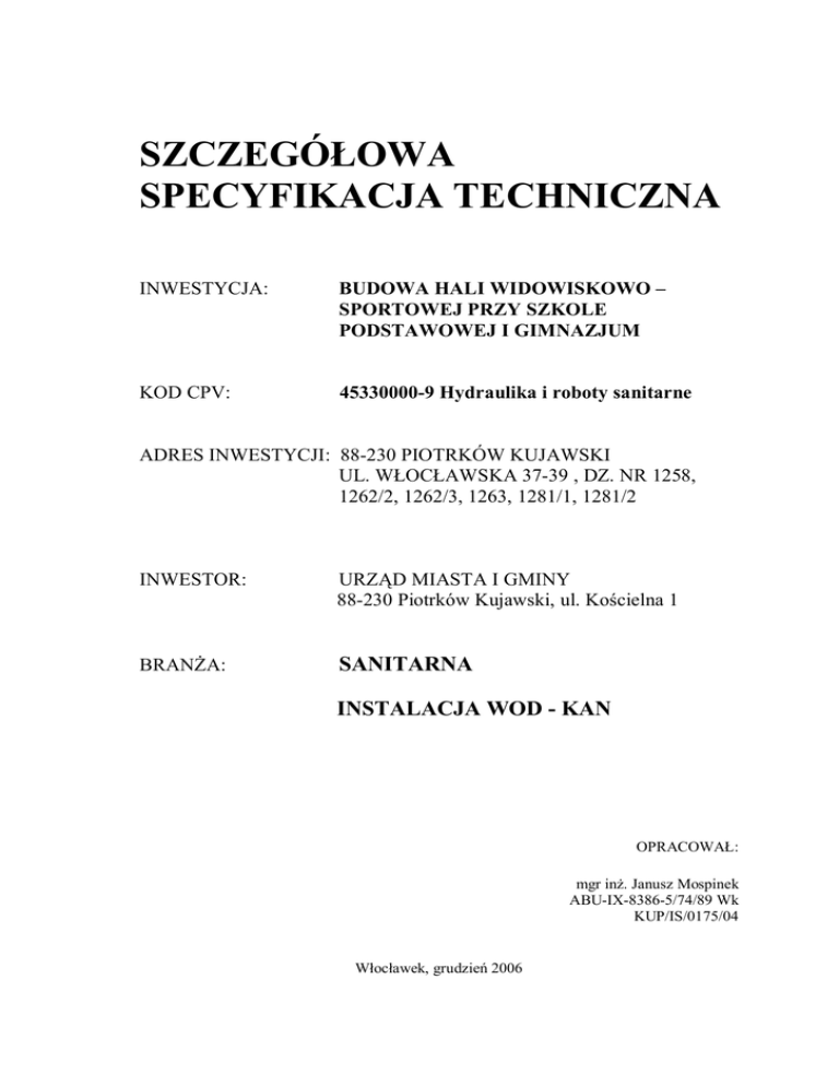 SZCZEGÓŁOWA SPECYFIKACJA TECHNICZNA INWESTYCJA: BUDOWA HALI WIDOWISKOWO – SPORTOWEJ PRZY SZKOLE PODSTAWOWEJ I GIMNAZJUM KOD CPV: 45330000-9 Hydraulika i roboty sanitarne ADRES INWESTYCJI: 88-230 PIOTRKÓW KUJAWSKI UL. WŁOCŁAWSKA 37-39 , DZ. NR 1258, 1262/2, 1262/3, 1263, 1281/1, 1281/2 INWESTOR: URZĄD MIASTA I GMINY 88-230 Piotrków Kujawski, ul. Kościelna 1 BRANŻA: SANITARNA INSTALACJA WOD - KAN OPRACOWAŁ: mgr inż. Janusz Mospinek ABU-IX-8386-5/74/89 Wk KUP/IS/0175/04 Włocławek, grudzień 2006 SPECYFIKACJA TECHNICZNA BUDOWY HALI WIDOWISKOWO – SPORTOWEJ PRZY SZKOLE PODSTAWOWEJ I GIMNAZJUM UL. WŁOCŁAWSKA 37-39 W PIOTRKOWIE KUJAWSKIM I. WSTĘP 1. Przedmiot SST. Przedmiotem SST są wymagania techniczne dotyczące wykonania i odbioru robót instalacji sanitarnych związanych z realizacją budowy hali widowiskowo – sportowej przy Szkole Podstawowej i Gimnazjum w Piotrkowie Kujawskim. 2. Zakres stosowania SST. Szczegółowa specyfikacja techniczna jest stosowana jako dokument przetargowy i kontraktowy przy zleceniu i realizacji robót wymienionych w pkt.1. 3. Zakres robót objętych SST. Roboty sanitarne wewnętrzne: · Instalacja wewnętrzna wody zimnej, ciepłej, cyrkulacji, · Instalacja wewnętrzna kanalizacji sanitarnej · Instalacja przeciwpożarowa, Roboty, których dotyczy specyfikacja, obejmują wszystkie czynności umożliwiające i mające na celu wykonanie nowej, zmodernizowanej instalacji wodociągowokanalizacyjnej, wraz z wyposażeniem. dla projektowanej budowy sali widowiskowo – sportowej przy Szkole Podstawowej i Gimnazjum w Piotrkowie Kujawskim. Instalacje należy wykonać w dowiązaniu do istniejących instalacji wod-kan na poziomie piwnic i parteru.. Niniejsza specyfikacja techniczna związana jest z wykonaniem niżej wymienionych robót: · · · · · · · · włączenie do istniejących oraz projektowanych instalacji, montaż rurociągów, montaż armatury, montaż urządzeń sanitarnych montaż wyposażenia przeciwpożarowego badania instalacji, wykonanie izolacji termicznej, regulacja działania instalacji. Wszystkie instalacje mają być wykonane zgodnie z obowiązującymi przepisami, polskimi normami, prawem budowlanym (aktualnie obowiązującym), regułami techniki, warunkami technicznymi wykonania i odbioru oraz muszą być przygotowane do bezusterkowego odbioru przez SANEPID, PIP i PSP. 1 4. Ogólne wymagania. Wykonawca jest odpowiedzialny za realizację robót zgodnie z dokumentacją projektową, specyfikacją techniczną, poleceniami nadzoru autorskiego i inwestorskiego oraz zgodnie z art. 5, 22, 23 i 28 ustawy Prawo budowlane, „Warunkami technicznymi wykonania i odbioru sieci wodociągowych” COBRTI INSTAL, Warszawa 2001 i „Warunkami technicznymi wykonania i odbioru robót budowlano-montażowych. Tom II Instalacje sanitarne i przemysłowe”. Odstępstwa od projektu mogą dotyczyć jedynie dostosowania instalacji do wprowadzonych zmian konstrukcyjno-budowlanych, lub zastąpienia zaprojektowanych materiałów – w przypadku niemożliwości ich uzyskania – przez inne materiały lub elementy o zbliżonych charakterystykach i trwałości. Wszelkie zmiany i odstępstwa od zatwierdzonej dokumentacji technicznej nie mogą powodować obniżenia wartości funkcjonalnych i użytkowych instalacji, a jeżeli dotyczą zamiany materiałów i elementów określonych w dokumentacji technicznej na inne, nie mogą powodować zmniejszenia trwałości eksploatacyjnej. Roboty montażowe należy realizować zgodnie z „Warunkami technicznymi wykonania i odbioru robót budowlano-montażowych. Tom II Instalacje sanitarne i przemysłowe”, Polskimi Normami, oraz innymi przepisami dotyczącymi przedmiotowej instalacji. Wraz z zawartymi w kosztorysie przetargowym danymi odnośnie poszczególnych świadczeń uważa się za oczywiste przestrzeganie wszelkich norm technicznych oraz uznanych zasad techniki oraz prawidłowości montażu. Wytyczne techniczne zawarte w specyfikacji przetargowej mają priorytet wobec Projektu bądź przyjętych za ogólne wymagań minimalnych. Wszelkie urządzenia i części instalacji należy wyposażyć w oprzyrządowanie wymagane do ich nienagannej pracy i poprawnego serwisu w dalszym użytkowaniu. 5. Określenia podstawowe. · · · · Dziennik budowy – opatrzony pieczęcią zamawiającego zeszyt, z ponumerowanymi stronami, służący do notowania wydarzeń zaistniałych w czasie wykonywania zadania budowlanego, rejestrowania dokonywanych odbiorów robót, przekazywania poleceń i innej korespondencji pomiędzy Inspektorem Nadzoru, Wykonawcą i Projektantem. Kierownik budowy – osoba wyznaczona przez Wykonawcę, upoważniona do kierowania robotami i do występowania w jego imieniu w sprawach realizacji kontraktu. Przedmiar robót – opis robót w kolejności technologicznej ich wykonywania z określeniem ilości. Księga obmiarów – akceptowany przez Inspektora Nadzoru zeszyt z ponumerowanymi stronami służący do wpisywania przez Wykonawcę obmiaru dokonanych robót w formie wyliczeń, szkiców i ew. dodatkowych załączników. Wpisy w księdze obmiarów wymagają potwierdzenia przez Inspektora Nadzoru. 2 · · · · · · · · · Materiały – wszelkie tworzywa niezbędne do wykonywania robót, zgodnie z dokumentacją projektową i specyfikacjami zatwierdzonymi przez Inspektora Nadzoru. Podłoże – grunt rodzimy lub nasypowy, leżący pod fundamentem. Polecenie Inspektora Nadzoru – wszelkie polecenia przekazywane Wykonawcy przez Inspektora Nadzoru w formie pisemnej, dotyczące sposobu realizacji robót lub innych spraw związanych z prowadzeniem budowy budynku biurowego. Projektant – uprawniona osoba prawna lub fizyczna będąca autorem dokumentacji projektowej. Rysunki – część dokumentacji projektowej, która wskazuje lokalizację, charakterystykę, wymiary obiektu będącego przemiotem robót. Przewody wodociągowe – poziom i pion. Przewody kanalizacyjne – podejścia kanalizacyjne do armatury, piony 