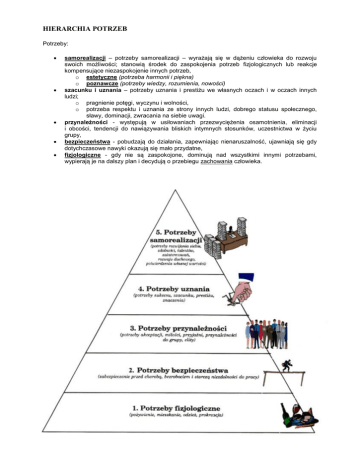 HIERARCHIA POTRZEB Potrzeby: samorealizacji – potrzeby samorealizacji – wyrażają się w dążeniu człowieka do rozwoju swoich możliwości; stanowią środek do zaspokojenia potrzeb fizjologicznych lub reakcje kompensujące niezaspokojenie innych potrzeb, o estetyczne (potrzeba harmonii i piękna) o poznawcze (potrzeby wiedzy, rozumienia, nowości) szacunku i uznania – potrzeby uznania i prestiżu we własnych oczach i w oczach innych ludzi; o pragnienie potęgi, wyczynu i wolności, o potrzeba respektu i uznania ze strony innych ludzi, dobrego statusu społecznego, sławy, dominacji, zwracania na siebie uwagi. przynależności - występują w usiłowaniach przezwyciężenia osamotnienia, eliminacji i obcości, tendencji do nawiązywania bliskich intymnych stosunków, uczestnictwa w życiu grupy, bezpieczeństwa - pobudzają do działania, zapewniając nienaruszalność, ujawniają się gdy dotychczasowe nawyki okazują się mało przydatne, fizjologiczne - gdy nie są zaspokojone, dominują nad wszystkimi innymi potrzebami, wypierają je na dalszy plan i decydują o przebiegu zachowania człowieka.
