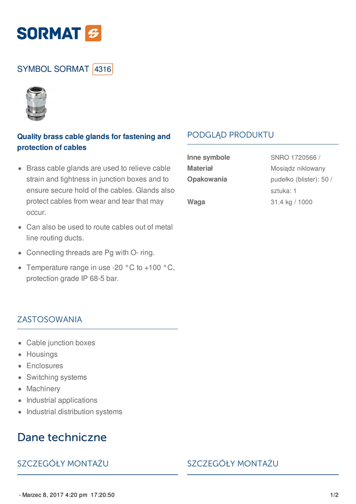 SYMBOL SORMAT 4316 Quality brass cable glands for fastening and protection of cables PODGLĄD PRODUKTU Inne symbole SNRO 1720566 / Brass cable glands are used to relieve cable strain and tightness in junction boxes and to ensure secure hold of the cables. Glands also Materiał Mosiądz niklowany Opakowania pudełko (blister): 50 / protect cables from wear and tear that may occur. Waga sztuka: 1 31.4 kg / 1000 Can also be used to route cables out of metal line routing ducts. Connecting threads are Pg with O- ring. Temperature range in use -20 °C to +100 °C, protection grade IP 68-5 bar. ZASTOSOWANIA Cable junction boxes Housings Enclosures Switching systems Machinery Industrial applications Industrial distribution systems Dane techniczne SZCZEGÓŁY MONTAŻU - Marzec 8, 2017 4:20 pm 17:20:50 SZCZEGÓŁY MONTAŻU 1/2 Rozmiar PK 16 Bez kołnierza (SW) 24 Bez kołnierza, inne 24 Pasująca średnica, Ø mm Wysokość Długość gwintu zewnętrznego - Marzec 8, 2017 4:20 pm 17:20:50 Otwór w mocowanym materiale (Df) 22,8 10-14 31,5 6,5 2/2