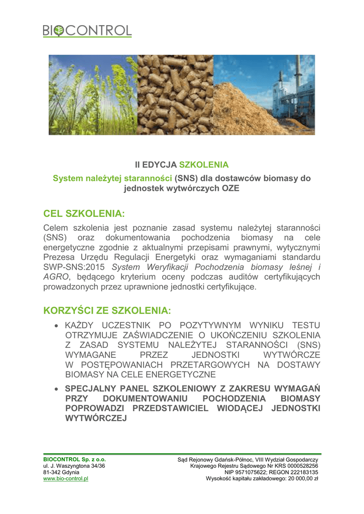 II EDYCJA SZKOLENIA System należytej staranności (SNS) dla dostawców biomasy do jednostek wytwórczych OZE CEL SZKOLENIA: Celem szkolenia jest poznanie zasad systemu należytej staranności (SNS) oraz dokumentowania pochodzenia biomasy na cele energetyczne zgodnie z aktualnymi przepisami prawnymi, wytycznymi Prezesa Urzędu Regulacji Energetyki oraz wymaganiami standardu SWP-SNS:2015 System Weryfikacji Pochodzenia biomasy leśnej i AGRO, będącego kryterium oceny podczas auditów certyfikujących prowadzonych przez uprawnione jednostki certyfikujące. KORZYŚCI ZE SZKOLENIA: KAŻDY UCZESTNIK PO POZYTYWNYM WYNIKU TESTU OTRZYMUJE ZAŚWIADCZENIE O UKOŃCZENIU SZKOLENIA Z ZASAD SYSTEMU NALEŻYTEJ STARANNOŚCI (SNS) WYMAGANE PRZEZ JEDNOSTKI WYTWÓRCZE W POSTĘPOWANIACH PRZETARGOWYCH NA DOSTAWY BIOMASY NA CELE ENERGETYCZNE SPECJALNY PANEL SZKOLENIOWY Z ZAKRESU WYMAGAŃ PRZY DOKUMENTOWANIU POCHODZENIA BIOMASY POPROWADZI PRZEDSTAWICIEL WIODĄCEJ JEDNOSTKI WYTWÓRCZEJ BIOCONTROL Sp. z o.o. ul. J. Waszyngtona 34/36 81-342 Gdynia www.bio-control.pl Sąd Rejonowy Gdańsk-Północ, VIII Wydział Gospodarczy Krajowego Rejestru Sądowego Nr KRS 0000528256 NIP 9571075622; REGON 222183135 Wysokość kapitału zakładowego: 20 000,00 zł ADRESACI SZKOLENIA: Podmioty uczestniczące w łańcuchu energetyczne, a przede wszystkim: dostaw biomasy na cele dostawcy bezpośredni do energetyki zawodowej kadra odpowiedzialna za zakupy biomasy w energetyce zawodowej, w tym kadra odpowiedzialna za kwalifikację dostawców i prowadzenie analizy ryzyka dostawców biomasy oraz za przyjmowanie i weryfikację dokumentacji pochodzenia biomasy kadra odpowiedzialna za realizację zakupów i politykę dostaw biomasy na cele energetyczne w jednostkach spalających biomasę i wytwarzających energię elektryczną z OZE. TERMIN I MIEJSCE SZKOLENIA: 30 czerwca 2016 r. (10.00–16.00) Warszawa Centrum Szkoleniowe PGNiG, ul. Kasprzaka 25 MATERIAŁY SZKOLENIOWE: Materiały szkoleniowe (wydruk z wykładów) dla każdego uczestnika. BIOCONTROL Sp. z o.o. ul. J. Waszyngtona 34/36 81-342 Gdynia www.bio-control.pl Sąd Rejonowy Gdańsk-Północ, VIII Wydział Gospodarczy Krajowego Rejestru Sądowego Nr KRS 0000528256 NIP 9571075622; REGON 222183135 Wysokość kapitału zakładowego: 20 000,00 zł PROGRAM SZKOLENIA: I blok tematyczny - wykład (2,5 h) Godziny: 10.00–11.30 oraz 11.45–12.45 - System oparty na zasadach należytej staranności (SNS) w obszarze oceny i kwalifikacji dostawców biomasy na cele energetyczne - wymagania standardu SWP-SNS:2015 System Weryfikacji Pochodzenia biomasy leśnej i AGRO; - Ocena i kwalifikacja dostawców, - Analiza ryzyka i kryteria stosowane przy analizie ryzyka; - Modele uwierzytelniania źródeł pochodzenia biomasy. II blok tematyczny - wykład (2,5 h) Godziny: 13.30–16.00 - Wymagania jednostki wytwórczej w zakresie dostaw i dokumentowania pochodzenia biomasy - Kodeks dobrych praktyk przy dokumentowaniu pochodzenia biomasy pozyskiwanej z różnych źródeł zapewniający maksymalną zgodność z aktualnymi wymaganiami - Dobre praktyki przy prowadzeniu gospodarki magazynowej. - Pytania, dyskusja. Przerwa kawowa: 11.30–11.45 Przerwa lunchowa: 12.45–13.30 BIOCONTROL Sp. z o.o. ul. J. Waszyngtona 34/36 81-342 Gdynia www.bio-control.pl Sąd Rejonowy Gdańsk-Północ, VIII Wydział Gospodarczy Krajowego Rejestru Sądowego Nr KRS 0000528256 NIP 9571075622; REGON 222183135 Wysokość kapitału zakładowego: 20 000,00 zł TRENERZY: mgr inż. Agnieszka Kędziora-Urbanowicz, BIOCONTROL Sp. z o.o. Absolwentka Wydziału Towaroznawstwa, specjalności Towaroznawstwo i Zarządzanie Jakością Akademii Morskiej w Gdyni oraz studiów podyplomowych Energetyka i Odnawialne Źródła Energii na Uniwersytecie Warmińsko-Mazurskim w Olsztynie. W latach 2009–2013 pracowała jako starszy specjalista w Zespole ds. Certyfikacji Wyrobów Budowlanych i auditor wiodący zakładowej kontroli produkcji branży budowlanej w jednostce certyfikującej Polskie Centrum Badań i Certyfikacji S.A. Od 2012 roku członek Komitetu Technicznego powołanego przy Polskim Komitecie Normalizacyjnym (KT 212 Wyroby do Budowy Dróg) i członek europejskiej grupy jednostek notyfikowanych SG 15. Od 8 lat związana z certyfikacją systemów zarządzania. W latach 2013–2014 na stanowisku Kierownik ds. Rozwoju Produktu Branży Certyfikacji i Audytu (SSC) SGS Polska Sp. z o.o., również auditor systemu SNS dla biomasy i zakładowej kontroli produkcji (ZKP). W strukturach SGS Polska Sp. z o.o. pełniła funkcję Koordynatora Projektu związanego z Krajowym Systemem Weryfikacji Pochodzenia Biomasy oraz członka Komitetu Technicznego powołanego przy SGS Polska Sp. z o.o. zajmującego się opracowywaniem oraz wdrażaniem procedur i programów certyfikacji systemów opartych na zasadach należytej staranności przy dostawach biomasy na cele energetyczne, autorka dokumentu Krajowy Standard Uwierzytelniania Biomasy. Współtwórca autorskiego programu administrowania systemem certyfikacji SNS oraz projektu Krajowego Spisu Uwierzytelniania Biomasy – www.ksub.pl, które do dnia dzisiejszego stanowią najczęściej wybierane rozwiązanie przy uwierzytelnianiu łańcucha dostaw biomasy na cele energetyczne. Autorka standardu prywatnego SWP-SNS:2015 System Weryfikacji Biomasy leśnej i AGRO. mgr inż. Marek Kaźmierczak, Veolia Energia Polska S.A. Absolwent Wydziału Mechanicznego Politechniki Łódzkiej. Dyplom uzyskał w Instytucie Techniki Cieplnej Politechniki Łódzkiej w specjalizacji Maszyny i urządzenia cieplne. Od początku pracy zawodowej związany z elektrociepłowniami łódzkimi. W przebiegu kariery zawodowej zatrudniony był w mechanicznych działach wytwarzania ciepła i energii elektrycznej. Jako Kierownik Wydziału Energetycznego zajmował się nadzorem nad eksploatacją urządzeń wytwórczych elektrociepłowni oraz jako jedno z zadań, analizami ekonomicznymi dotyczącymi inwestycji biomasowych. Uczestniczył w realizacji i u