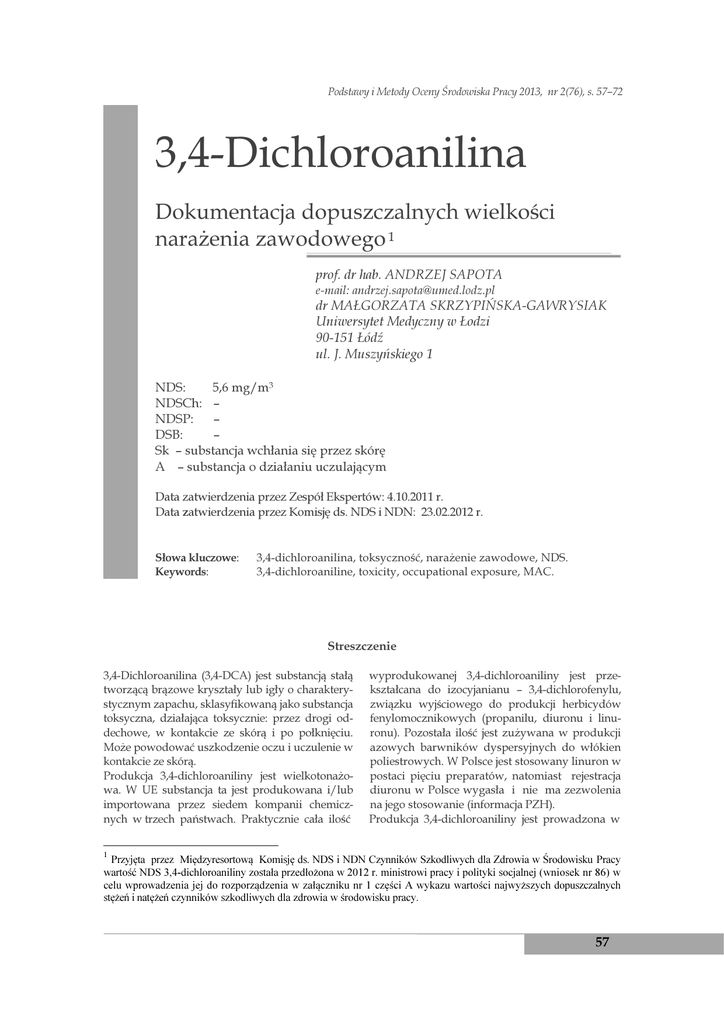 Podstawy i Metody Oceny Środowiska Pracy 2013, nr 2(76), s. 57–72 3,4-Dichloroanilina Dokumentacja dopuszczalnych wielkości narażenia zawodowego 1 prof. dr hab. ANDRZEJ SAPOTA e-mail: [email protected] dr MAŁGORZATA SKRZYPIŃSKA-GAWRYSIAK Uniwersytet Medyczny w Łodzi 90-151 Łódź ul. J. Muszyńskiego 1 NDS: 5,6 mg/m3 NDSCh: – NDSP: – DSB: – Sk – substancja wchłania się przez skórę A – substancja o działaniu uczulającym Data zatwierdzenia przez Zespół Ekspertów: 4.10.2011 r. Data zatwierdzenia przez Komisję ds. NDS i NDN: 23.02.2012 r. Słowa kluczowe: Keywords: 3,4-dichloroanilina, toksyczność, narażenie zawodowe, NDS. 3,4-dichloroaniline, toxicity, occupational exposure, MAC. Streszczenie 3,4-Dichloroanilina (3,4-DCA) jest substancją stałą tworzącą brązowe kryształy lub igły o charakterystycznym zapachu, sklasyfikowaną jako substancja toksyczna, działająca toksycznie: przez drogi oddechowe, w kontakcie ze skórą i po połknięciu. Może powodować uszkodzenie oczu i uczulenie w kontakcie ze skórą. Produkcja 3,4-dichloroaniliny jest wielkotonażowa. W UE substancja ta jest produkowana i/lub importowana przez siedem kompanii chemicznych w trzech państwach. Praktycznie cała ilość wyprodukowanej 3,4-dichloroaniliny jest przekształcana do izocyjanianu – 3,4-dichlorofenylu, związku wyjściowego do produkcji herbicydów fenylomocznikowych (propanilu, diuronu i linuronu). Pozostała ilość jest zużywana w produkcji azowych barwników dyspersyjnych do włókien poliestrowych. W Polsce jest stosowany linuron w postaci pięciu preparatów, natomiast rejestracja diuronu w Polsce wygasła i nie ma zezwolenia na jego stosowanie (informacja PZH). Produkcja 3,4-dichloroaniliny jest prowadzona w 1 Przyjęta przez Międzyresortową Komisję ds. NDS i NDN Czynników Szkodliwych dla Zdrowia w Środowisku Pracy wartość NDS 3,4-dichloroaniliny została przedłożona w 2012 r. ministrowi pracy i polityki socjalnej (wniosek nr 86) w celu wprowadzenia jej do rozporządzenia w załączniku nr 1 części A wykazu wartości najwyższych dopuszczalnych stężeń i natężeń czynników szkodliwych dla zdrowia w środowisku pracy. 57 Andrzej Sapota, Małgorzata Skrzypińska-Gawrysiak układach zamkniętych, w związku z tym zawodowe narażenie na 3,4-dichloroanilinę A występuje głównie podczas poboru i analizy próbek oraz czyszczenia i naprawy urządzeń produkcyjnych. Procesy produkcji i przerobu 3,4-dichloroaniliny są prowadzone w podwyższonej temperaturze (około 90 oC). Możliwymi drogami narażenia na ten związek jest wchłanianie par lub cząstek tworzonych przez kondensację z fazy gazowej i przez kontakt ze skórą. Mierzone stężenia 3,4-dichloroaniliny w powietrzu środowiska pracy nie przekraczały 0,07 mg/m3. Największe zanotowane stężenie wynosiło 0,57 mg/m3 i było stężeniem chwilowym. Nie ma w dostępnym piśmiennictwie danych o narażeniu zawodowym na 3,4-dichloroanilinę w Polsce. Nie ma danych w dostępnym piśmiennictwie dotyczących objawów klinicznych narażenia na 3,4-dichloroanilinę ludzi, nie ma także informacji o badaniach epidemiologicznych. Głównym skutkiem toksycznym ostrego działania 3,4-dichloroaniliny jest tworzenie methemoglobiny (MetHb). Klinicznymi objawami ostrego zatrucia u zwierząt są: sinica, wyczerpanie, duszność i osłabienie siły mięśniowej. Obserwowano także: biegunkę, sinicę, osłabienie odruchów i paraliż kończyn. Podczas sekcji zwierząt nie obserwowano widocznych zmian w narządach wewnętrznych. Innymi skutkami obserwowanymi było również działanie nefrotoksyczne i hepatotoksyczne. W teście maksymalizacji Magnussona-Klingmana przeprowadzonym na świnkach morskich u 75% zwierząt (15/20) obserwowano dodatni wynik reakcji alergicznej na 3,4-dichloroanilinę. Podprzewlekłe narażenie szczurów i królików na 3,4-dichloroanilinę drogą inhalacyjną lub dermalną skutkowało wzrostem poziomu MetHb i związanymi z tym objawami uszkodzenia śledziony. Testy na genotoksyczność 3,4-dichloroaniliny prowadzone w warunkach in vitro dały ujemne wyniki dla mutacji genowych i chromosomowych, słabo pozytywny wynik otrzymano w teście wymiany chromatyd siostrzanych oraz dodatni wynik w uszkodzeniu wrzeciona mitotycznego. W warunkach in vivo w teście mikrojądrowym otrzymano wyniki ujemne. W dostępnym piśmiennictwie nie znaleziono danych dotyczących działania rakotwórczego 3,4-dichloroaniliny na ludzi i na zwierzęta, a także informacji o wpływie 3,4-dichloroaniliny na rozrodczość u ludzi. W badaniach na szczurach wy- 58 kazano szkodliwy wpływ 3,4-dichloroaniliny na męski układ rozrodczy. U samców stwierdzono zmniejszenie liczby i jakości plemników. Na podstawie wyników badań toksyczności rozwojowej wykazano, że 3,4-dichloroanilina nie wykazuje szkodliwego działania na rozwój płodu w dawkach nietoksycznych dla matek. Istnieją ilościowe dane dotyczące wchłaniania 3,4-dichloroaniliny z przewodu pokarmowego. Nie znaleziono danych dotyczących wchłaniania 3,4-dichloroaniliny innymi drogami. Na podstawie skutków toksycznych (tworzenie MetHb, splenotoksyczność) obserwowanych, zarówno po narażeniu inhalacyjnym, jak i dermalnym, można wnioskować, że substancja ta wchłania się również w drogach oddechowych i przez skórę. 3,4-Dichloroanilina nie ulega kumulacji w ustroju, tworzy jednak addukty z hemoglobiną. Po podaniu szczurom per os 3,4-dichloroaniliny 81% dawki uległo wydaleniu z moczem, a 26% z kałem. Największa ilość została wydalona w czasie 24 h po podaniu. Po podaniu królikom 3,4-dichloroaniliny drogą pokarmową w moczu stwierdzono występowanie orto- i para-hydroksylowanych związków. W badaniach in vitro stwierdzono następujące metabolity 3,4-dichloroaniliny: 2- i 6-hydroksy3,4-dichloroanilinę (produkty C-hydroksylacji), N-hydroksy-3,4-dichloroanilinę (produkt N-hydroksylacji) oraz N-(3,4-dichlorofenylo)acetamid i N-(3,4-dichlorofe