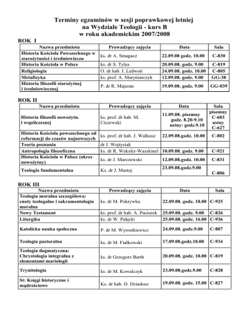 Terminy egzaminów w sesji poprawkowej letniej na Wydziale Teologii - kurs B w roku akademickim 2007/2008 ROK I Nazwa przedmiotu Historia Kościoła Powszechnego w starożytności i średniowieczu Historia Kościoła w Polsce Religiologia Metafizyka Historia filozofii starożytnej i średniowiecznej Prowadzący zajęcia Data Sala ks. dr A. Smagacz 22.09.08 godz. 10.00 C-830 ks. dr S. Tylus O. dr hab. I. Ledwoń ks. prof. A. Maryniarczyk 20.09.08. godz. 9.00 24.09.08. godz. 10.00 12.09.08. godz. 9.00 C-819 C-805 GG-38 P. dr R. Majeran 19.09.08. godz. 9.00 GG-039 ROK II Nazwa przedmiotu Historia filozofii nowożytn. i współczesnej Historia Kościoła powszechnego od reformacji do czasów najnowszych Teoria poznania Antropologia filozoficzna Historia Kościoła w Polsce (okres nowożytny) Teologia fundamentalna Prowadzący zajęcia ks. prof. dr hab. M. Ciszewski ks. prof. dr hab. J. Walkusz Data Sala pisemny 11.09.08. pisemny C-603 godz. 8.20-9.10 ustny ustny: godz.9.10 C-627 22.09.08.godz. 10.00 C-802 dr J. Wojtysiak ks. dr R. Weksler-Waszkinel 10.09.08. godz. 9.00 C-921 ks. dr J. Marczewski C-831 Ks. dr J. Mastej 12.09.08.godz. 10.00 23.09.08.godz.9.00 C-806 ROK III Nazwa przedmiotu Teologia moralna szczegółowa: cnoty teologalne i sakramentologia moralna Nowy Testament Liturgika Prowadzący zajęcia Data Sala ks. dr M. Pokrywka 22.09.08. godz. 10.00 C-925 ks. prof. dr hab. A. Paciorek ks. dr W. Pałęcki 25.09.08. godz. 9.00 C-826 25.09.08. godz. 16.00 C-936 Katolicka nauka społeczna P. dr M. Wyrostkiewicz 24.09.08. godz.9.00 C-807 Teologia pastoralna ks. dr M. Fiałkowski 17.09.08.godz.10.00 C-934 Teologia dogmatyczna: Chrystologia integralna z elementami mariologii ks. dr Grzegorz Barth 20.09.08. godz. 10.00 C-819 Trynitologia ks. dr M. Kowalczyk 23.09.08.godz.9.00 St: Księgi historyczne i mądrościowe Ks. dr hab. D. Dziadosz 19.09.08. godz. 15.00 C-827 C-828 ROK IV Nazwa przedmiotu Teologia duchowości katolickiej Stary Testament: Księgi prorockie Nowy Testament: Pisma apostolskie Teologia dogmatyczna: Pneumatologia i charytologia Liturgika Teologia moralna szczegółowa: moralność życia społecznego Teologia dogmatyczna: Sakramentologia Prowadzący zajęcia ks. prof. dr hab. M. Chmielewski ks. dr W. Pikor ks. prof. dr hab. W. Rakocy Data Sala 16.09.08.godz.12.00 C-849 10.09.08. godz. 8.00 C-827 20.09.08. godz. 13.00 C-803 Ks. prof. dr hab. A. Czaja 24.09.08. godz. 9.00 Ks. dr W. Pałęcki 25.09.08. godz. 16.00 C-936 Ks. prof. J. Gocko 25.09.08.godz.9.00 C-854 Ks. dr A. Nadbrzeżny 22.09.08. godz.9.00 C-821 15.09.08.godz.8.00 C-828 Teologia dogmatyczna: Eschatologia Ks. prof .K. Góźdź C-821 Archiwistyka Dzieje archiwów zakonnych Ustrój i organizacja Kościola w Polsce do końca XVIII O. Prof. R. Prejs ks. dr J. Marczewski 25.09.08. godz. 16.00 12.09.08. godz. 10.00 s.829 s.831 Lublin 2008.06.26