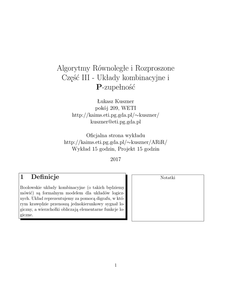 Algorytmy Równoległe i Rozproszone Część III - Układy kombinacyjne i P-zupełność Łukasz Kuszner pokój 209, WETI http://kaims.eti.pg.gda.pl/∼kuszner/ [email protected] Oficjalna strona wykładu http://kaims.eti.pg.gda.pl/∼kuszner/ARiR/ Wykład 15 godzin, Projekt 15 godzin 2017 1 Definicje Notatki Boolowskie układy kombinacyjne (o takich będziemy mówić) są formalnym modelem dla układów logicznych. Układ reprezentujemy za pomocą digrafu, w którym krawędzie przenoszą jednokierunkowy sygnał logiczny, a wierzchołki obliczają elementarne funkcje logiczne. 1 Niech Bk = {f |f : {0, 1}k → {0, 1}} będzie zbiorem k argumentowych funkcji logicznych. Przez Boolowski układ kombinacyjny, lub w skrócie układ kombinacyjny, rozumiemy etykietowany, skończony, acykliczny graf skierowany, w którym każdy z wierzchołków jest: Notatki • wejściem, jeśli jego stopień wejściowy jest 0, • wyjściem, jeśli jego stopień wyjściowy jest 0, • bramką, jeśli jest funkcją typu B1 lub B2 . Wierzchołek typu Bi musi mieć stopień wejściowy (indeg) równy i, natomiast stopień wyjściowy (outdeg) nie jest ograniczony. Notatki Zauważmy, że: • wejścia i bramki mogą być jednocześnie wyjściami, • układ kombinacyjny oblicza funkcję n m f : {0, 1} → {0, 1} , gdzie n jest liczbą wejść, a m liczbą wyjść w układzie. Interesującymi nas wielkościami będą rozmiar i głębokość układu. Rozmiarem układu α, nazywamy liczbę jego wierzchołków size(α). Głębokością układu α, nazywamy długość (liczbę krawędzi) najdłuższej ścieżki od wejścia do wyjścia w α i oznaczamy depth(α). 2 2 Uwagi do przyjętych założeń Dopuszczenie bramek o dowolnie dużej liczbie wyjść może się wydawać nierealistyczne, jednak pokazano, że ograniczenie liczby wyjść powoduje jedynie albo liniowy wzrost rozmiaru, albo głębokości układu. Dopuszczenie bramek o nieograniczonym rozmiarze wejścia może zmniejszyć głębokość układu o czynnik log log size, ale za cenę wielomianowego zwiększenia rozmiaru (wtedy za rozmiar przyjmuje się liczbę krawędzi w układzie) lub pozwala skonstruować układ o głębokości 2 (korzystając z postaci kanonicznych) jednak za cenę wykładniczego wzrostu rozmiaru. Z drugiej strony konwersja układu z bramkami o nieograniczonej liczbie wejść do układu w przedstawionym modelu może spowodować kwadratowy wzrost rozmiaru i wzrost głębokości o czynnik proporcjonalny do log size. 3 Notatki 3 Rodziny układów kombinacyjnych Notatki Pojedynczy układ oblicza nam funkcje logiczne o zadanym rozmiarze wejścia. Nie jest to sytuacja do jakiej jesteśmy przyzwyczajeni myśląc o algorytmach i obliczeniach. Jeden algorytm powinien rozwiązywać problem bez względu na rozmiar wejścia. Również rozmiar danych wyjściowych nie jest stały. Tę sytuację modelujemy funkcją fα : {0, 1}∗ → {0, 1}∗ i nieskończonym zbiorem układów {αn }, w którym układ αn oblicza funkcję fα : {0, 1}n → {0, 1}m(n) , gdzie m(n) jest największym rozmiarem wyjścia dla danych o rozmiarze n. Opis układów kombinacyjnych Notatki Jeśli nie ograniczymy sposobów definiowania rodzin układów możemy definiować bardzo dziwne układy, które np. rozwiązują problemy nierozwiązywalne. (zob. LtPC str. 31). Dlatego ograniczamy możliwość definiowania układów do takich, które dają się szybko obliczyć. 4 Kodem standardowym αn dla układu α nazywamy ciąg ze zbioru {0, 1}∗ zdefiniowany w sposób jednoznaczny dla danego układu αn w taki sposób, że różnym układom odpowiadają różne kody standardowe. (zob. LtPC str. 29). Notatki Definicja 1 Rodzinę układów kombinacyjnych {αn } nazywamy jednorodną, jeśli przekształcenie 1n → αn może być obliczone na deterministycznej maszynie Turinga o złożoności pamięciowej O(log size(αn )). Przypadek, w którym funkcja m(n) = 1 jest użyteczny dla definiowania języków formalnych. Definicja 2 Niech {αn } oblicza funkcję fα : {0, 1}∗ → {0, 1} Językiem rozpoznawanym przez rodzinę układów αn nazywamy zbiór Lα = {x ∈ {0, 1}∗ | fα (x) = 1}. 5 Notatki Definicja 3 Dla każdego k 1 klasą NCk nazywamy zbiór wszystkich języków rozpoznawanych przez jednorodną rodzinę {αn } o rozmiarze size(αn ) = nO(1) i głębokości depth(αn ) = O(logk n) Notatki Definicja 4 Klasą NC nazywamy zbiór NC = [ NCk k1 Podobnie jak klasy języków definiujemy FNCk jako klasy funkcji z {0, 1}∗ w {0, 1}∗ obliczalnych przez układy o rozmiarze nO(1) i głębokości O(logk n). Celem powyższych definicji jest możliwość rozróżnienia problemów dla których możemy znaleźć „dobre, równoległe” rozwiązanie i takich, dla których takiego rozwiązania prawdopodobnie nie ma. Definicja 5 Klasą P nazywamy zbiór wszystkich języków rozpoznawanych przez jednorodną rodzinę {αn } o rozmiarze size(αn ) = nO(1) i głębokości depth(αn ) = nO(1) . Podobnie definiujemy FP jako klasę funkcji z {0, 1}∗ w {0, 1}∗ obliczalnych przez układy o rozmiarze nO(1) i głębokości nO(1) . 6 Notatki 4 Notatki Redukcje Redukcje typu wiele-do-jeden Definicja 6 Niech L, L0 będą językami, piszemy L ¬m L0 , jeśli istnieje funkcja f taka, że x ∈ L wtedy i tylko wtedy, gdy f (x) ∈ L0 . Podobnie: • L ¬Pm L0 , jeśli f ∈ FP k L0 , jeśli f ∈ FNCk • L ¬NC m 0 • L ¬NC m L , jeśli f ∈ FNC k NC , L ¬NC Twierdzenie 1 Relacje ¬m , ¬Pm , ¬m m ,są przechodnie. Ćwiczenie 1 Udowodnij twierdzenie 1. Redukcje z „wyrocznią” Notatki Definicja 7 Niech B będzie problemem optymalizacyjnym. Rodzinę układów kombinacyjnych αn nazywamy rodziną układów z B wyrocznią, jeśli αn jest układem wyposażonym dodatkowo w bramki typu wyrocznia dla B, które potrafią udzielać odpowiedzi na instancję problemu B. Jeśli bramka wyrocznia ma k wejść i l wyjść, to jej rozmiar liczymy jako k + l, a głębokość jako lg(k + l). 7 Definicja 8 Niech B, B 0 