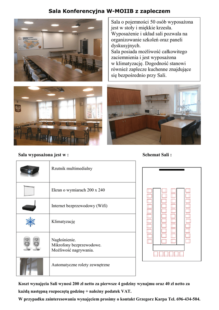 Sala Konferencyjna W-MOIIB z zapleczem Sala o pojemności 50 osób wyposażona jest w stoły i miękkie krzesła. Wyposażenie i układ sali pozwala na organizowanie szkoleń oraz paneli dyskusyjnych. Sala posiada możliwość całkowitego zaciemnienia i jest wyposażona w klimatyzację. Dogodność stanowi również zaplecze kuchenne znajdujące się bezpośrednio przy Sali. Sala wyposażona jest w : Schemat Sali : Rzutnik multimedialny Ekran o wymiarach 200 x 240 Internet bezprzewodowy (Wifi) Klimatyzację Nagłośnienie. Mikrofony bezprzewodowe. Możliwość nagrywania. Automatyczne rolety zewnętrzne Koszt wynajęcia Sali wynosi 200 zł netto za pierwsze 4 godziny wynajmu oraz 40 zł netto za każdą następną rozpoczętą godzinę + należny podatek VAT. W przypadku zainteresowania wynajęciem prosimy o kontakt Grzegorz Karpa Tel. 696-434-504.