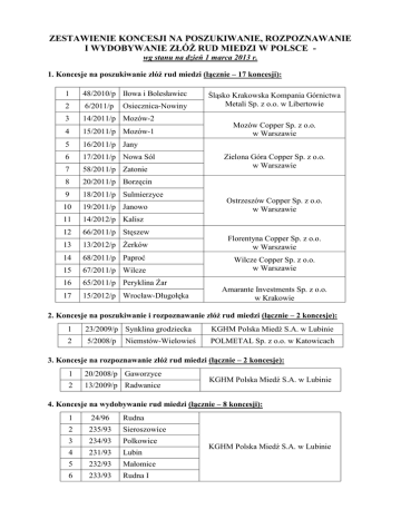 ZESTAWIENIE KONCESJI NA POSZUKIWANIE, ROZPOZNAWANIE I WYDOBYWANIE ZŁÓŻ RUD MIEDZI W POLSCE wg stanu na dzień 1 marca 2013 r. 1. Koncesje na poszukiwanie złóż rud miedzi (łącznie – 17 koncesji): 1 48/2010/p Iłowa i Bolesławiec 2 6/2011/p 3 14/2011/p Mozów-2 4 15/2011/p Mozów-1 5 16/2011/p Jany 6 17/2011/p Nowa Sól 7 58/2011/p Zatonie 8 20/2011/p Borzęcin 9 18/2011/p Sulmierzyce 10 19/2011/p Janowo 11 14/2012/p Kalisz 12 66/2011/p Stęszew 13 13/2012/p Żerków 14 68/2011/p Paproć 15 67/2011/p Wilcze 16 65/2011/p Peryklina Żar 17 15/2012/p Wrocław-Długołęka Osiecznica-Nowiny Śląsko Krakowska Kompania Górnictwa Metali Sp. z o.o. w Libertowie Mozów Copper Sp. z o.o. w Warszawie Zielona Góra Copper Sp. z o.o. w Warszawie Ostrzeszów Copper Sp. z o.o. w Warszawie Florentyna Copper Sp. z o.o. w Warszawie Wilcze Copper Sp. z o.o. w Warszawie Amarante Investments Sp. z o.o. w Krakowie 2. Koncesje na poszukiwanie i rozpoznawanie złóż rud miedzi (łącznie – 2 koncesje): 1 23/2009/p Synklina grodziecka 2 5/2008/p Niemstów-Wielowieś KGHM Polska Miedź S.A. w Lubinie POLMETAL Sp. z o.o. w Katowicach 3. Koncesje na rozpoznawanie złóż rud miedzi (łącznie – 2 koncesje): 1 20/2008/p Gaworzyce 2 13/2009/p Radwanice KGHM Polska Miedź S.A. w Lubinie 4. Koncesje na wydobywanie rud miedzi (łącznie – 8 koncesji): 1 24/96 Rudna 2 235/93 Sieroszowice 3 234/93 Polkowice 4 231/93 Lubin 5 232/93 Małomice 6 233/93 Rudna I KGHM Polska Miedź S.A. w Lubinie 7 10/95 8 16/2004 Radwanice Wschód Głogów GłębokiPrzemysłowy *** ZESTAWIENIE KONCESJI NA POSZUKIWANIE, ROZPOZNAWANIE I WYDOBYWANIE ZŁÓŻ RUD CYNKU I OŁOWIU W POLSCE wg stanu na dzień 1 marca 2013 r. 1. Koncesje na poszukiwanie i rozpoznawanie złóż rud cynku i ołowiu (łącznie – 7 koncesji): Zawiercie I, Zawiercie II, RodakiRokitno Szlacheckie Zawiercie I, Marciszów 1 26/2010/p 2 34/2010/p 3 1/2012/p Laski 4 18/2012/p Olkusz-część NW 5 25/2012/p Gołuchowice 6 26/2012/p Klucze 7 27/2012/p Chechło Rathdowney Polska Sp. z o.o. w Krakowie Zakłady Górniczo-Hutnicze "Bolesław" S.A. w Bukownie Zakłady Górniczo-Hutnicze "Bolesław" S.A. w Bukownie Mazovia Energy Resources Sp. z o.o. Zakłady Górniczo-Hutnicze "Bolesław" S.A. w Bukownie Rathdowney Polska Sp. z o.o. w Krakowie 2. Koncesje na wydobywanie rud cynku i ołowiu (łącznie – 3 koncesje): 1 8/2003 Olkusz-część złoża 2 172/93 Pomorzany 3 1/2009 Klucze I Zakłady Górniczo-Hutnicze "Bolesław" S.A. w Bukownie *** ZESTAWIENIE KONCESJI NA POSZUKIWANIE, ROZPOZNAWANIE I WYDOBYWANIE ZŁÓŻ RUD URANU W POLSCE wg stanu na dzień 1 marca 2013 r. 1. Koncesje na poszukiwanie złóż rud uranu (łącznie – 1 koncesja): 1 12/2012/p Radoniów European Resources Polska Sp. z o.o. w Wołowie 2. Koncesje na wydobywanie uranu (łącznie – 0 koncesji): *** ZESTAWIENIE KONCESJI NA POSZUKIWANIE, ROZPOZNAWANIE I WYDOBYWANIE ZŁÓŻ KRUSZYWA NATURALNEGO W POLSCE wg stanu na dzień 1 marca 2013 r. 1. Koncesje na wydobywanie kruszywa naturalnego (łącznie – 1 koncesja): 1 3/2006 Południowa Ławica Środkowa-Bałtyk Południowy BALTEX - Inżynieria i Górnictwo Morskie Sp. z o.o. w Gdyni *** ZESTAWIENIE KONCESJI NA POSZUKIWANIE, ROZPOZNAWANIE I WYDOBYWANIE ZŁÓŻ RUD POLIMETALICZNYCH W POLSCE wg stanu na dzień 1 marca 2013 r. 1. Koncesje na poszukiwanie złóż rud polimetalicznych (łącznie – 1 koncesja): 1 43/2011/p European Resources Polska Sp. z o.o. w Wołowie Leśna – Gryfów Śląski 2. Koncesje na poszukiwanie i rozpoznawanie złóż rud polimetalicznych (łącznie – 2 koncesje): 1 5/2006/p Myszków-Żarki 2 16/2012/p Kobierzyce Śląsko Krakowska Kompania Górnictwa Metali Sp. z o.o. w Libertowie Amarante Investments Sp. z o.o. w Krakowie *** ZESTAWIENIE KONCESJI NA POSZUKIWANIE, ROZPOZNAWANIE I WYDOBYWANIE ZŁÓŻ TYTANU W POLSCE na dzień 1 marca 2013 r. 1. Koncesje na poszukiwanie i rozpoznawanie złóż tytanu (łącznie – 1 koncesja): 1 42/2011/p Piława Dolna i Piława Górna Dolnośląskie Surowce Skalne S.A. w Warszawie 2. Koncesje na wydobywanie tytanu (łącznie – 0 koncesji): *** ZESTAWIENIE KONCESJI NA POSZUKIWANIE, ROZPOZNAWANIE I WYDOBYWANIE ZŁÓŻ SOLI KAMIENNEJ W POLSCE wg stanu na dzień 1 marca 2013 r. 1. Koncesje na rozpoznawanie złóż soli kamiennej (łącznie – 3 koncesje): 1 68/98/p Kazimierzów KGHM Polska Miedź S.A. w Lubinie Inowrocławskie Kopalnie Soli "Solino" S.A. w Inowrocławiu 3 54/2009/p Goleniów PGNiG S.A. w Warszawie 2. Koncesje na wydobywanie soli kamiennej (łącznie – 3 koncesje): 2 21/2007/p SW część złoża Góra 1 1/2003 Mogilno I 2 4/2002 Góra 3 4/2004 Kłodawa Inowrocławskie Kopalnie Soli "Solino" S.A. w Inowrocławiu Kopalnia Soli „Kłodawa” S.A. w Kłodawie *** ZESTAWIENIE KONCESJI NA POSZUKIWANIE, ROZPOZNAWANIE I WYDOBYWANIE ZŁÓŻ GIPSU W POLSCE wg stanu na dzień 1 marca 2013 r. 1. Koncesje na poszukiwanie złóż gipsu (łącznie – 0 koncesji): 2. Koncesje na wydobywanie gipsu (łącznie – 2 koncesje): 1 36/96 Borków-Chwałowice 2 9/93 Leszcze Saint-Gobain Construction Products Polska Sp. z o.o. w Gliwicach Kopalnia Gipsu "Leszcze" S.A. w Leszczach *** ZESTAWIENIE KONCESJI NA POSZUKIWANIE, ROZPOZNAWANIE I WYDOBYWANIE ZŁÓŻ GIPSU I ANHYDRYTU W POLSCE wg stanu na dzień 1 marca 2013 r. 1. Koncesje na wydobywanie gipsu i anhydrytu (łącznie – 3 koncesje): 1 8/98 2 1/2002 3 6/2003 Lubichów Nowy Ląd-Pole Radłówka Nowy Ląd Kopalnia Gipsu i Anhydrytu "Nowy Ląd" Sp. z o.o. w Niwnicach *** ZESTAWIENIE KONCESJI NA POSZUKIWANIE, ROZPOZNAWANIE I WYDOBYWANIE ZŁÓŻ RUD NIKLU W POLSCE wg stanu na dzień 1 marca 2013 r. 1. Koncesje na poszukiwanie złóż rud niklu (łącznie – 0 koncesji): 2. Koncesje na rozpoznawanie złóż rud niklu (łącznie – 1 koncesja): 1 2/2006/p KGHM Polska Miedź S.A. w Lubinie Szklary I 3. Koncesje na poszukiwanie i rozpoznawanie złóż rud niklu (łącznie – 0 koncesja): *** ZESTAWIENIE KONCESJI NA POSZUKIWANIE, ROZPOZNAWA