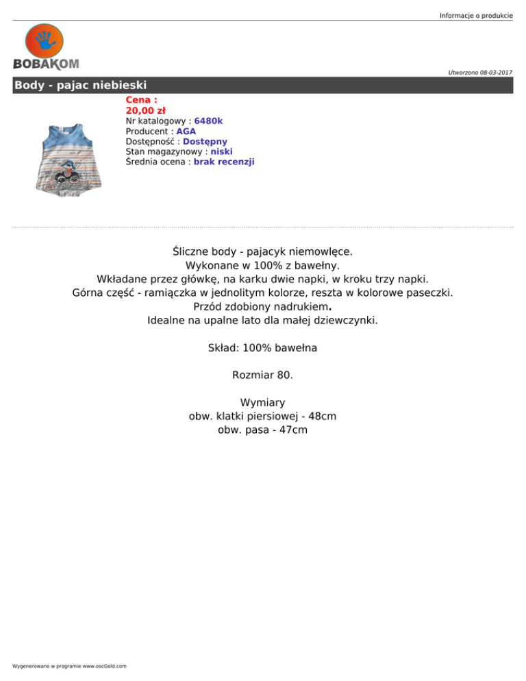 Informacje o produkcie Utworzono 08-03-2017 Body - pajac niebieski Cena : 20,00 zł Nr katalogowy : 6480k Producent : AGA Dostępność : Dostępny Stan magazynowy : niski Średnia ocena : brak recenzji Śliczne body - pajacyk niemowlęce. Wykonane w 100% z bawełny. Wkładane przez główkę, na karku dwie napki, w kroku trzy napki. Górna część - ramiączka w jednolitym kolorze, reszta w kolorowe paseczki. Przód zdobiony nadrukiem. Idealne na upalne lato dla małej dziewczynki. Skład: 100% bawełna Rozmiar 80. Wymiary obw. klatki piersiowej - 48cm obw. pasa - 47cm Wygenerowano w programie www.oscGold.com Informacje o produkcie Dostępne opcje Body - pajac niebieski » kolor: niebieski. » Producent: Aga. Wygenerowano w programie www.oscGold.com