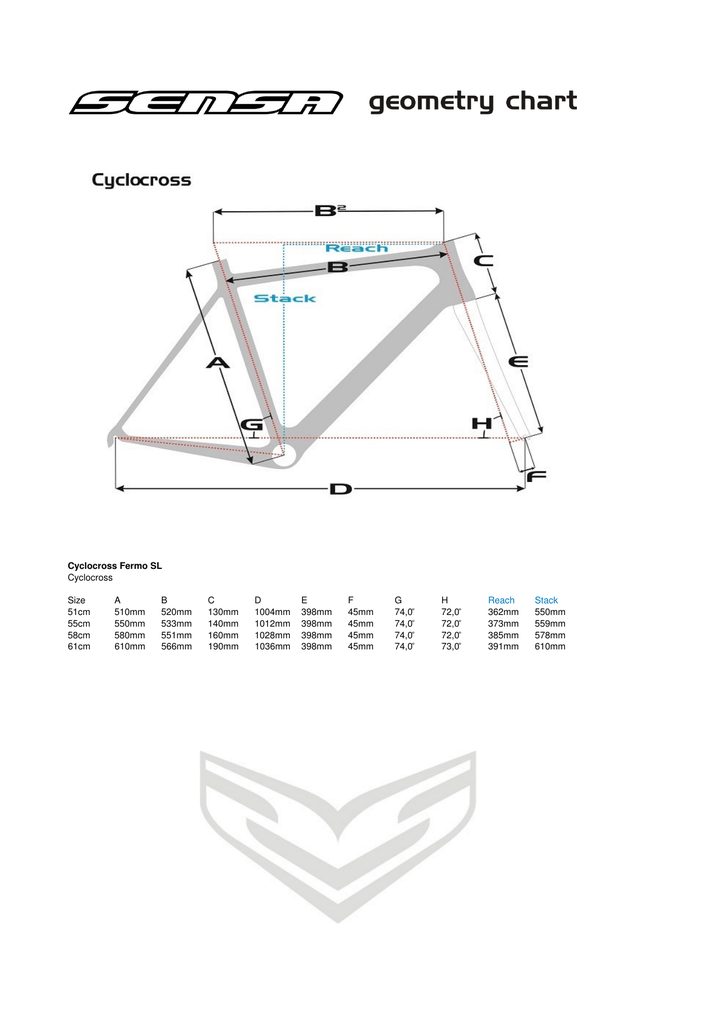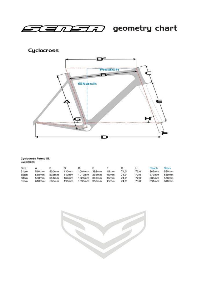 Cyclocross Fermo SL Cyclocross Size 51cm 55cm 58cm 61cm A 510mm 550mm 580mm 610mm B 520mm 533mm 551mm 566mm C 130mm 140mm 160mm 190mm D 1004mm 1012mm 1028mm 1036mm E 398mm 398mm 398mm 398mm F 45mm 45mm 45mm 45mm G 74,0 ̊ 74,0 ̊ 74,0 ̊ 74,0 ̊ H 72,0 ̊ 72,0 ̊ 72,0 ̊ 73,0 ̊ Reach 362mm 373mm 385mm 391mm Stack 550mm 559mm 578mm 610mm