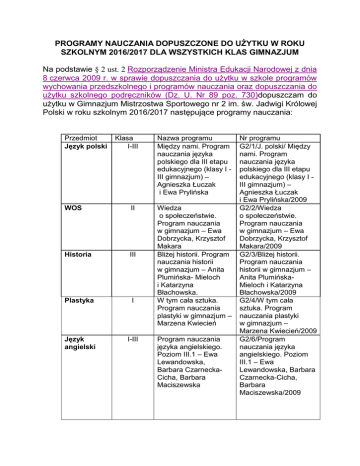 PROGRAMY NAUCZANIA DOPUSZCZONE DO UŻYTKU W ROKU SZKOLNYM 2016/2017 DLA WSZYSTKICH KLAS GIMNAZJUM Na podstawie § 2 ust. 2 Rozporządzenie Ministra Edukacji Narodowej z dnia 8 czerwca 2009 r. w sprawie dopuszczania do użytku w szkole programów wychowania przedszkolnego i programów nauczania oraz dopuszczania do użytku szkolnego podręczników (Dz. U. Nr 89 poz. 730)dopuszczam do użytku w Gimnazjum Mistrzostwa Sportowego nr 2 im. św. Jadwigi Królowej Polski w roku szkolnym 2016/2017 następujące programy nauczania: Przedmiot Język polski Klasa I-III WOS II Historia III Plastyka I Język angielski I-III Nazwa programu Między nami. Program nauczania języka polskiego dla III etapu edukacyjnego (klasy I III gimnazjum) – Agnieszka Łuczak i Ewa Prylińska Wiedza o społeczeństwie. Program nauczania w gimnazjum – Ewa Dobrzycka, Krzysztof Makara Bliżej historii. Program nauczania historii w gimnazjum – Anita Plumińska- Mieloch i Katarzyna Błachowska. W tym cała sztuka. Program nauczania plastyki w gimnazjum – Marzena Kwiecień Program nauczania języka angielskiego. Poziom III.1 – Ewa Lewandowska, Barbara CzarneckaCicha, Barbara Maciszewska Nr programu G2/1/J. polski/ Między nami. Program nauczania języka polskiego dla III etapu edukacyjnego (klasy I III gimnazjum) – Agnieszka Łuczak i Ewa Prylińska/2009 G2/2/Wiedza o społeczeństwie. Program nauczania w gimnazjum – Ewa Dobrzycka, Krzysztof Makara/2009 G2/3/Bliżej historii. Program nauczania historii w gimnazjum – Anita PlumińskaMieloch i Katarzyna Błachowska/2009 G2/4/W tym cała sztuka. Program nauczania plastyki w gimnazjum – Marzena Kwiecień/2009 G2/6/Program nauczania języka angielskiego. Poziom III.1 – Ewa Lewandowska, Barbara Czarnecka-Cicha, Barbara Maciszewska/2009 Język angielski I-III Język francuski III Biologia I-III Program nauczania biologii w gimnazjum – Puls życia – Anna Zdziennicka. Fizyka I-III Geografia I-III Program nauczania fizyki w gimnazjum z podziałem na cztery godziny w cyklu kształcenia „Świat fizyki” – Barbara Sagnowska. Program nauczania geografii dla gimnazjum – Ewa Maria Tuz. Informatyka I - III Informatyka. Program nauczania dla gimnazjum – Marek Kołodziej. G2/13/Program nauczania informatyki dla trzeciego etapu edukacyjnego (klasy IIII) – Marek Kołodziej/2009 Matematyka I-III G2/14/Matematyka z plusem. Program matematyki dla trzeciego etapu edukacyjnego (kl. I – III gimnazjum)/2009 Wychowanie fizyczne I-III Matematyka z plusem. Program matematyki dla trzeciego etapu edukacyjnego (kl. I – III gimnazjum) M.Jucewicz, M. Karpiński, J. Lech. „Program wychowania fizycznego III Etap Edukacyjny Gimnazjum – I-III”. K.Androsz, G.Fojcik, K.Fajkis, G.Wistuba Program autorski dla klasy z poszerzonym językiem angielskim dla klas I-III gimnazjum. Magdalena Kaczmarek. Program nauczania języka francuskiego dla gimnazjum - Kurs podstawowy i kontynuacyjny – J. Barcz-Kazior. G2/7a/Program autorski dla klasy z poszerzonym językiem angielskim dla klas I-III gimnazjum. Magdalena Kaczmarek. G2/7/Program nauczania języka francuskiego dla gimnazjum - Kurs podstawowy i kontynuacyjny – J. Barcz-Kazior/2009 G2/9/Program nauczania biologii w gimnazjum – Puls życia – Anna Zdziennicka/2009 G2/10/Fizyka – Program nauczania z podziałem na cztery godziny w cyklu kształcenia „Świat fizyki” – Barbara Sagnowska/2009 G2/11/ Program nauczania geografii dla gimnazjum – Ewa Maria Tuz/2009 G2/17/„Program wychowania fizycznego III Etap Edukacyjny w Gimnazjum – I-III”/2009 Wychowanie fizyczne I-III Lech Kowalski: „Program wychowania fizycznego dla klasy sportowej o profilu piłki siatkowej w Gimnazjum nr 2 w Rybniku. G2/19/Lech Kowalski: „Program wychowania fizycznego dla klasy sportowej o profilu piłki siatkowej w Gimnazjum nr 2 w Rybniku/2009 Wychowanie fizyczne Is-IIIs Rafał Wygonowski: „Program zajęć wychowania fizycznego dla klasy sportowej o profilu Ju – Jitsu”. Zajęcia artystyczne II, III Zajęcia techniczne II, III Edukacja dla bezpieczeństwa I Program nauczania zajęć artystycznych w gimnazjum na podstawie programu Marzeny Kwiecień Program nauczania zajęć technicznych w gimnazjum na podstawie programu Urszuli Białki Edukacja dla bezpieczeństwa. Program nauczania dla gimnazjum-Lech Patrzek. G2/20/Rafał Wygonowski: „Program zajęć wychowania fizycznego dla klasy sportowej o profilu Ju – Jitsu w Gimnazjum nr 2 w Rybniku” G2/21/Katarzyna Ziołko: „Program nauczania zajęć artystycznych w gimnazjum” G2/22/Katarzyna Ziołko: „Program nauczania zajęć technicznych w gimnazjum” G2/24/ Edukacja dla bezpieczeństwa. Program nauczania dla gimnazjum-Lech Patrzek. Język niemiecki I-III Program nauczania języka niemieckiego dla gimnazjum zgodny z wariantami III.0 i III.1. Podstawowy program dla trzeciego etapu edukacyjnego. Mirosława Podkowińska-Lisowicz. G2/26/ Program nauczania języka niemieckiego dla gimnazjum zgodny z wariantami III.0 i III.1. Podstawowy program dla trzeciego etapu edukacyjnego. Mirosława Podkowińska-Lisowicz Chemia I-III Program nauczania chemii w gimnazjum. Chemia Nowej Ery. Teresa Kulawik, Maria Litwin G2/27/ Program nauczania chemii w gimnazjum. Chemia Nowej Ery. Teresa Kulawik, Maria Litwin Wychowanie do życia w rodzinie I-III Wychowanie do życia w rodzinie. Program nauczania dla klas I-III gimnazjum -T. Król, K. Maśnik, G. Węglarczyk Religia I-III Historia I-II Język francuski I-II Pójść za Jezusem Chrystusem-Komisja Wychowania Katolickiego Konferencji Episkopatu Polski. Historia. Program nauczania w gimnazjum-Adam Kowol Wydawnictwo PWN Program nauczania języka francuskiego obejmujący podstawy i kontynuację kształcenia na poziomie gimnazjumJadwiga SzarkowskaKubala, Dagmara Żaak Muzyka III Wychowanie fizyczne I-III Świat muzyki Program wychowania fizycznego dla klasy Sportowej o profilu koszykówki dziewcząt w Gimnazjum nr 2 w Rybniku. G2/28/ Wychowanie do życia