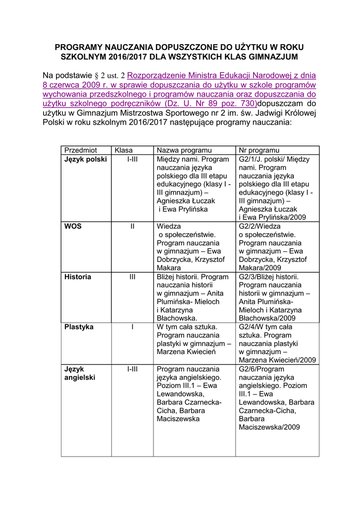 Programy nauczania - Gimnazjum nr 2 w Rybniku