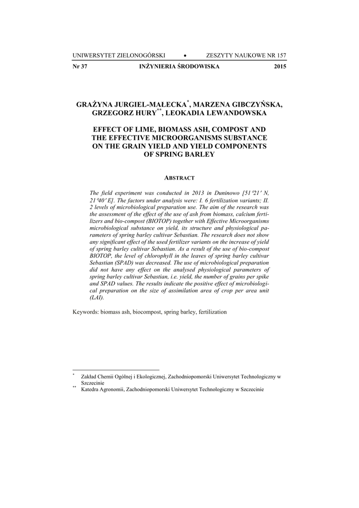 UNIWERSYTET ZIELONOGÓRSKI Nr 37 ZESZYTY NAUKOWE NR 157 INŻYNIERIA ŚRODOWISKA 2015 GRAŻYNA JURGIEL-MAŁECKA*, MARZENA GIBCZYŃSKA, GRZEGORZ HURY**, LEOKADIA LEWANDOWSKA EFFECT OF LIME, BIOMASS ASH, COMPOST AND THE EFFECTIVE MICROORGANISMS SUBSTANCE ON THE GRAIN YIELD AND YIELD COMPONENTS OF SPRING BARLEY ABSTRACT The field experiment was conducted in 2013 in Duninowo [51 21 N, 2140 E]. The factors under analysis were: I. 6 fertilization variants; II. 2 levels of microbiological preparation use. The aim of the research was the assessment of the effect of the use of ash from biomass, calcium fertilizers and bio-compost (BIOTOP) together with Effective Microorganisms microbiological substance on yield, its structure and physiological parameters of spring barley cultivar Sebastian. The research does not show any significant effect of the used fertilizer variants on the increase of yield of spring barley cultivar Sebastian. As a result of the use of bio-compost BIOTOP, the level of chlorophyll in the leaves of spring barley cultivar Sebastian (SPAD) was decreased. The use of microbiological preparation did not have any effect on the analysed physiological parameters of spring barley cultivar Sebastian, i.e. yield, the number of grains per spike and SPAD values. The results indicate the positive effect of microbiological preparation on the size of assimilation area of crop per area unit (LAI). Keywords: biomass ash, biocompost, spring barley, fertilization * ** Zakład Chemii Ogólnej i Ekologicznej, Zachodniopomorski Uniwersytet Technologiczny w Szczecinie Katedra Agronomii, Zachodniopomorski Uniwersytet Technologiczny w Szczecinie Effect of lime, biomass ash, compost … 27 INTRODUCTION The use of waste products is an effective way of limiting the need of storing these products. The content of waste products is varied and largely determined by numerous factors, such as assimilability of nutrients. Ash from biomass is to be treated as mineral material with significant content of biogenic elements. Regulation of the Minister of Environment of 5 April 2011 on R10 recovery process (Journal of Laws of 2011 No. 86, item 476), specifies the conditions of recovery by means of distribution on the surface of ground for soil fertilisation or enhancement. Biomass ash comprises fly ash from peat and untreated wood not subjected to chemical treatment, code 10 01 03. The use of ash is subject to conditions specified in the Regulation. Ash should be introduced to soil in which admissible values of substance concentration are not exceeded, as specified in the Regulation of the Minister of Environment of 9 September 2001 on soil and land quality standards (Journal of Laws of 2002 No. 165, item 1359). Bio-compost produced from organic waste is a source of organic material and, when combined with biomass ash, can be a valuable raw material for fertilisation purposes. According to Higa [2002], who was the first person to lay down the combination of microorganisms in preparation, broad spectrum of microorganisms in such preparations accelerate the mineralisation of organic mass, have antioxidant properties for the soil directly, and indirectly for the plant. The aim of the research was the assessment of the effect of biomass ash, calcium fertilizer and BIOTOP bio-compost together with microbiological preparation EM on yield, its structure and physiological parameters of spring barley – Sebastian cultivar. MATERIALS AND METHODS The experiment was carried out in 2013 in Duninowo [5121 N, 2140 E]. The factors under analysis included: I. factor of 6 fertilisation variants; II. 2 levels of EM preparation use (Table 1). Fertilisation with ash and bio-compost was done during spring cultivation. Spring barley – Sebastian cultivar was sown in the amount of 170 kg·ha-1 on 26 April 2013. Spraying with Pragma (25g·ha-1) herbicide and Soprano (0.4 dm3·ha-1) fungicide, as well as magnesium sulphate (VI) and manganese sulphate (VI) was done during vegetation period in the amount of 1kgha-1. Fertilization with nitrogen and sulphur amounted to 170 kg N and 25kg S per hectare. Spraying with microbiological preparation EM was done once, on 11 June 2013, in the amount of 40 dm3ha-1. In the variant where the preparation was not 28 G. Jurgiel-Małecka, M. Gibczyńska, G. Hury, L. Lewandowska used, the area was sprayed with water in the same amount. The pH of soil on which barley was grown was 7.1. During vegetation, the content of chlorophyll was determined with the use of photo-optical method using Minolta Spad 502 chlorophylo-meter in 10 measurements for each variant. Leaf area index (LAI) was determined using Ceptometer Accu Par in 5 measurements for each variant. Tab. 1. Variants of fertilizer Variant Fertilization 1 Control 2 Lime 3,0 tha-1 3 ash from biomass 1,5 tha-1 4 Lime 3,0 tha-1 + ash from biomass 1,5 tha-1 5 ash from biomass 1,5 tha-1 + Biotop compost 20 tha-1 Lime 3,0 tha-1 + ash from biomass 1,5 tha-1 + 6 Biotop compost 20 tha-1 The content of macrocomponents in soil in assimilable forms is to a large extent determined by the amount of precipitation which provides adequate moisture content especially during the vegetation period. The vegetation period of 2013 was assessed as moist due to precipitation in May and June which markedly exceeded the long-term average (www.ogimet.com). After harvesting, the yield and selected components of the yield were determined. The statistical analysis was done using the two-factor analysis of variance, and confidence half-intervals (LSD) were calculated using Tukey’s test. Statistica ver.10 software was used for the calculations. The lime fertiliser used in the experiment was a postcellulose lime fertiliser, variety 07, brand name PROFITKALK. The calcium content expressed as CaO was 39.2%. Characteristics of biomass ash The biomass ash used in this experiment was obtained from the combustion of wood material. The granulometric composition of ash was determined using the aero