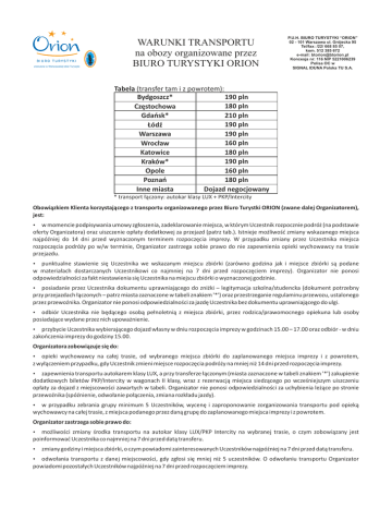 IZBA ST RY TU YKI WAR SZA W S KA C HA O F TO U W SA RISM W AR zrzeszone w Warszawskiej Izbie Turystyki WARUNKI TRANSPORTU na obozy organizowane przez BIURO TURYSTYKI ORION M BE R P.U.H. BIURO TURYSTYKI “ORION” 02 - 101 Warszawa ul. Grójecka 95 Tel/fax: /22/ 668 85 07, kom. 512 385 672 e-mail: [email protected] Koncesja nr: 116 NIP 5221006239 Polisa OC w SIGNAL IDUNA Polska TU S.A. Tabela (transfer tam i z powrotem): 190 pln Bydgoszcz* 180 pln Częstochowa 210 pln Gdańsk* 190 pln Łódź 190 pln Warszawa 160 pln Wrocław 180 pln Katowice 190 pln Kraków* 160 pln Opole 180 pln Poznań Dojazd negocjowany Inne miasta * transport łączony: autokar klasy LUX + PKP/Intercity Obowiązkiem Klienta korzystającego z transportu organizowanego przez Biuro Turystki ORION (zwane dalej Organizatorem), jest: w momencie podpisywania umowy zgłoszenia, zadeklarowanie miejsca, w którym Uczestnik rozpocznie podróż (na podstawie oferty Organizatora) oraz uiszczenie opłaty dodatkowej za przejazd (patrz tab.). Istnieje możliwość zmiany wskazanego miejsca najpóźniej do 14 dni przed wyznaczonym terminem rozpoczęcia imprezy. W przypadku zmiany przez Uczestnika miejsca rozpoczęcia podróży po w/w terminie, Organizator zastrzega sobie prawo do nie zapewnienia opieki wychowawcy na trasie przejazdu. punktualne stawienie się Uczestnika we wskazanym miejscu zbiórki (zarówno godzina jak i miejsce zbiórki są podane w materiałach dostarczanych Uczestnikowi co najmniej na 7 dni przed rozpoczęciem imprezy). Organizator nie ponosi odpowiedzialności za fakt niestawienia się Uczestnika na miejscu zbiórki o wyznaczonej godzinie. posiadanie przez Uczestnika dokumentu uprawniającego do zniżki – legitymacja szkolna/studencka (dokument potrzebny przy przejazdach łączonych – patrz miasta zaznaczone w tabeli znakiem '*') oraz przestrzeganie regulaminu przewozu, ustalonego przez przewoźnika. Organizator nie ponosi odpowiedzialności za jazdę Uczestnika bez dokumentu uprawniającego do ulgi. odbiór Uczestnika nie będącego osobą pełnoletnią z miejsca zbiórki, przez rodzica/prawomocnego opiekuna lub osoby posiadające wydane przez nich upoważnienie. przybycie Uczestnika wybierającego dojazd własny w dniu rozpoczęcia imprezy w godzinach 15.00 – 17.00 oraz odbiór - w dniu zakończenia imprezy do godziny 15.00. Organizatora zobowiązuje się do: opieki wychowawcy na całej trasie, od wybranego miejsca zbiórki do zaplanowanego miejsca imprezy i z powrotem, z wyłączeniem przypadku, gdy Uczestnik zmieni miejsce rozpoczęcia podróży na mniej niż 14 dni przed rozpoczęcia imprezy. zapewnienia transportu autokarem klasy LUX, a przy transferze łączonym (miasta zaznaczone w tabeli znakiem '*') zakupienie dodatkowych biletów PKP/Intercity w wagonach II klasy, wraz z rezerwacją miejsca siedzącego po wcześniejszym uiszczeniu opłaty za dojazd z miejscowości zawartych w tabeli. Organizator nie ponosi odpowiedzialności za uchybienia leżące po stronie przewoźnika (spóźnienie, odwołanie połączenia, zmiana rozkładu jazdy). w przypadku zebrania grupy minimum 5 Uczestników, wycenę i zaproponowanie zorganizowania transportu pod opieką wychowawcy na całej trasie, z miejsca podanego przez daną grupę do zaplanowanego miejsca imprezy i z powrotem. Organizator zastrzega sobie prawo do: możliwości zmiany środka transportu na autokar klasy LUX/PKP Intercity na wybranej trasie, o czym zobowiązany jest poinformować Uczestnika co najmniej na 7 dni przed datą transferu. zmiany godziny i miejsca zbiórki, o czym powiadomi zainteresowanych Uczestników najpóźniej na 7 dni przed datą transferu. odwołania transportu z danej miejscowości, gdy zgłosi się mniej niż 5 uczestników. O odwołaniu transportu Organizator powiadomi pozostałych Uczestników najpóźniej na 7 dni przed rozpoczęciem imprezy.