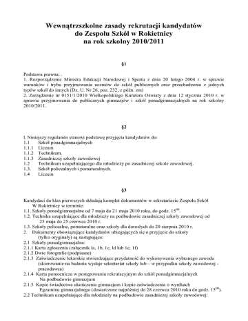Wewnątrzszkolne zasady rekrutacji kandydatów do Zespołu Szkół w Rokietnicy na rok szkolny 2010/2011 §1 Podstawa prawna: . 1. Rozporządzenie Ministra Edukacji Narodowej i Sportu z dnia 20 lutego 2004 r. w sprawie warunków i trybu przyjmowania uczniów do szkół publicznych oraz przechodzenia z jednych typów szkół do innych (Dz. U. Nr 26, poz. 232, z późn. zm) 2. Zarządzenie nr 0151/1/2010 Wielkopolskiego Kuratora Oświaty z dnia 12 stycznia 2010 r. w sprawie przyjmowania do publicznych gimnazjów i szkół ponadgimnazjalnych na rok szkolny 2010/2011. §2 l. Niniejszy regulamin stanowi podstawę przyjęcia kandydatów do: 1.1 Szkół ponadgimnazjalnych 1.1.1 Liceum 1.1.2 Technikum. 1.1.3 Zasadniczej szkoły zawodowej 1.2 Technikum uzupełniającego dla młodzieży po zasadniczej szkole zawodowej. 1.3. Szkół policealnych i pomaturalnych. 1.4 Liceum §3 Kandydaci do klas pierwszych składają komplet dokumentów w sekretariacie Zespołu Szkół W Rokietnicy w terminie: 1.1. Szkoły ponadgimnazjalne od 7 maja do 21 maja 2010 roku, do godz. 1500. 1.2. Technika uzupełniające dla młodzieży na podbudowie zasadniczej szkoły zawodowej od 25 maja do 25 czerwca 2010 r. 1.3. Szkoły policealne, pomaturalne oraz szkoły dla dorosłych do 20 sierpnia 2010 r. 2. Dokumenty obowiązujące kandydatów ubiegających się o przyjęcie do szkoły (tylko oryginały) są następujące: 2.1 Szkoły ponadgimnazjalne: 2.1.1 Karta zgłoszenia (załącznik la, 1b, 1c, ld lub 1e, 1f) 2.1.2 Dwie fotografie (podpisane) 2.1.3 Zaświadczenie lekarskie stwierdzające przydatność do wykonywania wybranego zawodu (skierowanie na badania wydaje sekretariat szkoły lub – w przypadku szkoły zawodowej pracodawca) 2.1.4 Karta pomocnicza w postępowaniu rekrutacyjnym do szkól ponadgimnazjalnych Na podbudowie gimnazjum 2.1.5 Kopie świadectwa ukończenia gimnazjum i kopie zaświadczenia o wynikach Egzaminu gimnazjalnego (dostarczone najpóźniej do 28 czerwca 2010 roku do godz. 1500). 2.2 Technikum uzupełniające dla młodzieży na podbudowie zasadniczej szkoły zawodowej: 2.2.1 Karta zgłoszenia (załącznik 2) 2.2.2 Dwie fotografie 2.2.3 Zaświadczenie lekarskie o braku przeciwwskazań zdrowotnych do kształcenia w Wybranym zawodzie (skierowanie wydaje sekretariat szkoły) 2.2.4 świadectwo ukończenia zasadniczej szkoły zawodowej (dostarczone najpóźniej do 26 czerwca 2010 r.) . 2.3 Szkoły policealne i pomaturalne: 2.3.1 kwestionariusz (załącznik 3) 2.3.2 świadectwo ukończenia szkoły średniej do 20 sierpnia 2010 r. 2.3.3 zaświadczenie lekarskie o braku przeciwwskazań zdrowotnych do kształcenia w wybranym zawodzie (wydaje sekretariat). 2.4 Szkoły dla dorosłych jw. do 20 sierpnia 2010 r. §4 Kandydat do szkoły ponadgimnazjalnej ma prawo zmienić decyzję o wyborze szkoły i składa dokumenty do ostatecznie wybranych szkół do dnia 16 czerwca 2010 r. do godz. 1500. §5 1. O przyjęciu kandydatów do klasy pierwszej szkoły ponadgimnazjalnej Zespołu Szkół w Rokietnicy decyduje Szkolna Komisja Rekrutacyjna, która przelicza na punkty oceny z przedmiotów i inne osiągnięcia kandydatów odnotowane na świadectwie ukończenia gimnazjum w sposób przyjęty na terenie Wielkopolski: L.p. 1. 2. 3. 4. 6. 7. 8. 9. Liczbowo określona średnia ocen (zaokrąglona do dwóch miejsc po przecinku) z sześciu przedmiotów ogólnokształcących, tj.: historii, wiedzy o społeczeństwie, biologii, geografii, fizyki i astronomii, chemii, technologii informacyjnej ( z wyłączeniem przedmiotu wskazanego w p. 4) x2 Świadectwo z wyróżnieniem Ocena z zachowania: wzorowe bardzo dobre Zasadnicza Szkoła Zawodowa – bez nagannego Osiągnięcia kandydata w kategoriach (załącznik nr 4): a) naukowe- udział w finale wojewódzkim konkursów 16 pkt. przedmiotowych organizowanych przez Kuratora Oświaty b) sportowe - na szczeblu ogólnopolskim (miejsca 1- 6) 6 pkt. - na szczeblu wojewódzkim (miejsca 1 - 3) 4 pkt. - na szczeblu powiatowym (miejsca 1- 3) 2 pkt. c) artystyczne - na szczeblu ogólnopolskim (miejsca 1 - 6) 6 pkt. - na szczeblu co najmniej wojewódzkim (miejsca 1- 3) 4 pkt. - na szczeblu powiatowym (miejsca 1-3) 2 pkt. d) inne – konkursy tematyczne: - organizowane na szczeblu ogólnopolskim (miejsca 1-6) 6 pkt. - organizowane na szczeblu wojewódzkim (miejsca 1-3) 4 pkt. Do punktacji wlicza się nie więcej niż 2 osiągnięcia - w tym max 2 w danej kategorii z zastrzeżeniem, że uwzględnia się najwyższe osiągnięcie absolwenta gimnazjum w danym konkursie i w danej dyscyplinie tylko jeden raz. Osiągnięcia kandydata dotyczące aktywności i działalności na Punktacja max 12 punktów max 12 punktów max 12 punktów Łącznie max 12 punktów max 12 punktów 5 punktów 5 punktów 3 punktów max 28 punkty 2 punkty Max 100 punktów 5. Przedmioty/ osiągnięcia na punkty Liczbowo określona ocena z języka polskiego x2 Liczbowo określona ocena z obowiązkowego języka obcego x 2 Liczbowo określona ocena z matematyki x2 Liczbowo określona ocena z przedmiotu wskazanego przez szkolną komisję rekrutacyjno – kwalifikacyjną: x2 1. Technikum w zawodzie: - technik hotelarstwa - geografia - technik informatyki - informatyka - technik ogrodnik - biologia - technik architektury krajobrazu - biologia - technik żywienia i gospodarstwa domowego - chemia - kucharz - chemia - technik mechanik - fizyka i astronomia - technik mechatronik - fizyka i astronomia 2. Liceum ogólnokształcące: - profil filmowy - historia - profil językowy - geografia 3. Zasadnicza Szkoła Zawodowa - fizyka i astronomia rzecz innych ludzi oraz środowiska (wolontariat, hospicjum) Egzamin gimnazjalny ∙ „część humanistyczna” max 50 punktów ∙ „część matematyczno- przyrodnicza” max 50 punktów MAKSYMALNA ILOŚĆ PUNKTÓW MOŻLIWYCH DO UZYSKANIA PRZEZ KANDYDATA Max 100 punktów 200 2. O przyjęciu kandydatów do klasy pierwszej technikum uzupełniającego dla młodzieży na podbudowie zasadniczej szkoły zawodow