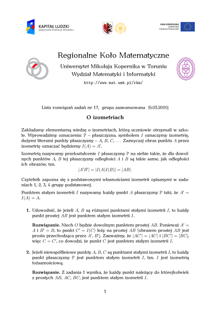 Regionalne Koło Matematyczne Uniwersytet Mikołaja Kopernika w Toruniu Wydział Matematyki i Informatyki http://www.mat.umk.pl/rkm/ Lista rozwiązań zadań nr 17, grupa zaawansowana (6.03.2010) O izometriach Zakładamy elementarną wiedzę o izometriach, którą uczniowie otrzymali w szkole. Wprowadzimy oznaczenia: P – płaszczyzna, symbolem I oznaczymy izometrię, dużymi literami punkty płaszczyzny – A, B, C, . . . Zazwyczaj obraz punktu A przez izometrię oznaczać będziemy I(A) = A′ . Izometrią nazywamy przekształcenie I płaszczyzny P na siebie takie, że dla dowolnych punktów A, B tej płaszczyzny odległości A i B są takie same, jak odległości ich obrazów, tzn. |A′ B ′ | = |I(A)I(B)| = |AB|. Czytelnik zapozna się z podstawowymi własnościami izometrii opisanymi w zadaniach 1, 2, 3, 4 grupy podstawowej. Punktem stałym izometrii I nazywamy każdy punkt A płaszczyzny P taki, że A′ = I(A) = A. 1. Udowodnić, że jeżeli A, B są różnymi punktami stałymi izometrii I, to każdy punkt prostej AB jest punktem stałym izometrii I. Rozwiązanie. Niech O będzie dowolnym punktem prostej AB. Ponieważ A′ = A i B ′ = B, to punkt C ′ = I(C) leży na prostej AB (obrazem prostej AB jest prosta przechodząca przez A′ , B ′ ). Zauważmy, że |AC ′ | = |AC| i |BC ′ | = |BC|, więc C = C ′ , co dowodzi, że punkt C jest punktem stałym izometrii I. 2. Jeżeli niewspółliniowe punkty A, B, C są punktami stałymi izometrii I, to każdy punkt płaszczyzny P jest punktem stałym izometrii I, tzn. I jest izometrią tożsamościową. Rozwiązanie. Z zadania 1 wynika, że każdy punkt należący do którejkolwiek z prostych AB, AC, BC, jest punktem stałym izometrii I. 1 C B A Niech X będzie punktem, który nie leży na żadnej z tych prostych. Przez X poprowadźmy prostą tak, by przecięła się ona z dwiema z tych prostych w różnych punktach. Wówczas każdy punkt poprowadzonej prostej jest stały, a więc X jest punktem stałym izometrii I. Wniosek. Zbiorami punktów stałych izometrii I mogą być jedynie: zbiór pusty (np. dla przesunięcia o wektor niezerowy), zbiór jednopunktowy (obrót o kąt niezerowy), prosta (np. dla symetrii osiowej), płaszczyzna (dla tożsamości). 3. Jeżeli dla pewnej trójki niewspółliniowych punktów A, B, C i pewnych izometrii I1 , I2 zachodzą równości I1 (A) = I2 (A) I1 (B) = I2 (B) I1 (C) = I2 (C), to I1 = I2 , tzn. I1 (X) = I2 (X) dla każdego punktu X z płaszczyzny P. Rozwiązanie. Rozważmy przekształcenie I2−1 ◦ I1 . Zauważmy, że jest ono izometrią oraz, że punkty A, B, C są jej punktami stałymi. Na mocy zadania 2 przekształcenie I2−1 ◦ I1 jest tożsamością (oznaczmy ją 1P ), tzn. I2−1 ◦ I1 = 1P . Stąd I2 = I2 ◦ 1P = I2 ◦ (I2−1 ◦ I1 ) = (I2 ◦ I2−1 ) ◦ I1 = 1P ◦ I1 = I1 , co należało udowodnić. W tym łańcuchu równości skorzystaliśmy z własności składania przekształceń. Wniosek. Każda izometria jest w pełni opisana przez swoje wartości na trójce niewspółliniowych punktów. Zajmiemy się opisem izometrii przy pomocy symetrii osiowych. 4. Jeśli punkty A, B, gdzie A 6= B, są punktami stałymi izometrii I, to I jest tożsamością lub symetrią osiową. Rozwiązanie. Niech I nie będzie tożsamością. Zatem istnieje punkt C taki, że C ′ = I(C) 6= C. Oczywiście punkt C nie leży na prostej AB (wszystkie 2 punkty tej prostej są punktami stałymi). Niech c będzie symetralną odcinka CC ′ . Ponieważ |AC ′ | = |AC| i |BC ′ | = |BC|, więc punkty A i B leżą na prostej c (każdy z nich ma tę samą odległość od C i C ′ ). Rozważmy izometrię Sc ◦ I, gdzie Sc oznacza symetrię osiową o osi c. Zauważmy, że (Sc ◦ I)(A) = Sc (I(A)) = Sc (A) = A (Sc ◦ I)(B) = Sc (I(B)) = Sc (B) = B (Sc ◦ I)(C) = Sc (I(C)) = Sc (C ′ ) = C, więc trójka niewspółliniowych punktów A, B, C to punkty stałe izometrii Sc ◦ I. Zatem izometria ta jest tożsamością, tzn. Sc ◦ I = 1P . Stąd Sc = Sc ◦ 1P = Sc ◦ (Sc ◦ I) = (Sc ◦ Sc ) ◦ I = 1P ◦ I = I, co kończy rozwiązanie zadania. 5. Jeżeli punkt A jest punktem stałym izometrii I, to I jest tożsamością lub symetrią osiową, lub złożeniem dwóch symetrii osiowych. Rozwiązanie. Niech I nie będzie tożsamością. Istnieje punkt B różny od A taki, że B ′ = I(B) 6= B. Niech b będzie symetralną odcinka BB ′ . Punkt A leży na symetralnej b. Rozważmy izometrię Sb ◦ I. Łatwo sprawdzamy, że punkty A i B są punktami stałymi izometrii Sb ◦ I. Zatem (zad. 4) mamy Sb ◦ I = 1P lub Sb ◦ I = Sc . Stąd łatwo uzyskujemy, że I = Sb lub I = Sb ◦ Sc , co kończy rozwiązanie. 6. Twierdzenie strukturalne o izometriach. Każda izometria jest tożsamością lub symetrią osiową, lub złożeniem dwóch bądź trzech symetrii osiowych. Rozwiązanie. Niech I będzie izometrią, która nie jest tożsamością. Wówczas istnieje punkt A taki, że A′ = I(A) =6= A. Niech a będzie symetralną odcinka AA′ . Rozważmy izometrię Sa ◦ I. Na mocy zadania 5 mamy Sa ◦ I = 1P lub Sa ◦ I = Sb , lub Sa ◦ I = Sb ◦ Sc . Stąd wyliczając I otrzymujemy I = Sa lub I = Sa ◦ Sb , lub I = Sa ◦ Sb ◦ Sc , co kończy rozwiązanie. 3 7. Czworokąt ABCD jest wpisany w okrąg. Niech K, L, M, N będą odpowiednio środkami boków AB, BC, CD, DA. Przez każdy z tych punktów prowadzimy prostą prostopadłą do przeciwległego boku. Pokazać, że proste te przecinają się w jednym punkcie. Rozwiązanie. Niech ABCD będzie czworokątem wpisanym w okrąg o środku O. Ponieważ K, L, M, N są środkami boków czworokąta ABCD, więc KLMN jest równoległobokiem. Niech P będzie punktem przecięcia przekątnych KM i LN. Przez SP oznaczmy symetrię środkową o środku P . Przez k, l, m, n oznaczmy proste, o których mowa w treści zadania. k C M D O L N P l K A B Zauważmy, że SP (K) = M i k ′ = SP (k) k k. Ponieważ k ⊥ CD, więc k ′ ⊥ CD. Ponadto M = SP (K) ∈ k ′ . Zat
