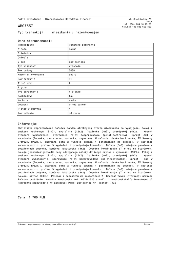 'Alfa Investment - Nieruchomości Doradztwo Finanse' WM07557 Typ transakcji: ul. Grudziądzka 79 Toruń tel. (56) 664 10 25/26 tel.kom +48 888 658 303 mieszkania / najem/wynajem Dane nieruchomości: Województwo kujawsko-pomorskie Miasto Toruń Dzielnica Osiedle Ulica Sobieskiego Typ własności własność Rok budowy 2008 Materiał wykonania cegła Powierzchnia 41 Ilość pokoi 2 Piętro 1 Typ ogrzewania miejskie Rozkładowe tak Kuchnia aneks Dodatki winda,balkon Pięter w budynku 4 Zasiedlenie od zaraz Informacje: Chciałabym zaprezentować Państwu bardzo atrakcyjną ofertę mieszkania do wynajęcia. Pokój z aneksem kuchennym (21m2), sypialnia (12m2), łazienka (4m2), przedpokój (4m2). Wysoki standard wykończenia, sterowanie rolet bezprzewodowe (pilot+centralka). Sprzęt AGD w zabudowie (lodówka, zamrażarka, kuchenka, zmywarka). W salonie deska barlinecka, TV Samsung 37’’, skórzana sofa z funkcją spania i pojemnikiem na pościel. W łazience wanna-prysznic, pralka. W sypialni i przedpokoju komandor. Balkon (6m2), miejsce garażowe w podziemiach budynku, komórka lokatorska (3m2). Dogodna lokalizacja (7 minut na Starówkę). Kaucja jednomiesięczna.Do ceny odstępnego należy doliczyć czynsz w wysokości 350PLN. Pokój z aneksem kuchennym (21m2), sypialnia (12m2), łazienka (4m2), przedpokój (4m2). Wysoki standard wykończenia, sterowanie rolet bezprzewodowe (pilot+centralka). Sprzęt agd w zabudowie (lodówka, zamrażarka, kuchenka, zmywarka). W salonie deska barlinecka, TV Samsung 37’’, skórzana sofa z funkcją spania i pojemnikiem na pościel. W łazience wanna-prysznic, pralka. W sypialni i przedpokoju komandor. Balkon (6m2), miejsce garażowe w podziemiach budynku, komórka lokatorska (3m2). Dogodna lokalizacja (7 minut na Starówkę). Kaucja, czynsz 350PLN. Polecam i zapraszam do prezentacji!!! Szczegółowych informacji udzielę Państwu osobiście. Natalia Nowakowska tel: 603641025 e-mail: [email protected] Pośrednik odpowiedzialny zawodowo: Paweł Dawidowicz nr licencji 7432 Cena: 1 700 PLN Dokument wygenerowany ze strony www.alfa-investment.pl Strona 1