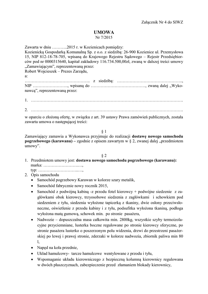 Załącznik Nr 4 do SIWZ UMOWA Nr 7/2015 Zawarta w dniu ………..2015 r. w Kozienicach pomiędzy: Kozienicką Gospodarką Komunalną Sp. z o.o. z siedzibą: 26-900 Kozienice ul. Przemysłowa 15, NIP 812-18-78-705, wpisaną do Krajowego Rejestru Sądowego – Rejestr Przedsiębiorców pod nr 0000315640, kapitał zakładowy 116.734.500,00zł, zwaną w dalszej treści umowy „Zamawiającym”, reprezentowaną przez: Robert Wojcieszek – Prezes Zarządu, a: ……………………………………….. z siedzibą: ……………………………………….., NIP ……………………., wpisaną do …………………………………, zwaną dalej „Wykonawcą”, reprezentowaną przez: 1. ………………………………………………………………………………………………. 2. ………………………………………………………………………………………………. w oparciu o złożoną ofertę, w związku z art. 39 ustawy Prawa zamówień publicznych, została zawarta umowa o następującej treści: §1 Zamawiający zamawia a Wykonawca przyjmuje do realizacji dostawę nowego samochodu pogrzebowego (karawanu) – zgodnie z opisem zawartym w § 2, zwanej dalej „przedmiotem umowy”. §2 1. Przedmiotem umowy jest: dostawa nowego samochodu pogrzebowego (karawanu): marka: …………………….…, typ: ………………………..…, 2. Opis samochodu Samochód pogrzebowy Karawan w kolorze szary metalik, Samochód fabrycznie nowy rocznik 2015, Samochód z podwójną kabiną -z przodu fotel kierowcy + podwójne siedzenie z zagłówkami obok kierowcy, trzyosobowe siedzenia z zagłówkami i schowkiem pod siedzeniem z tyłu, siedzenia wyłożone tapicerką z tkaniny, dwie osłony przeciwsłoneczne, oświetlenie z przodu kabiny i z tyłu, podsufitka wyłożona tkaniną, podłoga wyłożona matą gumową, schowek min. po stronie pasażera, Nadwozie – dopuszczalna masa całkowita min. 2800kg, wszystkie szyby termoizolacyjne przyciemniane, lusterka boczne regulowane po stronie kierowcy sferyczne, po stronie pasażera lusterko o poszerzonym polu widzenia, drzwi do przestrzeni pasażerskiej po lewej i prawej stronie, zderzaki w kolorze nadwozia, zbiornik paliwa min 80 l, Napęd na koła przednie, Układ hamulcowy- tarcze hamulcowe wentylowane z przodu i tyłu, Wspomaganie układu kierowniczego z bezpieczną kolumną kierownicy regulowana w dwóch płaszczyznach, zabezpieczenie przed złamaniem blokady kierownicy, Koła min 16”- koła zimowe na obręczach stalowych z mini kołpakami, opony letnie na alufelgach, pełnowymiarowe koło zapasowe, Silnik 2,0 TDI min 114 KM (84kW), normy spalania min. EURO 5 Skrzynia biegów min. 5 biegowa, Min. Wyposażenie - radio, min 2 głośniki, antena, prędkościomierz z licznikiem kilometrów i licznikiem przebiegu dziennego, obrotomierz, zegar cyfrowy, 2 kluczyki, lampki zaciągniętego hamulca ręcznego, awarii układu hamulcowego i poziomu płynu hamulcowego, min 1 gniazdo 12V,podświetlenie tablicy rozdzielczej, sygnał dźwiękowy informujący o niewyłączonych światłach, wycieraczki szyby przedniej z regulacją prędkości i spryskiwaczem, klimatyzacja, ogrzewanie kabiny kierowcy z mechaniczna regulacja, narzędzia i podnośnik do zmiany kół, gaśnica, trójkąt, Wyposażenie w systemy bezpieczeństwa min.- ESP, ABS, ASR, EDS, MSR, min. dwie poduszki dla kierowcy i pasażera, światła do jazdy dziennej włączane automatycznie, bezwładnościowe trójpunktowe pasy bezpieczeństwa, z napinaczami i regulacją możliwości zamocowania ( dla zew. foteli w kabinie kierowcy), szyba przednia klejona, reflektory przednie halogenowe, sygnalizacja awaryjnego hamowania, kierunkowskazy boczne, 2 światła cofania, światła przeciwmgielne przód i tył, immobiliser, czujniki cofania, centralny zamek, Zabudowa - wymiary przedziału trumiennego całkowicie przeszklonego min. długość 2250mm, szerokość 1550mm, wysokość 1150mm ,wyposażenie: ściany i sufit zmywalne wykonane z laminatu, wózek do trumny wysuwany poza gabaryty samochodu pokryty blachą nierdzewną gładką, pasy transportowe ściągające trumnę min 2 szt., podłoga zmywalna laminowana ze schowkiem podłogowym, naroża podłogi pokryte blachą nierdzewną gładką, 4 punktowe oświetlenie halogenowe, wentylacja wyciągowa wymuszona, płyty zasłonowe pokryte od środka materiałem zmywalnym od strony szyby materiał ozdobny 3 szt., relingi dachowe, ornamenty, wieszaki na wieńce lakierowany zderzak w kolorze nadwozia, lakier metalik, atest higieniczny, homologacja. §3 1. Wykonawca zobowiązuje się na własny koszt dostarczyć przedmiot umowy do Zamawiającego. 2. Przekazanie przedmiotu umowy nastąpi w siedzibie Zamawiającego w godzinach 715 w dni robocze. Wykonawca zobowiązany jest poinformować Zamawiającego o terminie przekazania, co najmniej 3 dni robocze przed planowanym terminem. 3. Wykonawca na dostarczony przedmiot umowy, dostarczy wszystkie wymagane prawem dokumenty, gwarancje w języku polskim. §4 Za dostarczony przedmiot umowy Zamawiający zapłaci Wykonawcy wynagrodzenie umowne brutto: ………………………...; słownie: …………………………………………................ §5 Wymagany termin realizacji przedmiotu umowy – do dnia 30.06.2015 r. §6 1. Wynagrodzenie za przedmiot umowy uregulowane będzie na podstawie faktury wystawionej po bezusterkowym odbiorze przedmiotu umowy. 2 2. Zapłata nastąpi przelewem z konta Zamawiającego na konto Wykonawcy podane w fakturze za dostarczony przedmiot umowy w ciągu 30 dni od otrzymania faktury, po podpisaniu bezusterkowego protokołu odbioru przedmiotu umowy. 3. Za termin zapłaty strony przyjmują datę obciążenia rachunku bankowego Zamawiającego. §7 1. W razie niewykonania lub nienależytego wykonania umowy Wykonawca zapłaci Zamawiającemu kary umowne: a. za zwłokę w dostawie przedmiotu umowy – w wysokości 0,5% wynagrodzenia umownego b