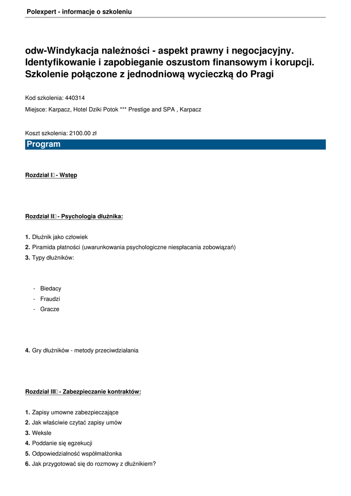 Polexpert - informacje o szkoleniu odw-Windykacja należności - aspekt prawny i negocjacyjny. Identyfikowanie i zapobieganie oszustom finansowym i korupcji. Szkolenie połączone z jednodniową wycieczką do Pragi Kod szkolenia: 440314 Miejsce: Karpacz, Hotel Dziki Potok *** Prestige and SPA , Karpacz Koszt szkolenia: 2100.00 zł Program Rozdział I - Wstęp Rozdział II - Psychologia dłużnika: 1. Dłużnik jako człowiek 2. Piramida płatności (uwarunkowania psychologiczne niespłacania zobowiązań) 3. Typy dłużników: - Biedacy - Fraudzi - Gracze 4. Gry dłużników - metody przeciwdziałania Rozdział III - Zabezpieczanie kontraktów: 1. Zapisy umowne zabezpieczające 2. Jak właściwie czytać zapisy umów 3. Weksle 4. Poddanie się egzekucji 5. Odpowiedzialność współmałżonka 6. Jak przygotować się do rozmowy z dłużnikiem? Polexpert - informacje o szkoleniu Rozdział IV - Nagrywanie rozmów - aspekty prawne Rozdział V - Proces windykacji: 1. Podstawy prawne windykacji należności 2. Kiedy zacząć windykować 3. Windykacja własna 4. Windykacja przez podmioty trzecie: kancelarie, firmy windykacyjne 5. Procedury 6. Wybór drogi kontaktu 7. Jak rozmawiać? 8. Negocjacje 9. Antymanipulacja 10. Wezwania do zapłaty 11. Zagrożenie sankcjami 12. Konsekwencja 13. Wprowadzanie sankcji (plan, piramida, odcięcie mediów) 14. Uznanie długu 15. Ugoda + 777 KPC 16. Przerwanie biegu przedawnienia 17. Prawidłowe przetwarzanie informacji 18. Kompensata 19. Cesja wierzytelności 20. Postępowanie egzekucyjne - podstawowe wiadomości 21. Podstawowe błędy popełniane przy pisaniu wniosków egzekucyjnych 22. Obowiązek zwrotu kosztów postępowania windykacyjnego 23. Błędy podczas windykacji - humorystycznie o "wpadkach" windykatorów i dłużników Rozdział VI - Trudny dłużnik Sposoby radzenia sobie z sytuacjami trudnymi, jakie mogą zdarzyć się w pracy windykatora. Kontr natarcie (groźby, wyzwiska, krytyka) - to na szczęście niewielki procent dłużników. Próbują zastraszyć, lub wręcz zastraszają kontrahentów. Bardzo częstą formą jest tutaj krytyka wszystkiego, straszenie mediami lub powoływanie się na "wpływowe znajomości". Zostaną przedstawione sposoby radzenia sobie z takimi dłużnikami. Rozdział VII - Ujawnienie zadłużenia Polexpert - informacje o szkoleniu Jak zgodnie z prawem ujawnić na zewnątrz zadłużenie dłużnika bez narażania się na ustawę o ochronie danych osobowych. Rozdział VIII - Przestępstwa gospodarcze: 1. Pojęcie, definicje i problematyka (w tym psychologiczna) przestępstw gospodarczych; 2. Oszustwa gospodarcze; 3. Fałszerstwa; 4. Przestępstwa przeciwko wierzycielom w polskim prawie karnym; 5. Metodyka oszustw mających na celu wprowadzenie w błąd kontrahenta; 6. Korupcja Prowadzący