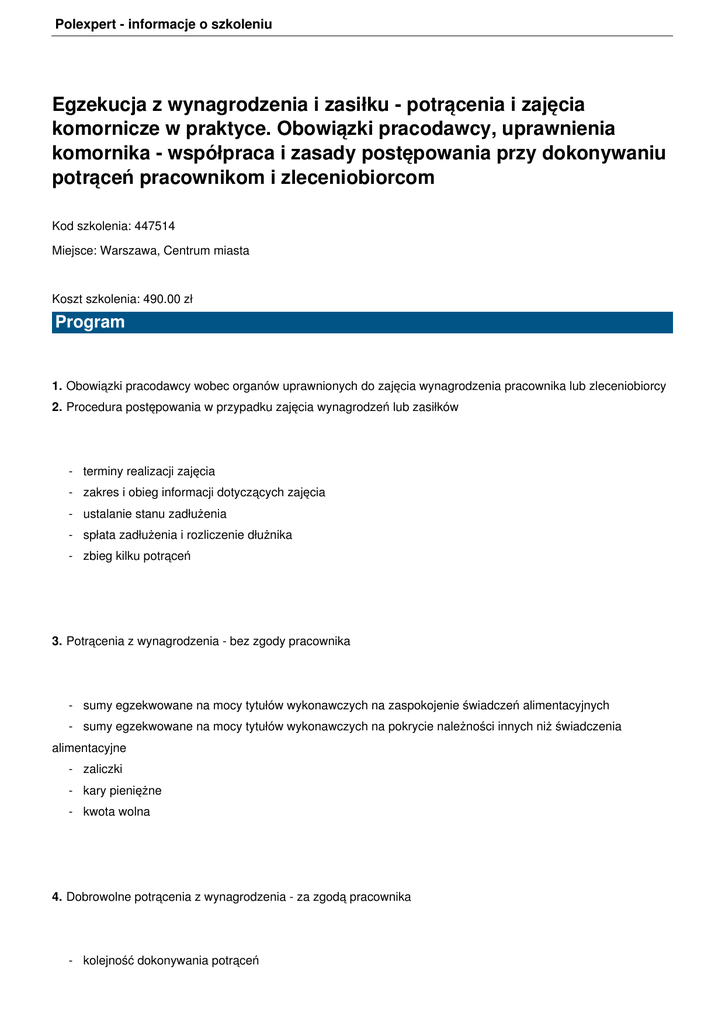 Polexpert - informacje o szkoleniu Egzekucja z wynagrodzenia i zasiłku - potrącenia i zajęcia komornicze w praktyce. Obowiązki pracodawcy, uprawnienia komornika - współpraca i zasady postępowania przy dokonywaniu potrąceń pracownikom i zleceniobiorcom Kod szkolenia: 447514 Miejsce: Warszawa, Centrum miasta Koszt szkolenia: 490.00 zł Program 1. Obowiązki pracodawcy wobec organów uprawnionych do zajęcia wynagrodzenia pracownika lub zleceniobiorcy 2. Procedura postępowania w przypadku zajęcia wynagrodzeń lub zasiłków - terminy realizacji zajęcia - zakres i obieg informacji dotyczących zajęcia - ustalanie stanu zadłużenia - spłata zadłużenia i rozliczenie dłużnika - zbieg kilku potrąceń 3. Potrącenia z wynagrodzenia - bez zgody pracownika - sumy egzekwowane na mocy tytułów wykonawczych na zaspokojenie świadczeń alimentacyjnych - sumy egzekwowane na mocy tytułów wykonawczych na pokrycie należności innych niż świadczenia alimentacyjne - zaliczki - kary pieniężne - kwota wolna 4. Dobrowolne potrącenia z wynagrodzenia - za zgodą pracownika - kolejność dokonywania potrąceń Polexpert - informacje o szkoleniu - kwota wolna 5. Różnice, które należy uwzględniać, gdy dokonujemy potrącenia: - z wynagrodzenia - z zasiłku - z wynagrodzenia i zasiłku w jednym miesiącu 6. Zbieg egzekucji sądowej i administracyjnej 7. Potrącenia z listy płac dla byłego pracownika 8. Potrącenia z umów cywilno-prawnych 9. Nowelizacja kodeksu postępowania cywilnego - czyli 2000 zł kary dla pracodawcy w praktyce 10. Sesja odpowiedzi na pytania uczestników szkolenia. Prowadzący