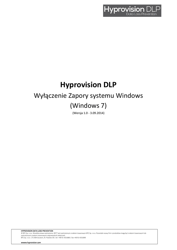 Hyprovision DLP Wyłączenie Zapory systemu Windows (Windows 7) (Wersja 1.0 - 3.09.2014) HYPROVISION DATA LOSS PREVENTION © BTC Sp. z o.o. Wszelkie prawa zastrzeżone. BTC® jest zastrzeżonym znakiem towarowym BTC Sp. z o.o. Pozostałe nazwy firm i produktów mogą być znakami towarowymi lub zastrzeżonymi znakami towarowymi odpowiednich właścicieli. BTC Sp. z o.o. |71-064 Szczecin, Al. Piastów 30 | tel. +48 91 4331880 | fax +48 91 4331890 wwww.hyprovision.com Wyłączenie Zapory systemu Windows wymaga wykonania poniższych kroków: 1) 2) 3) 4) Uruchomienia polecenia „firewall.cpl”. Kliknięcia w link „Włącz lub wyłącz Zaporę systemu” w oknie „Zapora systemu Windows”. Zaznaczenia pól „Wyłącz zaporę systemu Windows (niezalecane)”. Kliknięciu w przycisk „OK” w oknie „Dostosuj ustawienia”. HYPROVISION DATA LOSS PREVENTION © BTC Sp. z o.o. Wszelkie prawa zastrzeżone. BTC® jest zastrzeżonym znakiem towarowym BTC Sp. z o.o. Pozostałe nazwy firm i produktów mogą być znakami towarowymi lub zastrzeżonymi znakami towarowymi odpowiednich właścicieli. BTC Sp. z o.o. |71-064 Szczecin, Al. Piastów 30 | tel. +48 91 4331880 | fax +48 91 4331890 wwww.hyprovision.com HYPROVISION DATA LOSS PREVENTION © BTC Sp. z o.o. Wszelkie prawa zastrzeżone. BTC® jest zastrzeżonym znakiem towarowym BTC Sp. z o.o. Pozostałe nazwy firm i produktów mogą być znakami towarowymi lub zastrzeżonymi znakami towarowymi odpowiednich właścicieli. BTC Sp. z o.o. |71-064 Szczecin, Al. Piastów 30 | tel. +48 91 4331880 | fax +48 91 4331890 wwww.hyprovision.com