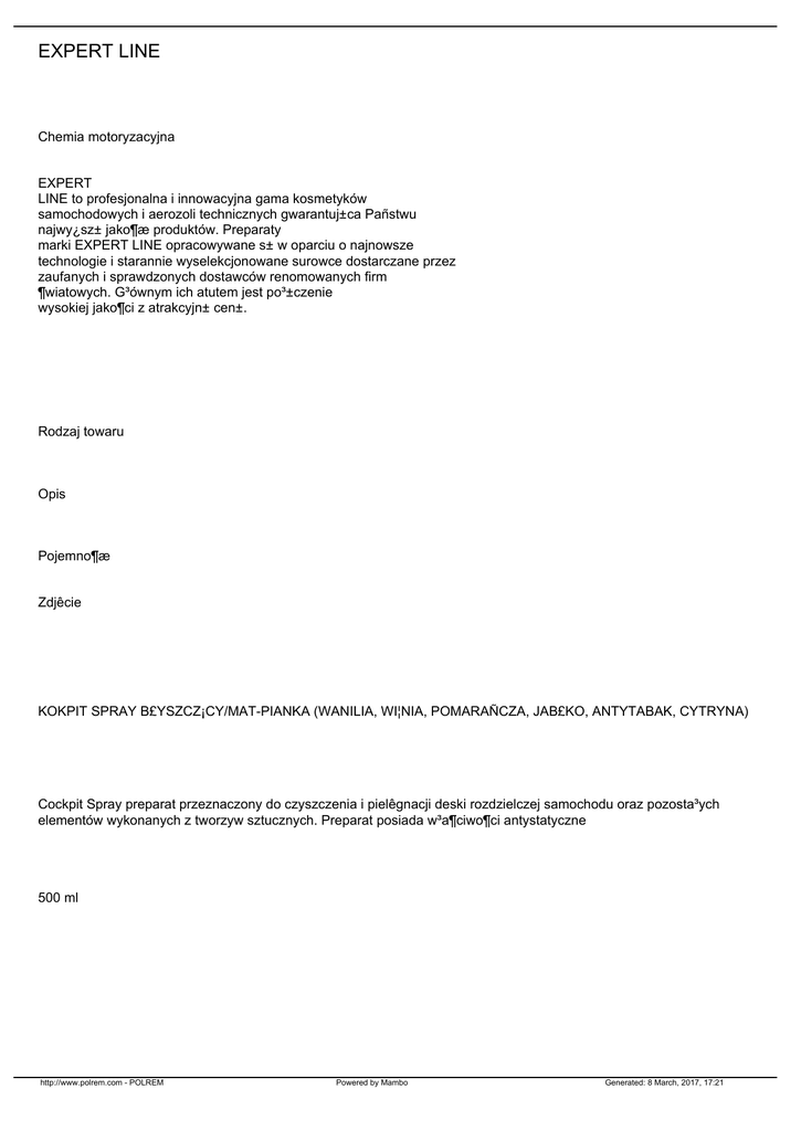 EXPERT LINE Chemia motoryzacyjna EXPERT LINE to profesjonalna i innowacyjna gama kosmetyków samochodowych i aerozoli technicznych gwarantuj±ca Pañstwu najwy¿sz± jako¶æ produktów. Preparaty marki EXPERT LINE opracowywane s± w oparciu o najnowsze technologie i starannie wyselekcjonowane surowce dostarczane przez zaufanych i sprawdzonych dostawców renomowanych firm ¶wiatowych. G³ównym ich atutem jest po³±czenie wysokiej jako¶ci z atrakcyjn± cen±. Rodzaj towaru Opis Pojemno¶æ Zdjêcie KOKPIT SPRAY B£YSZCZ¡CY/MAT-PIANKA (WANILIA, WI¦NIA, POMARAÑCZA, JAB£KO, ANTYTABAK, CYTRYNA) Cockpit Spray preparat przeznaczony do czyszczenia i pielêgnacji deski rozdzielczej samochodu oraz pozosta³ych elementów wykonanych z tworzyw sztucznych. Preparat posiada w³a¶ciwo¶ci antystatyczne 500 ml http://www.polrem.com - POLREM Powered by Mambo Generated: 8 March, 2017, 17:21 PENETRATOR VX-50 Najwy¿szej jako¶ci preparat w aerozolu o silnych w³a¶ciwo¶ciach: czyszcz±cych, odt³uszczaj±cych, penetruj±cych i luzuj±cych. Wypiera wodê z powierzchni metalowych; rozpuszcza smary, usuwa olej, pozostawia na powierzchni warstwê ochronn±, penetruje i poluzowuje ¶ruby, nakrêtki, linki i inne z³±cza. 400ml SUPERPENETRATOR MoS2 Specjalistyczny preparat aerozolowy o bardzo silnych w³a¶ciwo¶ciach penetruj±cych i smarnych. ¦rodek wnika g³êboko, czy¶ci, smaruje, oraz zabezpiecza powierzchnie przed ponownym zatarciem. Dziêki silnym w³a¶ciwo¶ci± smarnym doskonale poluzowywuje zakleszczone po³±czenia, zmniejszaj±c przy tym tarcie oraz likwiduj±c skrzypienie, piski w pracuj±cych mechanizmach. 400 ml 150 ml PIANKA DO TAPICERKI Delikatny i skuteczny preparat w postaci wydajnej pianki. Przeznaczony do czyszczenia tapicerki samochodowej, stosowany bez u¿ycia wody. Czy¶ci, odnawia powierzchnie tapicerskie. Pianka wnika g³êboko w tkaninê, wydobywa kurz oraz zanieczyszczenia, przywraca pierwotny kolor i wygl±d materia³u. Sk³adniki ochronne pianki zabezpieczaj± tkaninê przed ponownym szybkim zabrudzeniem. Posiada przyjemny zapach. 400 ml http://www.polrem.com - POLREM Powered by Mambo Generated: 8 March, 2017, 17:21 MOTOR CLEANER Aerozol przeznaczony do czyszczenia korpusu silnika samochodowego. Preparat do mycia silników czy¶ci powierzchnie, wnika w szczeliny, wyp³ukuje zanieczyszczenia organiczne (zwêglenia, osady i t³uszcze) pozostawiaj±c pow³okê zapobiegaj±c± szybkiemu ponownemu osadzaniu zanieczyszczeñ. Usuwaj±c zanieczyszczenia z silnika podnosi jego sprawno¶æ, opó¼nia proces rdzewienia. Odpowiedni do czyszczenia silników samochodów osobowych, ciê¿arowych, motocykli, ³odzi motorowych oraz zmechanizowanego sprzêtu ogrodniczego. Nie wymaga u¿ywania aparatów ci¶nieniowych, aparatów parowych. 400 ml PREPARAT DO SZYB Pianka do mycia wszelkich powierzchni szklanych: szyb, luster, p³ytek, porcelany, powierzchni chromowanych, lakierowanych i ze stali nierdzewnej. Z ³atwo¶ci± usuwa wszelkie zanieczyszczenia: kurz, t³uste naloty, osad z dymu papierosowego, zanieczyszczenia przemys³owe i drogowe, zaschniête owady. Pozostawia przyjemny zapach w czyszczonych pomieszczeniach. 400 ml PREPARAT DO SZYB Produkt o podwójnym dzia³aniu: czy¶ci oraz konserwuje opony. Tworzy trwa³± wodoodporn± pow³okê, zmniejsza przyczepno¶æ kurzu oraz pog³êbia barwê czarnych, plastikowych elementów karoserii. Uelastycznia gumê chroni±c j± przed starzeniem, pêkaniem i warunkami atmosferycznymi. Zapewnia piêkny po³ysk, nie wymaga szorowania. http://www.polrem.com - POLREM Powered by Mambo Generated: 8 March, 2017, 17:21 400 ml ODMRA¯ACZ Odmra¿acz do szyb usuwa oblodzenia z powierzchni szklanych (szyb samochodowych, lusterek, szyb reflektorów) oraz piór wycieraczek, klamek, zamków itp. Dzia³a nawet przy bardzo niskich temperaturach. Rozpuszczalny w wodzie, nie powoduj±cy zagro¿enia dla ¶rodowiska. Nie uszkadza lakieru. 400 ml PREPARAT DO USZCZELEK Niezwykle skuteczny ¶rodek o potrójnym dzia³aniu czy¶ci, o¿ywia i konserwuje ka¿dego rodzaju powierzchnie gumowe, w tym opony, uszczelki, listwy gumowe. W ci±gu kilku minut przywraca czyszczonym powierzchniom naturalny po³ysk, zabezpiecza je przed dzia³aniem kurzu, brudu i soli. Dziêki starannie dobranej recepturze preparat zabezpiecza powierzchniê przed dzia³aniem czynników atmosferycznych oraz przyspieszonym procesom starzenia powsta³ym na skutek promieniowania UV. Preparat zalecany zw³aszcza do stosowania zim± celem zapobiegania zamarzaniu uszczelek w drzwiach. 400 ml PREPARAT DO KLIMATYZACJI http://www.polrem.com - POLREM Powered by Mambo Generated: 8 March, 2017, 17:21 Preparat jest ¶rodkiem do oczyszczania i od¶wie¿ania klimatyzacji samochodowej, uk³adów wentylacyjnych oraz nawiewów. Oparty jest na komponentach o dzia³aniu przeciwbakteryjnym – usuwa bakterie Legionella pneumophila. Nie zawiera kwa¶nych dodatków. ¶rodek jest bezpieczny dla takich materia³ów jak: tworzywa sztuczne, metale, pow³oki lakierowane. Zalety: Eliminuje bakterie Legionella pneumophila. Od¶wie¿a oraz zapobiega powtórnemu powstawaniu nieprzyjemnego zapachu. 400 ml 750 ml PREPARAT DO HAMULCÓW Preparat aerozolowy przeznaczony do czyszczenia uk³adów hamulcowych, sprzêgie³, ³añcuchów, czê¶ci maszyn oraz wszelkiego rodzaju powierzchni wymagaj±cych odt³uszczenia. Doskonale usuwa t³uste zabrudzenia, naloty, kurz i brud. Forma aerozolu pozwala na wnikanie preparatu w szczeliny i trudno dostêpne miejsca. Preparat nie zawiera acetonu oraz chloro i fluoropochodnych. 400 ml SILIKON SPRAY ¦rodek smaruj±cy powsta³y na bazie olejów silikonowych o wszechstronnym zastosowaniu, przydatny zarówno w warunkach domowych, jak i warsztatach (samochodowych, rowerowych i innych). Preparat chroni przed mrozem, korozj±, starzeniem czê¶ci plastikowych i gumowych. Doskona³y ¶rodek smarny do rowerów, czê¶ci uk³adów mechanicznych, narzêdzi, niezast±piony w samochodzie. Produkt z ³atwo¶ci± 