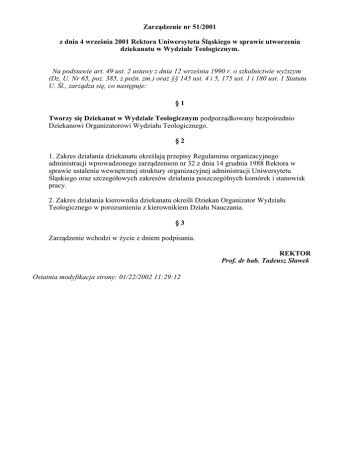 Zarządzenie nr 51/2001 z dnia 4 września 2001 Rektora Uniwersytetu Śląskiego w sprawie utworzenia dziekanatu w Wydziale Teologicznym. Na podstawie art. 49 ust. 2 ustawy z dnia 12 września 1990 r. o szkolnictwie wyższym (Dz. U. Nr 65, poz. 385, z poźn. zm.) oraz §§ 145 ust. 4 i 5, 175 ust. 1 i 180 ust. 1 Statutu U. Śl., zarządza się, co następuje: §1 Tworzy się Dziekanat w Wydziale Teologicznym podporządkowany bezpośrednio Dziekanowi Organizatorowi Wydziału Teologicznego. §2 1. Zakres działania dziekanatu określają przepisy Regulaminu organizacyjnego administracji wprowadzonego zarządzeniem nr 32 z dnia 14 grudnia 1988 Rektora w sprawie ustalenia wewnętrznej struktury organizacyjnej administracji Uniwersytetu Śląskiego oraz szczegółowych zakresów działania poszczególnych komórek i stanowisk pracy. 2. Zakres działania kierownika dziekanatu określi Dziekan Organizator Wydziału Teologicznego w porozumieniu z kierownikiem Działu Nauczania. §3 Zarządzenie wchodzi w życie z dniem podpisania. REKTOR Prof. dr hab. Tadeusz Sławek Ostatnia modyfikacja strony: 01/22/2002 11:29:12
