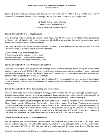 Formacja Wspólna 2016 – Studium Ewangelii Św. Mateusza K10. Rozdział 10 Zapraszaj Ducha Świętego każdego dnia. Poproś, aby otworzył ciebie na Słowo Boże, a także aby otworzył przed tobą Słowo Boże. Poproś Ducha Świętego, aby był przy tobie i prowadził cię każdego dnia. „O Duchu Święty - natchnij mnie, Miłości Boża - pochłoń mnie. Na właściwą drogę zaprowadź mnie.” Dzień 1. Rozważ Mt 10, 1-4; Wybór Jezusa Jezus powołuje swoich uczniów po imieniu. Jezus wzywa nas po imieniu, bowiem nasze imiona są zapisane w Niebie. I tak, jak dawniej, tak i teraz poucza nas, udziela błogosławieństwa i traktuje, jak matka swe dzieci wchodzące dopiero w życie - prowadzi za rękę. Czy czuję się powołany, by być uczniem Jezusa? Czy wiem, że On powołuje mnie pomimo moich braków i niedoskonałości, a nie dzięki moim mocnym stronom? „Jezus siłą mą, Jezus pieśnią mego życia. Królem wiecznym On, niepojęty w mocy swej. W Nim znalazłem to, czego szukałem do dzisiaj. Sam mi podał dłoń, bym zwyciężał w każdy dzień.” Dzień 2. Rozważ Mt 10, 5-16; Wskazówki dla uczniów „Nie idźcie do pogan i nie wstępujcie do żadnego miasta samarytańskiego. Idźcie raczej do owiec, które poginęły z domu Izraela” (Mt 10, 5-6). Jezus tymi słowami wyjaśnia nam, iż nasze powołanie ma się realizować tam, gdzie jesteśmy – w naszym codziennym życiu, wśród naszych bliskich. Nie wysyła nas z dala od domu. On oczekuje naszego apostolstwa w życiu codziennym. Jezu, najtrudniej jest nam głosić Ciebie w naszych rodzinach. Ty jednak pragniesz tego, abyśmy byli w naszych domach światłem. Daj nam mądrość i odwagę, by nawet wtedy, gdy pojawią się trudności, niestrudzenie głosić Twoje Imię. Dzień 3. Rozważ Mt 10, 17-23; Ostrzeżenie przed trudnościami W wielu państwach na świecie chrześcijan dotykają prześladowania, aż do bezpośredniego zagrożenia życia. W Polsce szatan działa inaczej - wyśmiewa przykazania Boga, prawdy Boże, wiarę, Kościół. W odpowiedzi na to, naszą postawą powinno być właśnie wzmożone życie prawdami Bożymi i łaską uświęcającą. Otrzymaliśmy wszystko, co jest niezbędne do walki z szatanem – tylko zapominamy o tym i nie bronimy się. Mamy Krzyż i zdroje Miłosierdzia, Eucharystię – żywe Ciało i żywą Krew Boga. Posiadamy przykazania i pouczenie w Piśmie Świętym, które jest żywym Słowem Boga i źródłem poznania prawdy. Mamy dostęp do Sakramentów świętych. Posiadamy także modlitwę – tej potrzeba najwięcej. To wszystko jest naszą bronią i tarczą. Kiedy korzystamy z tych środków, zwyciężamy w walce ze złem. Gdy z nich rezygnujemy – upadamy pokonani. Nad wszystkim zaś ma królować w naszych sercach miłość. Ona zwycięża wszystko. Dzień 4. Rozważ Mt 10, 24-33; Męstwo w ucisku Aby być mężnym, gdy nadchodzi ucisk, potrzebujemy cnoty męstwa. Aby ją posiadać, trzeba o nią prosić. Sami z siebie jesteśmy bojaźliwi i tchórzliwi. Nie posiadamy męstwa w sobie. Jezus jest naszym męstwem. On mówi nam: „Nie bójcie się” (Mt 10, 28). Aby być mężnym, trzeba zaprosić do swego serca Jezusa. Bóg daje nam Materiały formacyjne Wspólnoty Effatha przy parafii Wieczerzy Pańskiej w Lublinie; www.effatha-lublin.pl zapewnienie o Swojej nieustannej opiece nad każdym z nas. Dla Niego jesteśmy tak bardzo cenni, że nawet nasze włosy na głowie są policzone. Jezus zna moje serce i zawsze jest gotów podarować mi swoje zbawienie, uciszyć każdą burzę, przezwyciężyć każdy niepokój Swoim pokojem. Czy jednak jestem gotów otworzyć przed Nim swoje serce, stanąć przed Nim w szczerości i prawdziwie przyjąć to, co On mi daje? Dzień 5. Rozważ Mt 10, 34-39; Za Jezusem lub przeciw Niemu Bóg nie godzi się na to, by być na końcu hierarchii naszych wartości. Bóg zawsze powinien być pierwszy. On chce być jedynym Panem naszego życia – „Nie będziesz miał cudzych bogów obok Mnie!” (Wj 20, 3). Bóg pragnie, byśmy Go kochali miłością niepodzielną, całkowitą – całym sercem, całym wnętrzem, całą duszą, całym umysłem, całym życiem. Prawdziwa miłość oddaje wszystko, nie zatrzymuje niczego dla siebie. „Jeżeli Bóg jest na pierwszym miejscu, wszystko jest na właściwym miejscu” – mawiał św. Augustyn. Gdy przyjmujemy drogę Jezusa, napotykamy krzyż. Jednak gdy go podejmujemy z Jezusem, to doświadczenie prowadzi nas do prawdziwej, bezinteresownej miłości. Budzi i podnosi do nowego życia. Dzień 6. Rozważ Mt 10, 40-32; Nagroda za oddanie się Jezusowi „Kto was przyjmuje, Mnie przyjmuje” (Mt 10, 40). Czy to nie wspaniałe słowa, w których Jezus tak wyraźnie utożsamia się z każdym z nas? Jak wielka musi być miłość, żeby do tego stopnia związać się z drugą osobą. Jezus utożsamia się z tobą. Jezus pragnie ci powiedzieć: „Dziecko, Ja kocham ciebie. Zaprosiłeś Mnie do swego serca, abym w nim królował. W zamian pragnę ci ofiarować dar, jakiego nie otrzymasz od nikogo z ludzi. Nadaję ci Moją godność, królewską godność dziecka Bożego. Ja mieszkam w tobie, a więc wszystko, co twoje do Mnie należy. Jakkolwiek będą ciebie traktować - i Ja to odczuję. Bo ty i Ja jesteśmy jedno. Nie posyłam ciebie bez zapewnienia ci Swjej opieki. Nie posyłam ciebie bez pouczenia i przestróg na drogę. Nie posyłam ciebie samego, bezbronnego na pożarcie wilkom. Posyłam ciebie jako Moje dziecko, jako Mego dziedzica, świadka Mojej miłości, szafarza Mego miłosierdzia. To nie wszystko. Jeśli zapraszasz Mnie do serca, idę z tobą. Kto ciebie przyjmuje, Mnie przyjmuje. Cokolwiek tobie czyni, Mnie czyni. Czymkolwiek ciebie obdarza, Mnie obdarza. Jeśli jest to dobro – i Ja tego dobra doświadczam. Jeśli zło, to i Ja jego zaznaję”. Niech z naszych serc popłynie pieśń wdzięczności. Niech Bóg błogosławi nas na trud drogi. "Duchu Święty, Miłości Prawdziwa, [prosz