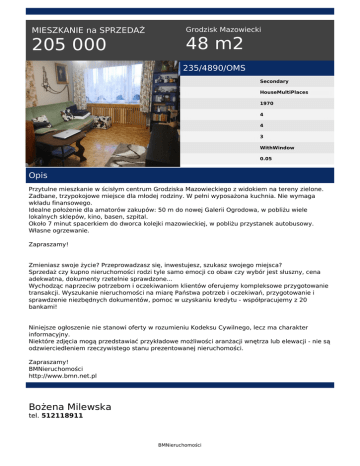 MIESZKANIE na SPRZEDAŻ 205 000 Grodzisk Mazowiecki 48 m2 235/4890/OMS Secondary HouseMultiPlaces 1970 4 4 3 WithWindow 0.05 Opis Przytulne mieszkanie w ścisłym centrum Grodziska Mazowieckiego z widokiem na tereny zielone. Zadbane, trzypokojowe miejsce dla młodej rodziny. W pełni wyposażona kuchnia. Nie wymaga wkładu finansowego. Idealne położenie dla amatorów zakupów: 50 m do nowej Galerii Ogrodowa, w pobliżu wiele lokalnych sklepów, kino, basen, szpital. Około 7 minut spacerkiem do dworca kolejki mazowieckiej, w pobliżu przystanek autobusowy. Własne ogrzewanie. Zapraszamy! Zmieniasz swoje życie? Przeprowadzasz się, inwestujesz, szukasz swojego miejsca? Sprzedaż czy kupno nieruchomości rodzi tyle samo emocji co obaw czy wybór jest słuszny, cena adekwatna, dokumenty rzetelnie sprawdzone... Wychodząc naprzeciw potrzebom i oczekiwaniom klientów oferujemy kompleksowe przygotowanie transakcji. Wyszukanie nieruchomości na miarę Państwa potrzeb i oczekiwań, przygotowanie i sprawdzenie niezbędnych dokumentów, pomoc w uzyskaniu kredytu - współpracujemy z 20 bankami! Niniejsze ogłoszenie nie stanowi oferty w rozumieniu Kodeksu Cywilnego, lecz ma charakter informacyjny. Niektóre zdjęcia mogą przedstawiać przykładowe możliwości aranżacji wnętrza lub elewacji - nie są odzwierciedleniem rzeczywistego stanu prezentowanej nieruchomości. Zapraszamy! BMNieruchomości http://www.bmn.net.pl Bożena Milewska tel. 512118911 BMNieruchomości tel. 22 3337383 email: [email protected] BMNieruchomości Powered by TCPDF (www.tcpdf.org)