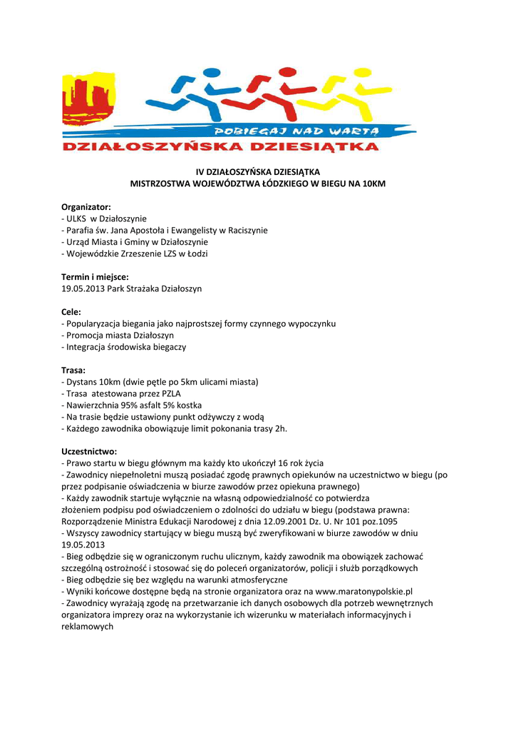 IV DZIAŁOSZYŃSKA DZIESIĄTKA MISTRZOSTWA WOJEWÓDZTWA ŁÓDZKIEGO W BIEGU NA 10KM Organizator: - ULKS w Działoszynie - Parafia św. Jana Apostoła i Ewangelisty w Raciszynie - Urząd Miasta i Gminy w Działoszynie - Wojewódzkie Zrzeszenie LZS w Łodzi Termin i miejsce: 19.05.2013 Park Strażaka Działoszyn Cele: - Popularyzacja biegania jako najprostszej formy czynnego wypoczynku - Promocja miasta Działoszyn - Integracja środowiska biegaczy Trasa: - Dystans 10km (dwie pętle po 5km ulicami miasta) - Trasa atestowana przez PZLA - Nawierzchnia 95% asfalt 5% kostka - Na trasie będzie ustawiony punkt odżywczy z wodą - Każdego zawodnika obowiązuje limit pokonania trasy 2h. Uczestnictwo: - Prawo startu w biegu głównym ma każdy kto ukończył 16 rok życia - Zawodnicy niepełnoletni muszą posiadać zgodę prawnych opiekunów na uczestnictwo w biegu (po przez podpisanie oświadczenia w biurze zawodów przez opiekuna prawnego) - Każdy zawodnik startuje wyłącznie na własną odpowiedzialność co potwierdza złożeniem podpisu pod oświadczeniem o zdolności do udziału w biegu (podstawa prawna: Rozporządzenie Ministra Edukacji Narodowej z dnia 12.09.2001 Dz. U. Nr 101 poz.1095 - Wszyscy zawodnicy startujący w biegu muszą być zweryfikowani w biurze zawodów w dniu 19.05.2013 - Bieg odbędzie się w ograniczonym ruchu ulicznym, każdy zawodnik ma obowiązek zachować szczególną ostrożność i stosować się do poleceń organizatorów, policji i służb porządkowych - Bieg odbędzie się bez względu na warunki atmosferyczne - Wyniki końcowe dostępne będą na stronie organizatora oraz na www.maratonypolskie.pl - Zawodnicy wyrażają zgodę na przetwarzanie ich danych osobowych dla potrzeb wewnętrznych organizatora imprezy oraz na wykorzystanie ich wizerunku w materiałach informacyjnych i reklamowych Zgłoszenia: - Zgłoszenia przyjmowane są poprzez wypełnienie formularza zgłoszeniowego dostępnego na stronie www.maratonypolskie.pl lub na stronie organizatora do dnia 15.05.2013 lub w dniu 19.5.2013 w biurze zawodów. Od dnia 16.05.2013 do 18.05.2013 organizator nie przyjmuje zgłoszeń. - Za zgłoszenie uważa się wypełnienie formularza zgłoszeniowego i uiszczenie opłaty Startowej -Opłata startowa obowiązuje zawodników startujących w biegu głównym oraz uczestników Nordic Walking. - Każdy z uczestników biegu ma obowiązek sprawdzenia przed biegiem czy jest umieszczony na liście startowej. - Od zgłaszających się do dnia 15.05.2012r pobiera się opłatę startową w wysokości 30,- zł - Opłata startowa dla uczestników w wieku 65 lat i starszych wynosi 15zł - decyduje rok urodzenia. Wpłatę należy kierować na konto organizatora: Parafia Katolicka św. Jana Apostoła i Ewangelisty w Raciszynie, Raciszyn ul. Ogrodowa 2a, 98-355 Działoszyn konto 05 9251 0009 0000 0345 2000 0030 Tytuł wpłaty: Działoszyńska Dziesiątka. Przy wpłacie proszę podać nazwisko zawodnika za którego ma wpłynąć zapłata. W tytule wpłaty należy wpisać: Opłata startowa oraz imię i nazwisko uczestnika. W przypadku wpłat zbiorowych należy wpisać imiona i nazwiska wszystkich uczestników biegu, za których dokonywana jest opłata startowa. Po 19.05.2013 wpłaty będą przyjmowane w dniu zawodów w wysokości 50zł. Informacja o uiszczeniu opłaty startowej pojawi się na liście zgłoszeń najpóźniej w ciągu 7 dni od dnia wpłaty. W ramach opłaty startowej uczestnicy biegu głównego oraz Nordic Walking otrzymują numer startowy wraz z agrafkami, poczęstunek po biegu za okazaniem numeru startowego, wodę mineralną na trasie i po biegu. Pierwszych 300 uczestników otrzyma pamiątkowy medal. Dodatkowo pierwszych 300 uczestników, którzy dokonają zgłoszenia i uiszczą opłatę startową oraz zostaną zweryfikowani w biurze zawodów otrzyma koszulkę techniczną. Lista pierwszych 300 uczestników zostanie opublikowana na stronie internetowej organizatora. Możliwość wyboru rozmiaru koszulki jest ograniczona liczbą koszulek dostępnych w danym rozmiarze. W zakresie wyboru rozmiaru koszulki decyduje kolejność zgłoszenia się w celu weryfikacji w biurze zawodów. Program zawodów: 10.30 Otwarcie biura zawodów- Park Strażaka 13.00 Biegi dla dzieci i młodzieży 14.00 Start Nordic Walking 15.00 Dekoracja zwycięzców w biegach dzieci i młodzieży 15.30 Zamknięcie biura zawodów 15.30 Start do biegu VIPów 15.50 Powitanie zawodników na linii startu 16.00 Start biegu głównego 17.15 Dekoracja zwycięzców Nordic Walking 17.30 Wręczenie nagród w klasyfikacji generalnej kobiet i mężczyzn 18.00 Wręczenie nagród zwycięzcą w pozostałych klasyfikacjach i losowanie upominków Kategorie wiekowe kobiet i mężczyzn: Mężczyźni M16 16-19 lat (1997-1994) M20 20-29 lat (1993-1984) M30 30-39 lat (1983-1974) M40 40-49 lat (1973-1964) M50 50-59 lat (1963-1954) M60 60-69 lat (1953-1944) M70 70 lat i więcej (1943 i starsi) Kobiety K16 16-29 lat (1997-1984) K30 30-39 lat (1983-1974) K40 40-49 lat (1973-1964) K50 50 lat i więcej (1963 i starsze) Klasyfikacja wiekowa Nordic Walking M. M. 16-39 lat 40 lat i więcej K. K. 16-39 lat 40 i więcej O przynależności do klasyfikacji wiekowych decyduje rok urodzenia. Nagrody: Nagrody pieniężne otrzymają osoby zajmujące kolejno miejsca od 1 do 6 w klasyfikacji wśród kobiet i mężczyzn. Zdobywcom nagród pieniężnych zostanie potrącony podatek dochodowy zgodnie z obowiązującymi przepisami. Po dekoracji zawodnik ma obowiązek złożenia podpisu na liście nagród w strefie podium oraz wypełnienia stosownego oświadczenia. W poszczególnych kategoriach wiekowych kobiet i mężczyzn za miejsca od 1 do 3 zostaną rozdane nagrody rzeczowe Zawodnicy nagradzani w kategorii generalnej nie będą nagradzani w kategoriach wiekowych. W Klasyfikacji Mistrzostw Województwa Łódzkiego nagrody rzeczowe bądź finansowe. W Klasyfikacji Nordic Walking przewidziane są nagrody rzeczowe bądź pieniężne Dodatkowo upominki