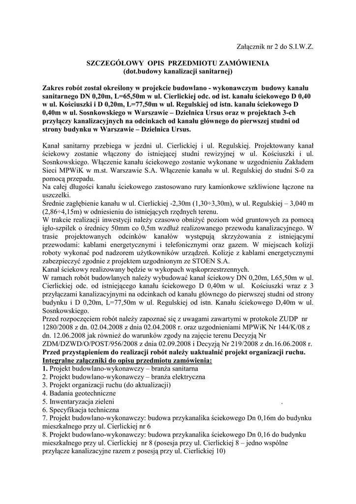 Załącznik nr 2 do S.I.W.Z. SZCZEGÓŁOWY OPIS PRZEDMIOTU ZAMÓWIENIA (dot.budowy kanalizacji sanitarnej) Zakres robót został określony w projekcie budowlano - wykonawczym budowy kanału sanitarnego DN 0,20m, L=65,50m w ul. Cierlickiej odc. od ist. kanału ściekowego D 0,40 w ul. Kościuszki i D 0,20m, L=77,50m w ul. Regulskiej od istn. kanału ściekowego D 0,40m w ul. Sosnkowskiego w Warszawie – Dzielnica Ursus oraz w projektach 3-ch przyłączy kanalizacyjnych na odcinkach od kanału głównego do pierwszej studni od strony budynku w Warszawie – Dzielnica Ursus. Kanał sanitarny przebiega w jezdni ul. Cierlickiej i ul. Regulskiej. Projektowany kanał ściekowy zostanie włączony do istniejącej studni rewizyjnej w ul. Kościuszki i ul. Sosnkowskiego. Włączenie kanału ściekowego zostanie wykonane w uzgodnieniu Zakładem Sieci MPWiK w m.st. Warszawie S.A. Włączenie kanału w ul. Regulskiej do studni S-0 za pomocą przepadu. Na całej długości kanału ściekowego zastosowano rury kamionkowe szkliwione łączone na uszczelki. Średnie zagłębienie kanału w ul. Cierlickiej -2,30m (1,30÷3,30m), w ul. Regulskiej – 3,040 m (2,86÷4,15m) w odniesieniu do istniejących rzędnych terenu. W trakcie realizacji inwestycji naleŜy czasowo obniŜyć poziom wód gruntowych za pomocą igło-szpilek o średnicy 50mm co 0,5m wzdłuŜ realizowanego przewodu kanalizacyjnego. W trasie projektowanych odcinków kanałów występują skrzyŜowania z istniejącymi przewodami: kablami energetycznymi i telefonicznymi oraz gazem. W miejscach kolizji roboty wykonać pod nadzorem uŜytkowników urządzeń. Kolizje z kablami energetycznymi zabezpieczyć zgodnie z projektem uzgodnionym ze STOEN S.A. Kanał ściekowy realizowany będzie w wykopach wąskoprzestrzennych. W ramach robót budowlanych naleŜy wybudować kanał ściekowy DN 0,20m, L65,50m w ul. Cierlickiej odc. od istniejącego kanału ściekowego D 0,40m w ul. Kościuszki wraz z 3 przyłączami kanalizacyjnymi na odcinkach od kanału głównego do pierwszej studni od strony budynku i D 0,20m, L=77,50m w ul. Regulskiej od istn. Kanału ściekowego D,40m w ul. Sosnkowskiego. Przed rozpoczęciem robót naleŜy zapoznać się z uwagami zawartymi w protokole ZUDP nr 1280/2008 z dn. 02.04.2008 z dnia 02.04.2008 r. oraz uzgodnieniami MPWiK Nr 144/K/08 z dn. 12.06.2008 jak równieŜ do warunków zgody na zajęcie terenu Decyzją Nr ZDM/DZWD/O/POST/956/2008 z dnia 02.09.2008 i Decyzją Nr 219/2008 z dn.16.06.2008 r. Przed przystąpieniem do realizacji robót naleŜy uaktualnić projekt organizacji ruchu. Integralne załączniki do opisu przedmiotu zamówienia: 1. Projekt budowlano-wykonawczy – branŜa sanitarna 2. Projekt budowlano-wykonawczy – branŜa elektryczna 3. Projekt organizacji ruchu (do aktualizacji) 4. Badania geotechniczne 5. Inwentaryzacja zieleni . 6. Specyfikacja techniczna 7. Projekt budowlano-wykonawczy: budowa przykanalika ściekowego Dn 0,16m do budynku mieszkalnego przy ul. Cierlickiej nr 6 8. Projekt budowlano-wykonawczy: budowa przykanalika ściekowego Dn 0,16 do budynku mieszkalnego przy ul. Cierlickiej nr 8 (posesja przy ul. Cierlickiej 8 – jedno wspólne przyłącze kanalizacyjne razem z posesją przy ul. Cierlickiej 10) 8. Projekt budowlano-wykonawczy: budowa przykanalika ściekowego Dn 0,16m do budynku mieszkalnego przy ul. Cierlickiej nr 17 DO SZCZEGÓŁOWEGO OPISU PRZEDMIOTU ZAMÓWIENIA ZAŁĄCZONO: 1. Pozwolenie na budowę – Decyzja nr 252/A/2008 z dn. 28 października 2008 wydana przez Prezydenta m.st. Warszawy (jako załącznik nr 2a do niniejszego opisu przedmiotu zamówienia). 2. Prawo dysponowania terenem – Decyzja nr ZDM/DZWD/O/POST/959/2008 z dnia 02.09.2008 r (jako załącznik nr 2b do niniejszego opisu przedmiotu zamówienia). 3. Prawo dysponowania terenem – Decyzja nr 219/2008 z dnia 16.06.2008 r (jako załącznik nr 2c do niniejszego opisu przedmiotu zamówienia). PRZYKANALIKI. ROZLICZENIE WYKONANYCH PRZYKANALIKÓW NASTĄPI KOSZTORYSEM POWYKONAWCZYM: Projekt budowlano wykonawczy przykanalika Dn 0,16 m do budynku Cierlicka nr 6 Projekt budowlano wykonawczy przykanalika Dn 0,16 m do budynku Cierlicka nr 8 Projekt budowlano wykonawczy przykanalika Dn 0,16 m do budynku Cierlicka nr 17 SPOSÓB OBLICZENIA CENY: Zamawiający zastrzega, Ŝe Wykonawca określając wynagrodzenie za wykonanie 3 przyłączy kanalizacyjnych, o których mowa w Formularzu ofertowym (stanowiącym załącznik nr 3 do S.I.W.Z.): a/ nie moŜe wskazać wartości wyŜszej od wartości 28.127,12 złotych (netto). b/ nie moŜe wykazać wartości wyŜszych od wartości cen jednostkowych podanych dla poszczególnych rodzajów robót w oparciu o tabelę umieszczoną poniŜej: „Zestawienie cen jednostkowych” LP 1 2 3 4 5 6 7 Rodzaj robót Przyłącze Przyłącze Przyłącze Studnia z kręgów Studnia z kręgów Studnia z kręgów Studnia WAVIN nawierzchnia Jezdnia ziemna Kostka Asfalt Jezdnia ziemna Kostka Asfalt Bez nawierzchni J.m. 1 mb 1 mb 1 mb 1 szt. 1 szt. 1 szt. 1 szt. Cena jedn. zł netto 357,26 432,81 554,74 3052,95 3390,21 3857,71 1924,74