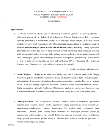 SCENARIUSZ 29 PAŹDZIERNIKA 2015 WALKA W OBRONIE POLSKICH DÓBR KULTURY PODCZAS II WOJNY ŚWIATOWEJ BOGURODZICA Agata Przybysz 1. II Wojna Światowa obecna jest w zbiorowej wyobraźni głównie za sprawą obrazów i informacji pisemnych o bohaterskich żołnierzach Państwa Podziemnego, którzy na różne sposoby prowadzili z okupantami walkę: a to realizując akcje zbrojne, a to przy użyciu środków dywersyjnych i sabotażowych. Nie wolno jednak zapominać o równie heroicznym trudzie podejmowanym przez przedstawicieli świata kultury i oświaty, którzy wprawdzie prowadzili swą walkę bez broni w ręku, lecz dokonywali rzeczy nie mniej ważnych. Chcemy dziś przypomnieć walkę w obronie dóbr kultury barbarzyńsko i systematycznie niszczonych albo rabowanych przez hitlerowskiego okupanta. Szczególnie powinniśmy przypominać o tym w roku obecnym, który na mocy uchwał Sejmu RP z 14 grudnia 2014 r jest też Rokiem Jana Długosza – a więc rokiem szacunku dla historii. 2. [slajd z Archiwum Akt Dawnych] 3. Julia Chlibiuk Wciąż trudno oszacować skalę strat, jakich doznało podczas II Wojny Światowej polskie dziedzictwo narodowe. Bodaj najdramatyczniejsza była sytuacja książek i dokumentów. Stworzone z nietrwałego, łatwopalnego materiału – płonęły. Były też wywożone do III Rzeszy i ulegały zaginięciu tysiącami.. Pierwsze straty przyniósł wrzesień 1939 r., kiedy doszczętnie spłonęło Archiwum Oświecenia, częściowo Archiwum Skarbowe oraz Centralna Biblioteka Wojskowa zawierająca bezcenne zbiory dotyczące polskiej emigracji. 4. Maciej Rękawek Już od początku okupacji Polacy starali się skupować i gromadzić najcenniejsze książki i dzieła sztuki, organizować zręby podziemnego życia kulturalnego: organizować antykwariaty i witryny wydawnicze. Na nauczanie.. wielką skale prowadzić tajne Ratując jedną książkę może ratowano dla przyszłych pokoleń jedyny jej egzemplarz, podtrzymując w ten sposób kulturową ciągłość i pamięć, która wielokrotnie uległa jednak przerwaniu. Polska walka w obronie dóbr kultury trwała od początku II Wojny Światowej do jej końca. . SF7740 + 1 5. [slajd z zaginionymi obrazami] 6. Kasia Nowakowska Przez cały ten okres trwał oczywiście również systematyczny proces wywożenia najcenniejszych dóbr kultury do III Rzeszy.. Tylko z Archiwum Głównego i Archiwum Akt Nowych wywieziono ok. 10 ogromnych wagonów archiwaliów, konfiskując bądź niszcząc dokumenty, często średniowiecznego pochodzenia, które nie posiadały swoich kopii. Do dziś wiedza o tym, co było w nich zapisane, jest wiedzą utraconą. 7. Szymon Wiśniewski Najtrudniejszy moment nastąpił jednak wraz z wybuchem Powstania Warszawskiego. Niemal całkowitej zagładzie uległy wtedy zbiory Biblioteki Krasińskich oraz archiwa: Główne: Akt Dawnych, Akt Nowych, Miejskie oraz Skarbowe. Wraz z nimi bezpowrotnej zatracie uległa ogromna liczba najstarszych i najważniejszych dla polskiego dziedzictwa kulturowego dokumentów. Części archiwów - dodajmy - nie strawił ogień w trakcie walk, lecz planowe podpalenia prowadzone przez hitlerowskiego okupanta już po upadku Powstania. 8. [slajd z portretami] 9. Patryk Szymanik Straty dóbr kultury, których doznała Polska w latach 1939-1945, były wynikiem zarówno działań militarnych – bombardowania i ostrzału kościołów, pałaców, muzeów czy bibliotek – jak i grabieży dokonywanych przez oddziały wojskowe, administrację okupanta, zdemoralizowanych maruderów ciągnących za armią, a również przez miejscowych rabusiów korzystających z wojennego zamętu. 10. Damian Szwarc Na zniszczenia spowodowane działaniami wojennymi ziemie II Rzeczypospolitej były narażone kilkakrotnie.. Najpierw w 1939 r., od 1 września po agresji wojsk III Rzeszy , a od 17 września – Armii Czerwonej. Potem od 22 czerwca 1941 r., gdy Niemcy ruszyli na ZSRR. Kolejny raz od lata 1944 r. do maja 1945 r., gdy siły III Rzeszy wycofywały się pod naporem Armii Czerwonej i polskich oddziałów.. 11. Agata Przybysz W 1939 r. wojska III Rzeszy , nie napotykając w miastach większego oporu, zdobywały je bez bombardowań i nie dokonując poważniejszych zniszczeń (również nie rujnując budowli zabytkowych). Wyjątkiem była Warszawa, która broniła się prawie miesiąc, a bombardowania i ostrzał artyleryjski spowodowały zniszczenie miasta obejmujące do 40% zabudowy. Wtedy to znacznie ucierpiała Biblioteka Ordynacji Zamojskiej, spłonął gmach, a wraz SF7740 + 2 z nim zbiory Centralnej Biblioteki Wojskowej; taki sam los spotkał Bibliotekę Ordynacji Przeździeckich. Wkroczenie Armii Czerwonej na wschodnie ziemie polskie nie spowodowało większych zniszczeń materialnych – Polacy oddali zaatakowane ziemie właściwie bez oporu militarnego. 12. Kasia Zielińska Po zakończeniu działań wojennych w 1939 r. okupant hitlerowski podzielił zajęte przez siebie terytorium Polski na dwie części: Generalne Gubernatorstwo (GG) i ziemie wcielone do III Rzeszy. 13. Bartek Przyłucki W GG, którego powstanie z rozkazu Adolfa Hitlera proklamował Hans Frank 26 października 1939 r., znalazły się miasta będące centrami polskiej kultury: Warszawa, Kraków, a od sierpnia 1941 r. także Lwów. Tuż po zajęciu Polski działalność okupanta dotycząca dóbr kultury nie była uregulowana, a kompetencje poszczególnych służb cywilnych czy policyjnych nie zostały ustalone. Panowało generalne przekonanie, że są to dobra bezpańskie, którymi można dowolnie dysponować. W zasadzie nie zajmował się nimi Wehrmacht. Dobrami kultury zainteresowali się jego pojedynczy funkcjonariusze, jak i całe formacje SS czy policji. 14. Bartosz Bazydło Obrazy czy choćby wyroby rzemiosła artystycznego wynosili urzędnicy, policja i funkcjonariusze SS, często do dekoracji swoich biur lub prywatnych mieszkań. Bezkarnie rozkradano dobra żydowskie. Przedmioty zrabowane w getcie przeważnie stawały się 